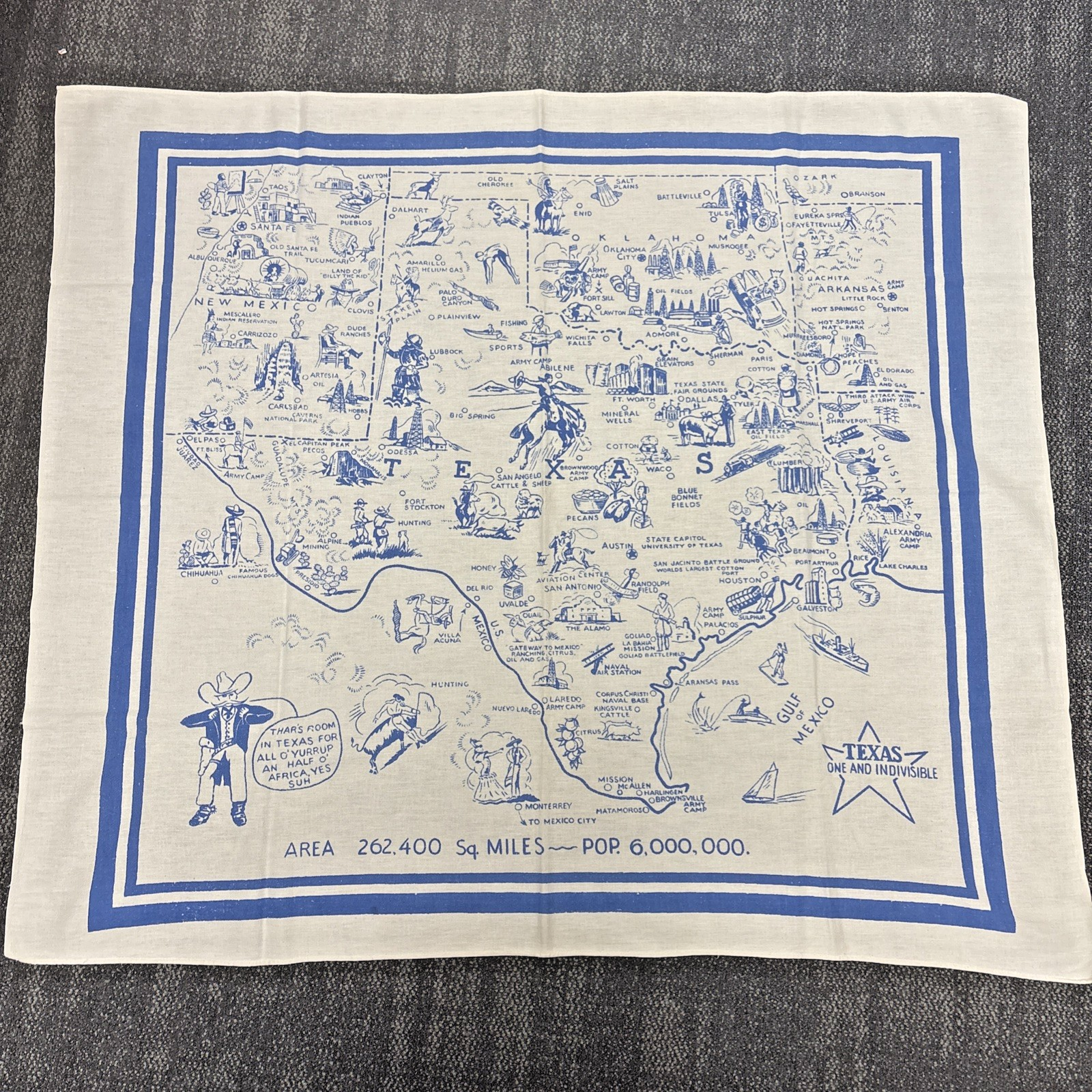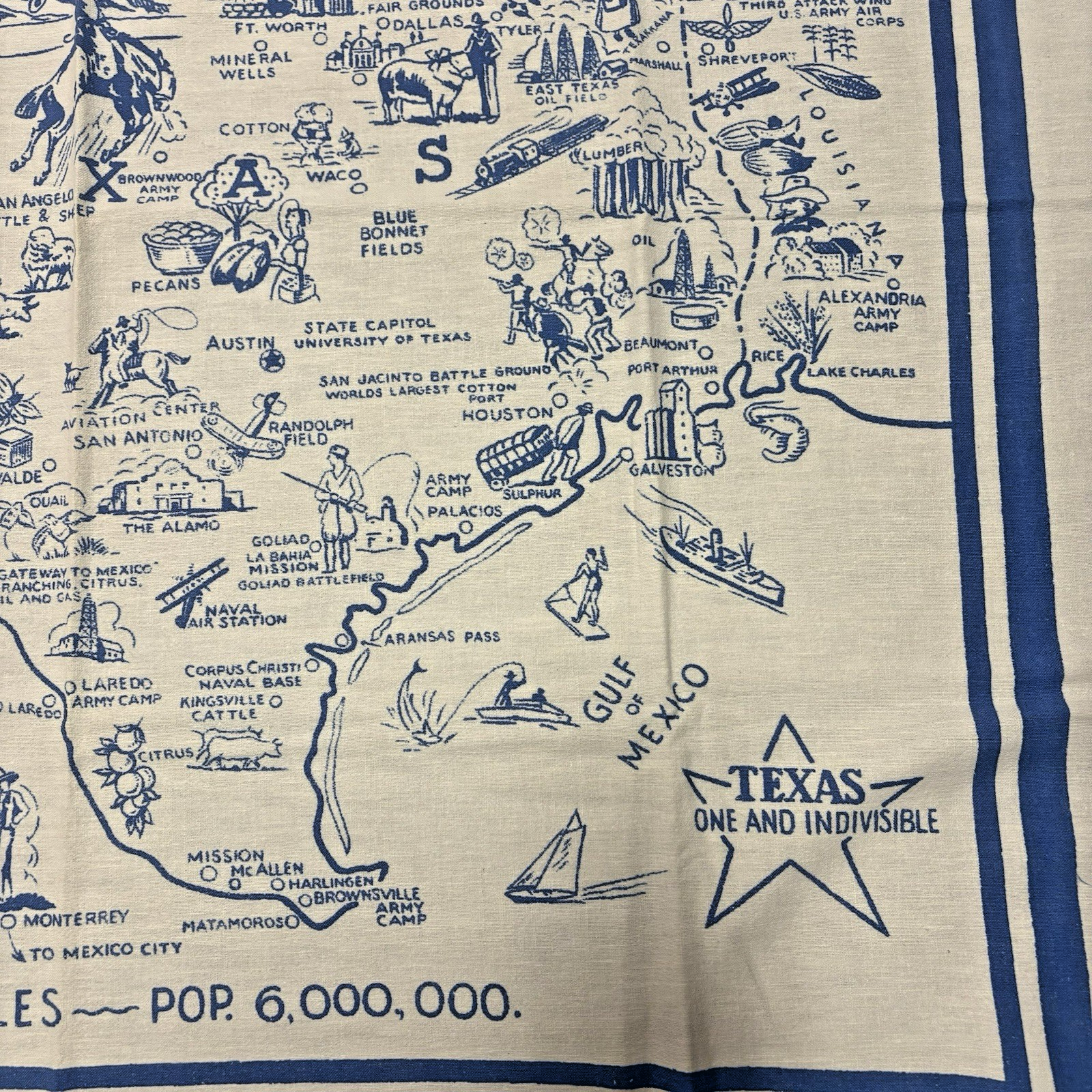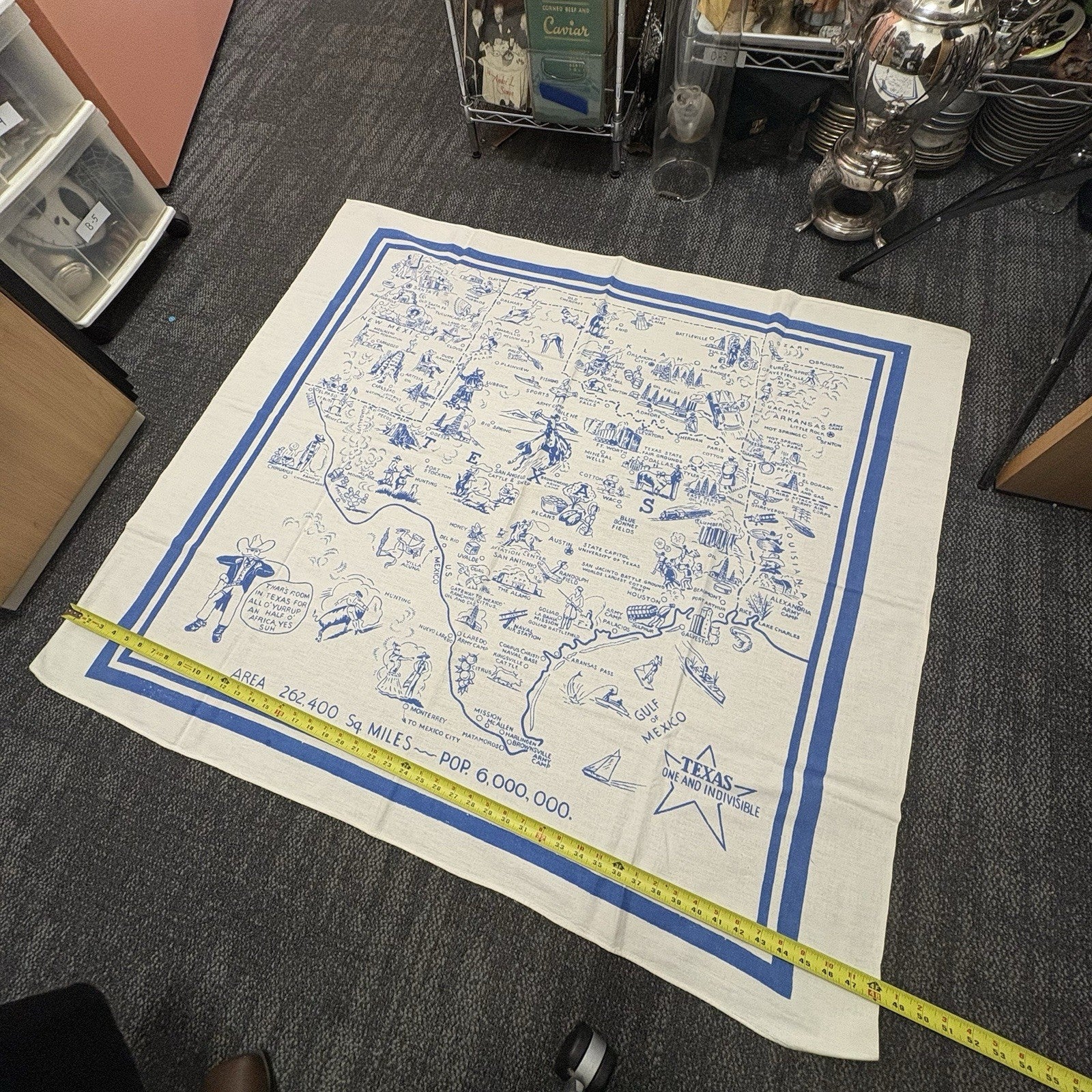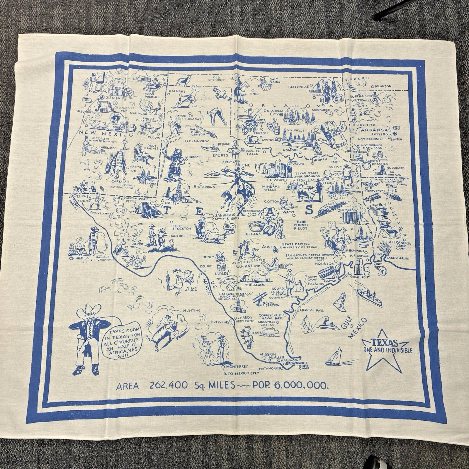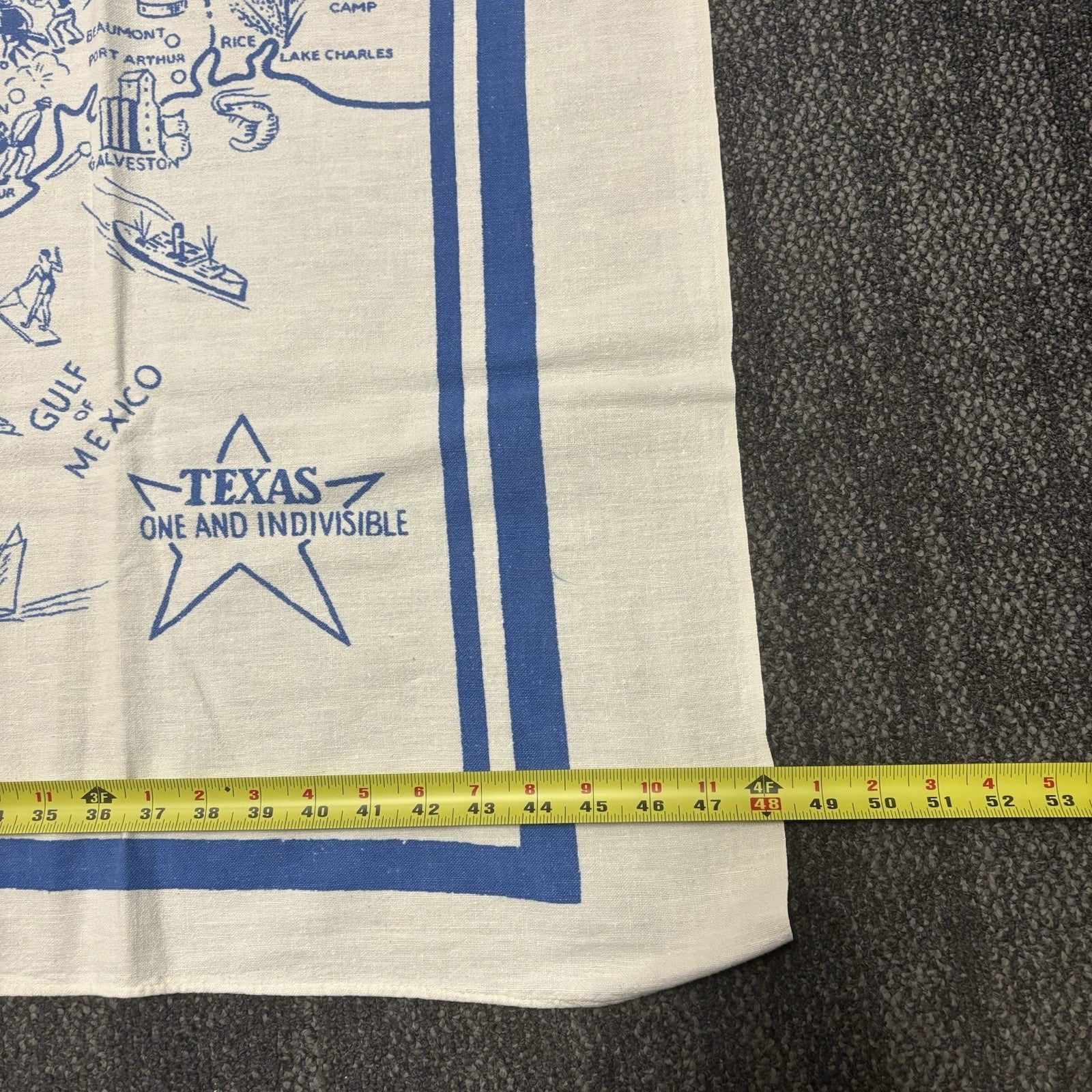 Vintage 1940s Large Texas Map Art Embroidery Tablecloth Linen Blue & White