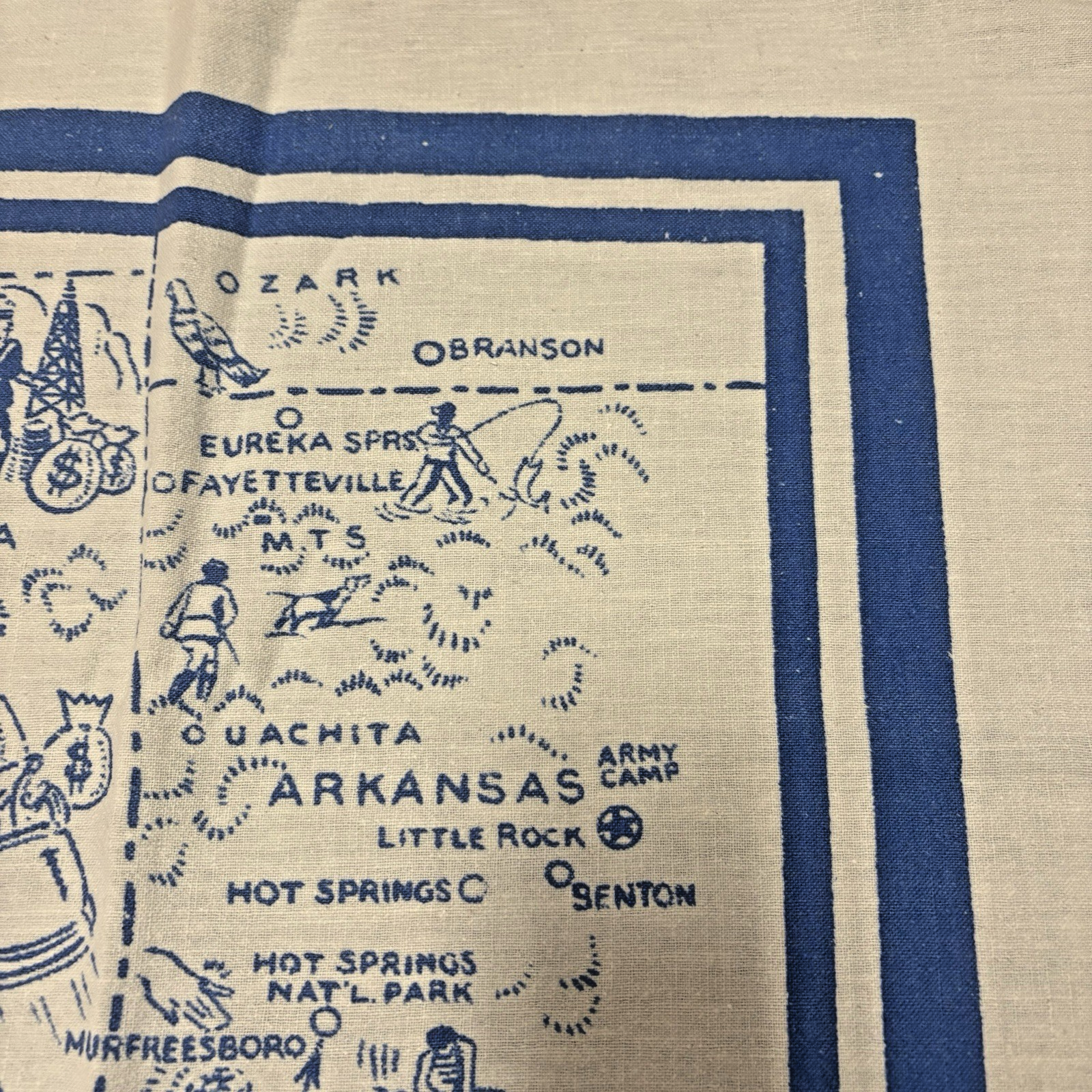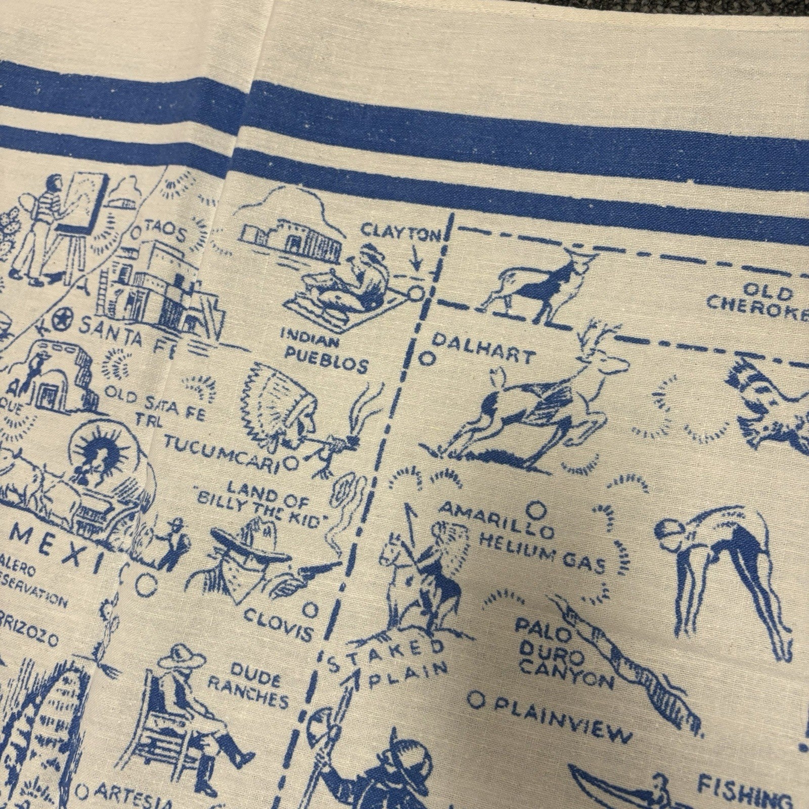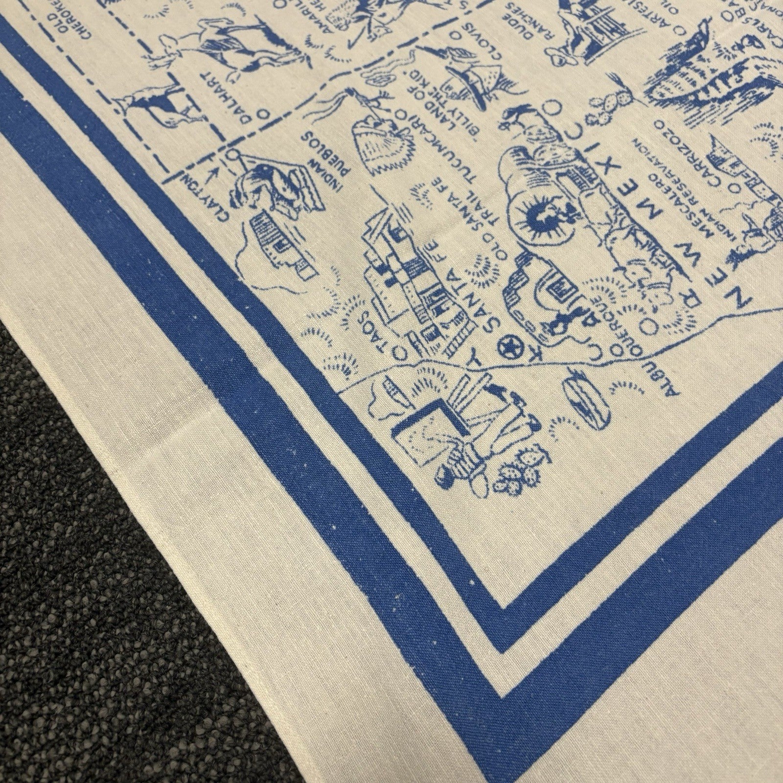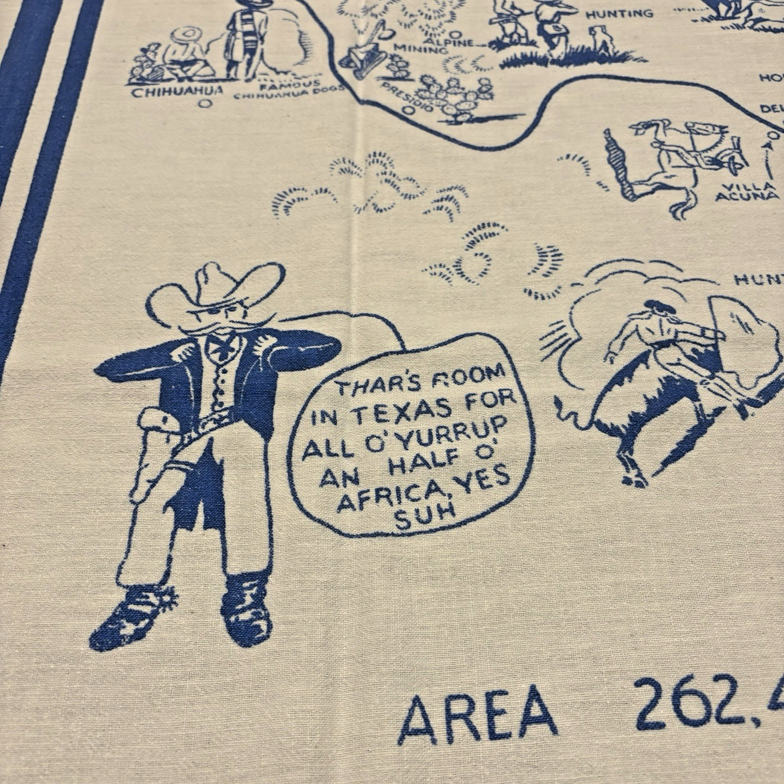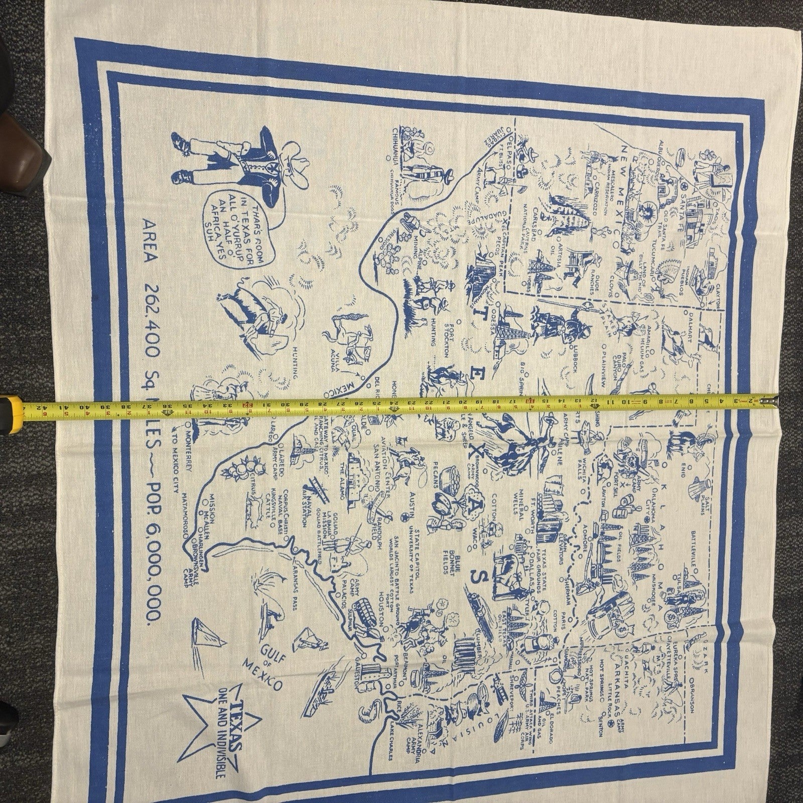 Vintage 1940s Large Texas Map Art Embroidery Tablecloth Linen Blue & White