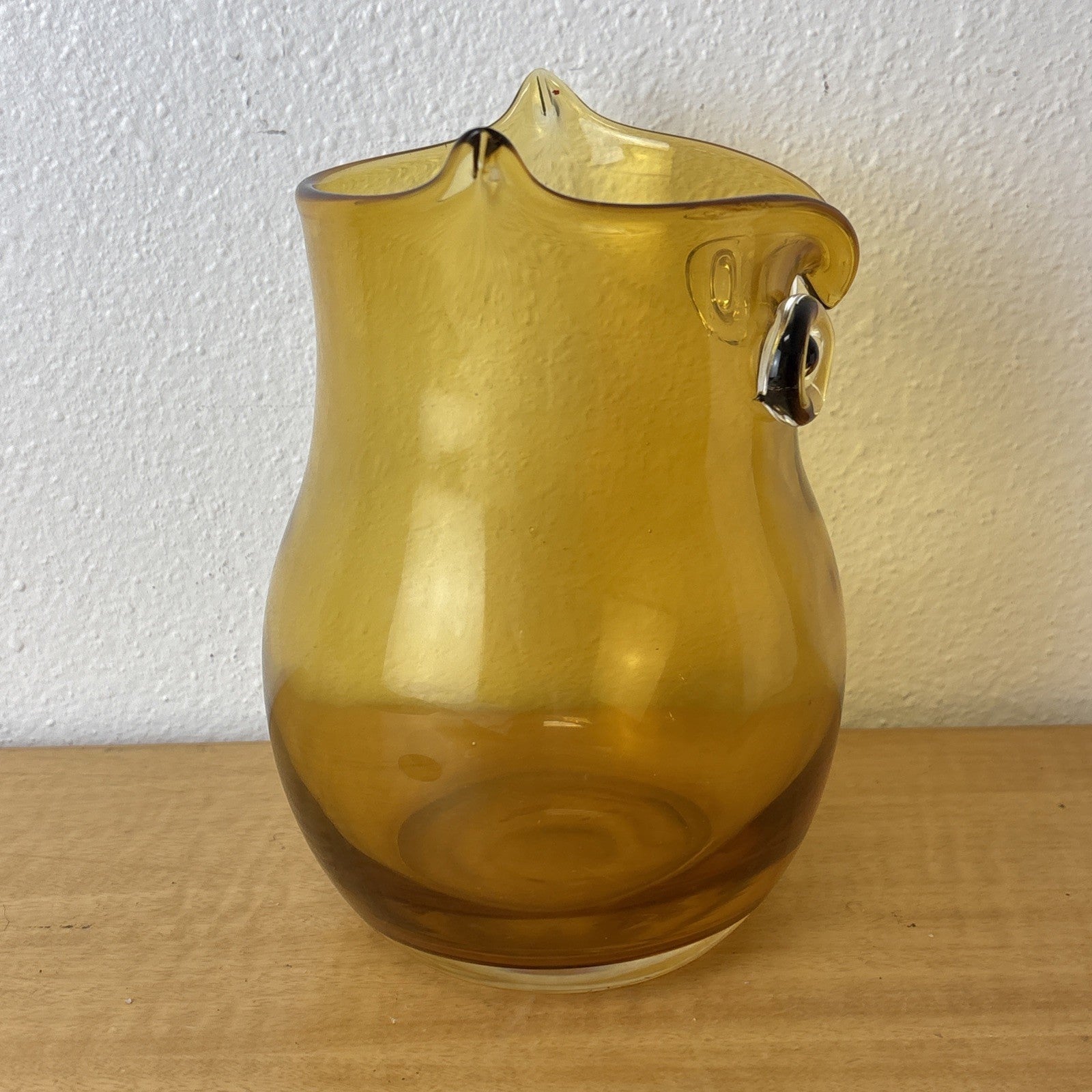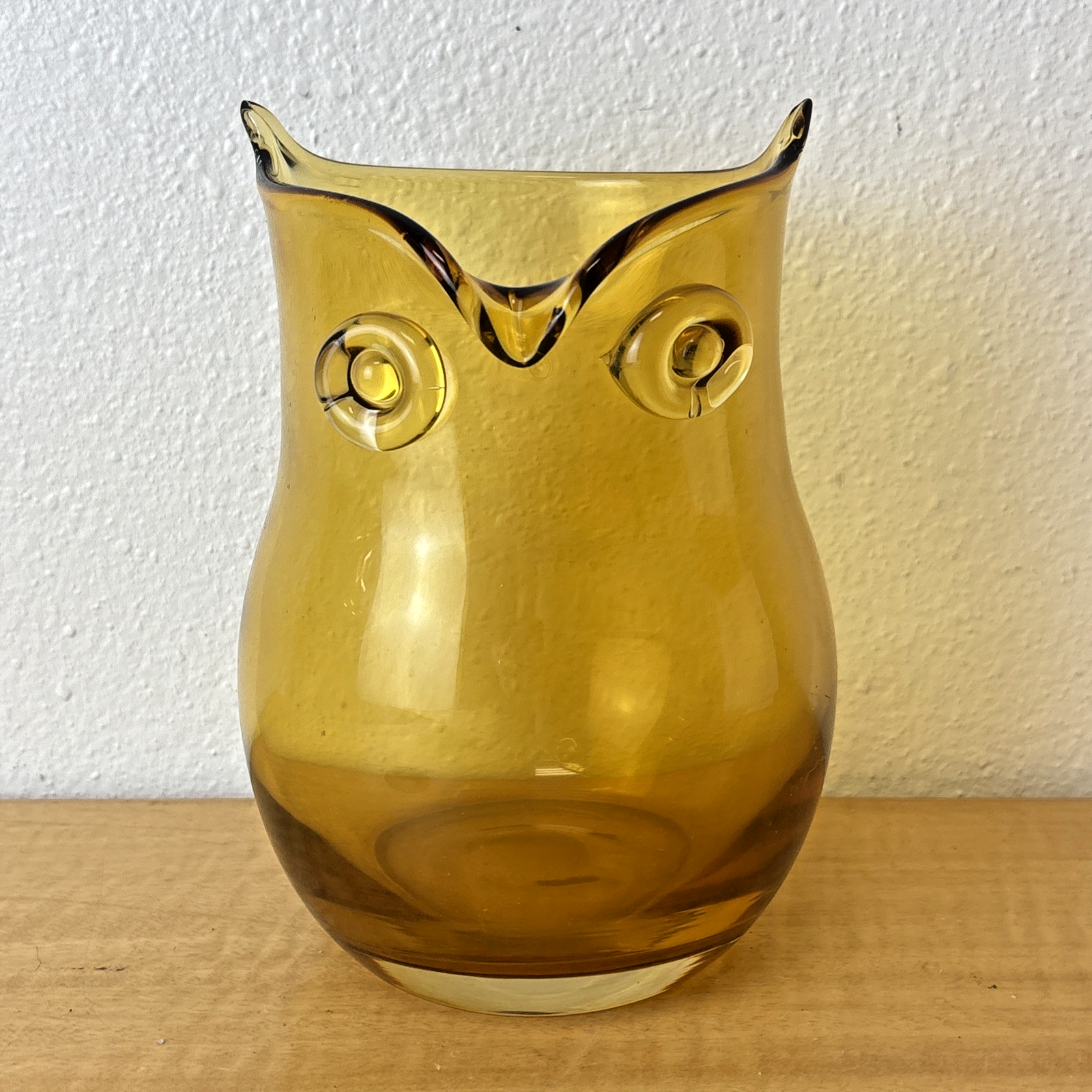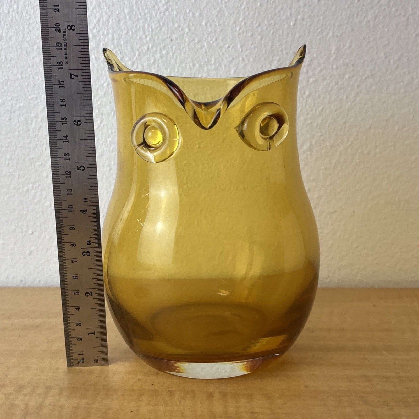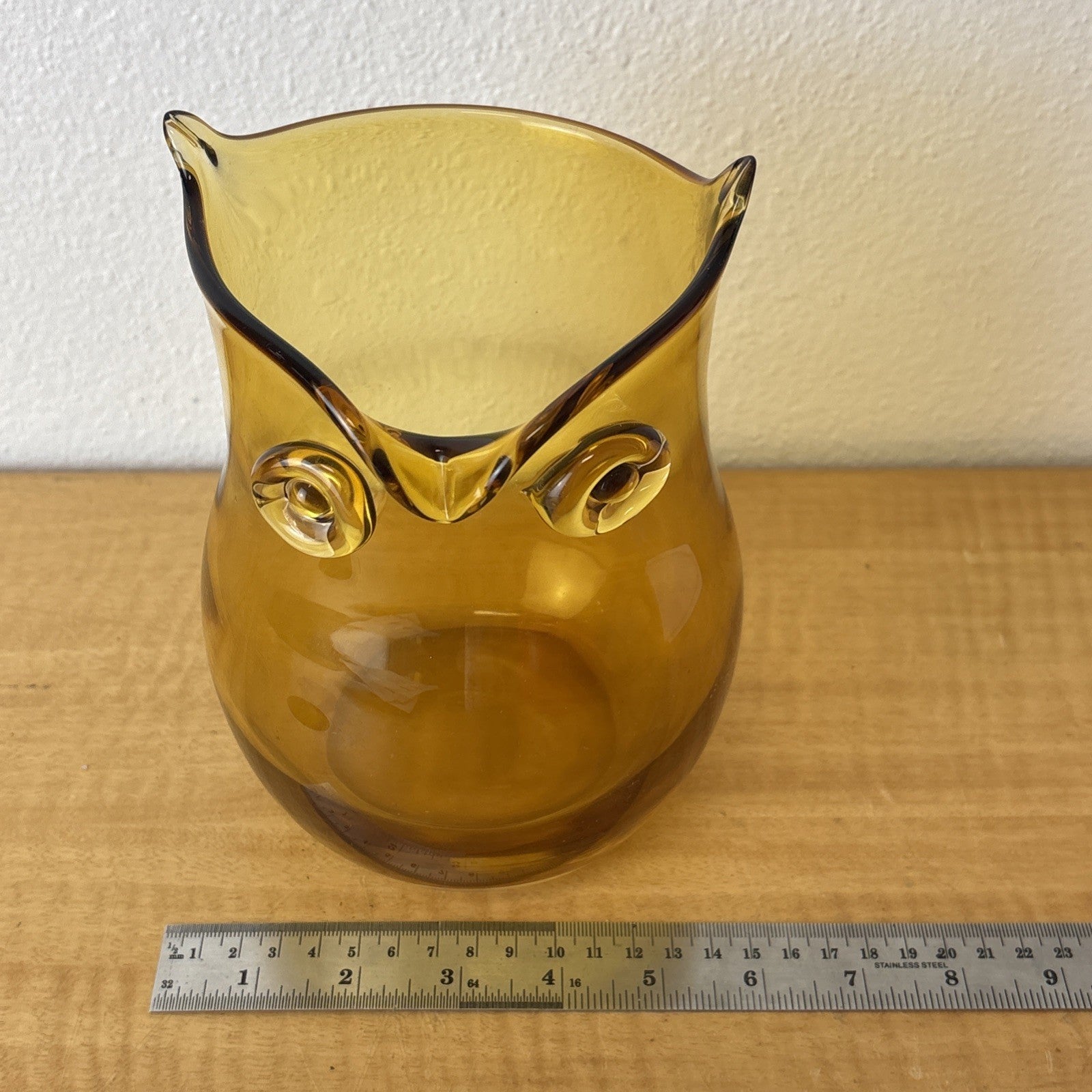 Vintage Art Glass Owl Vase Amber Applied Eyes Hand Blown