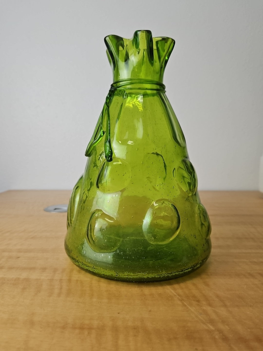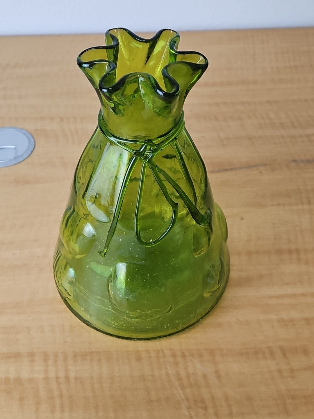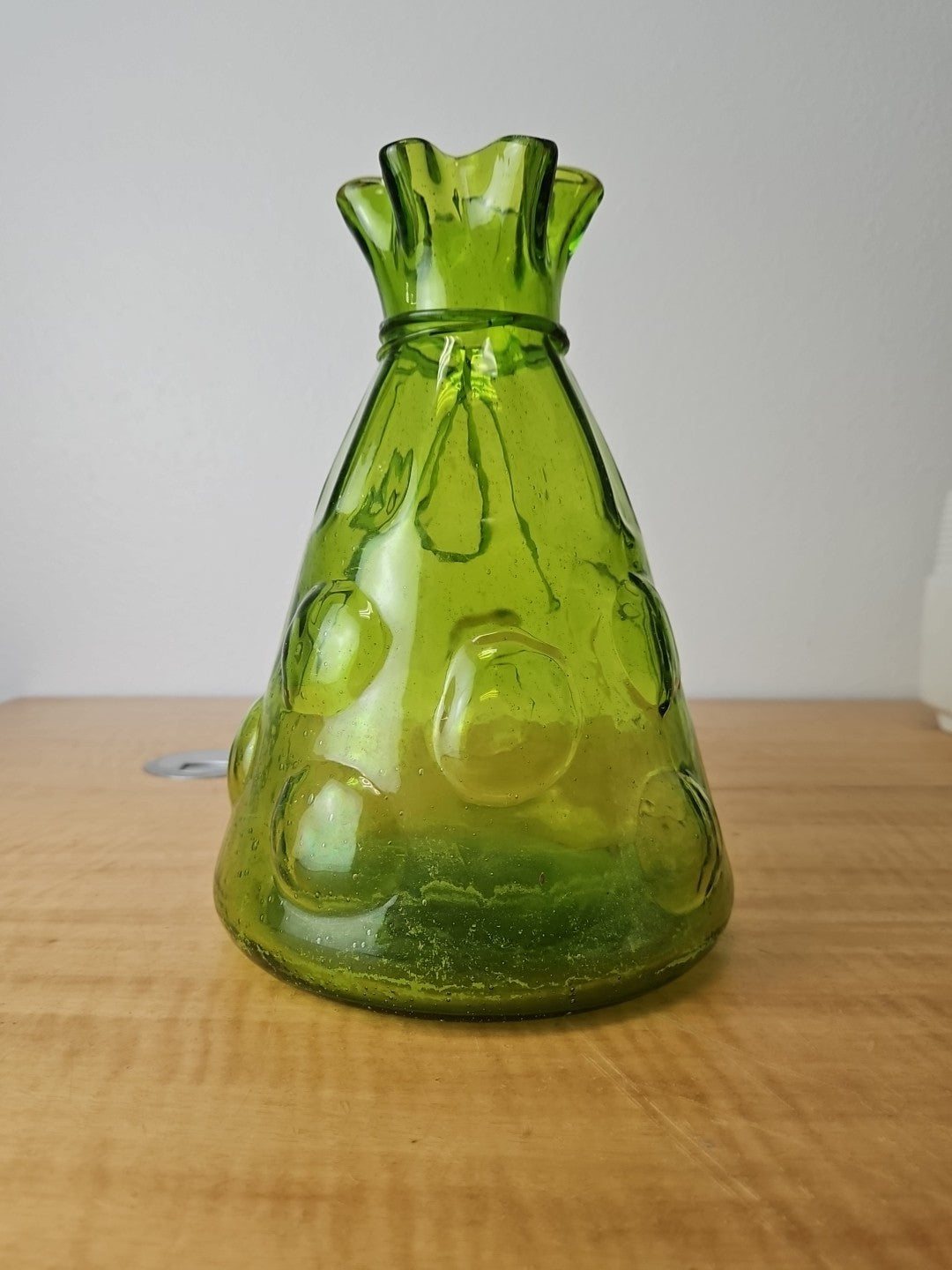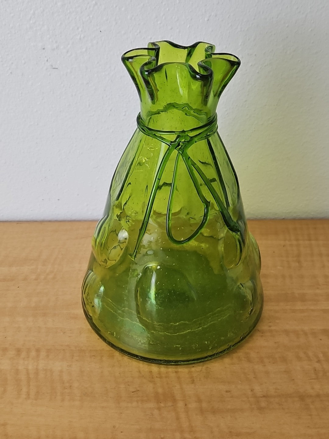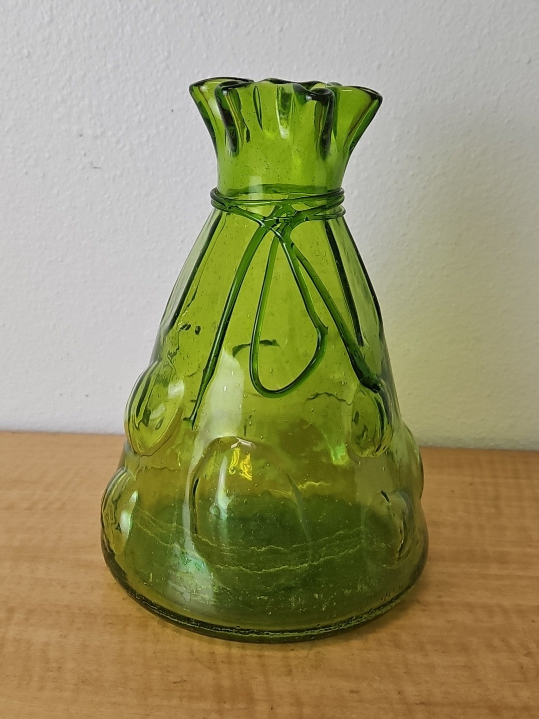Vintage Art Large Green Glass Vase Hand Blown Bubble Cinch Top Ribbon.