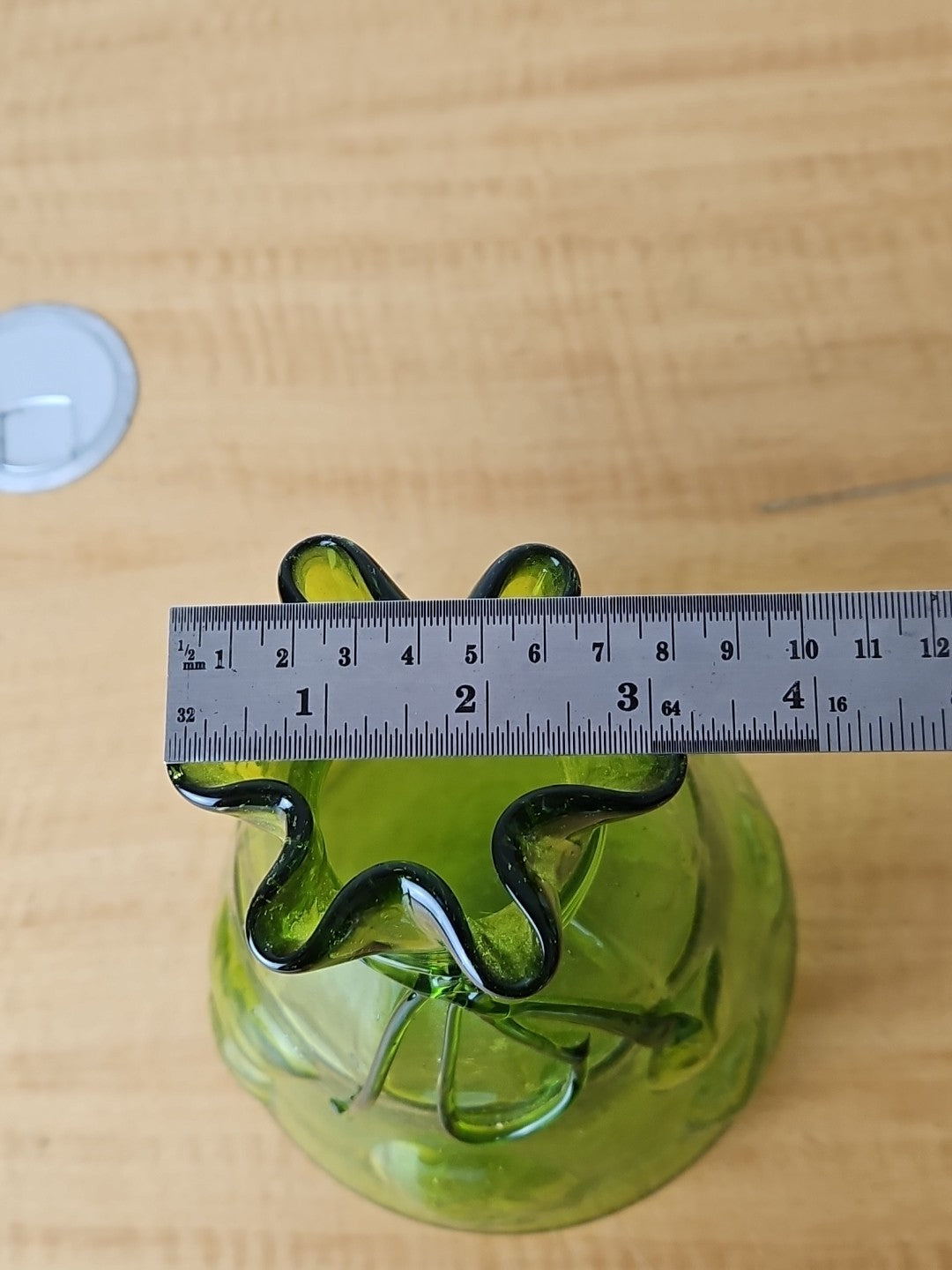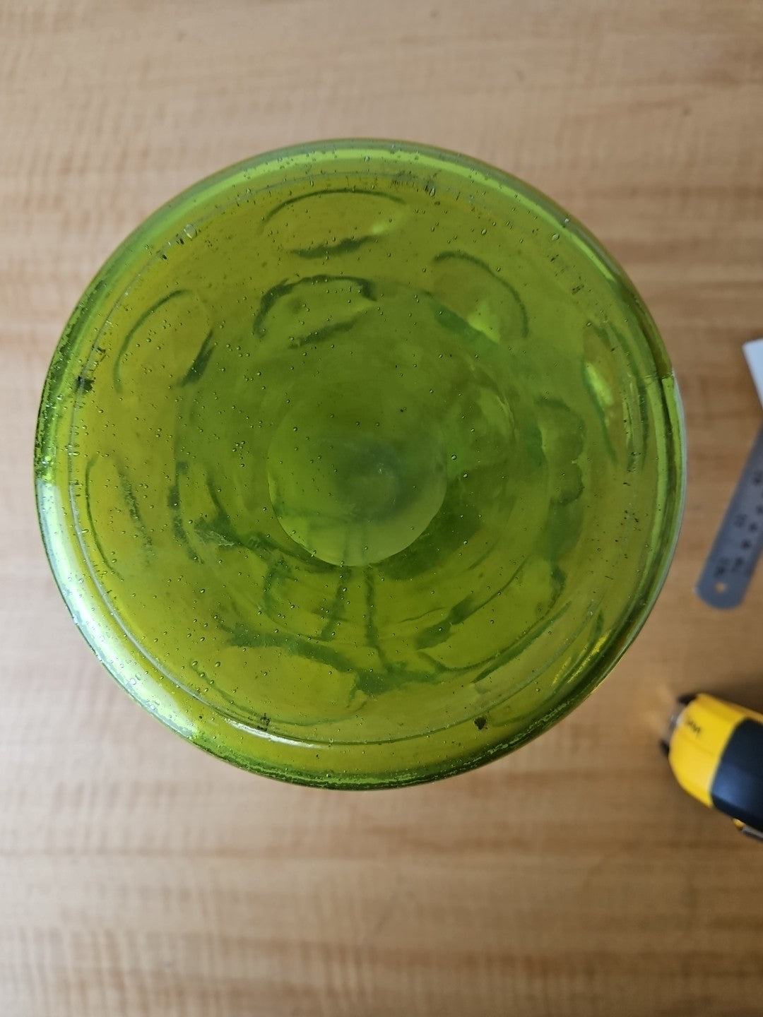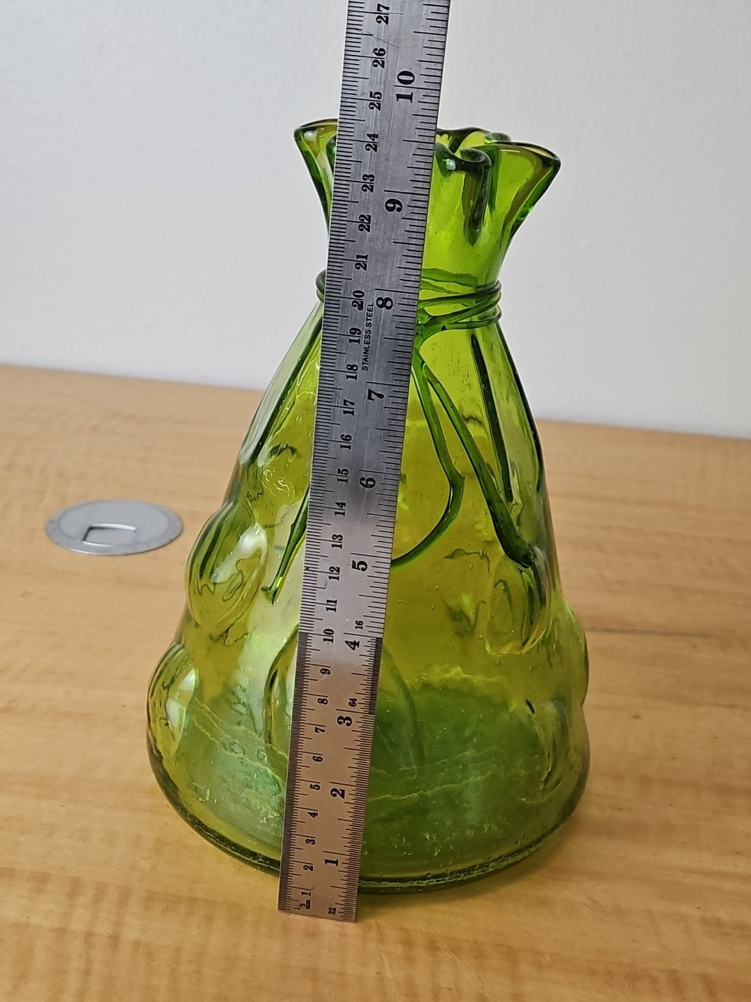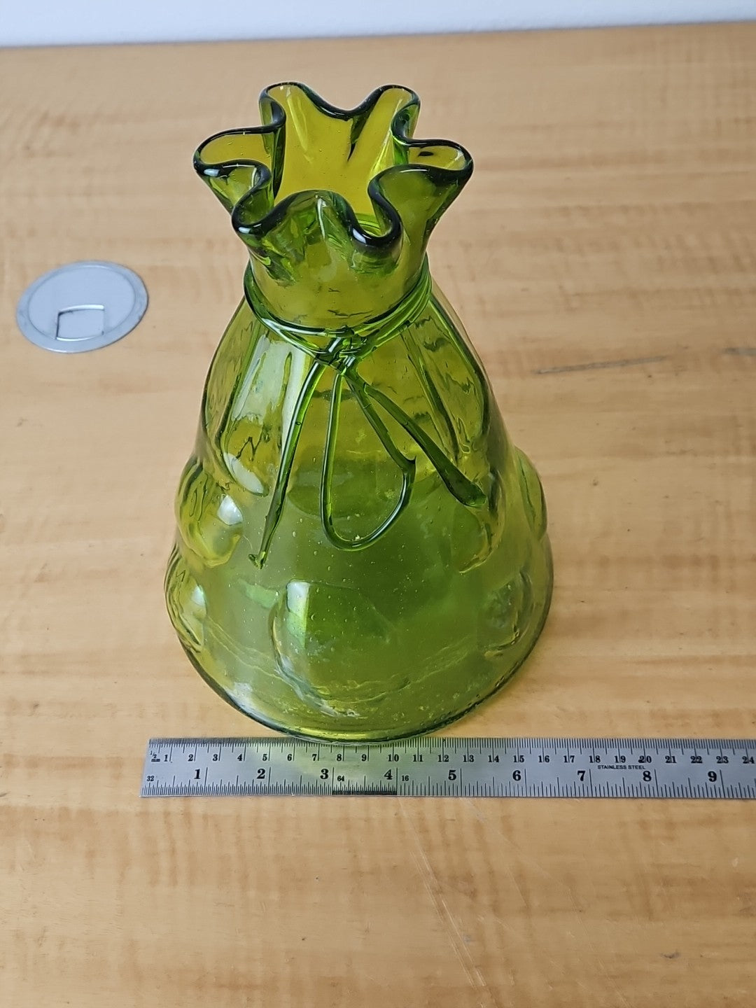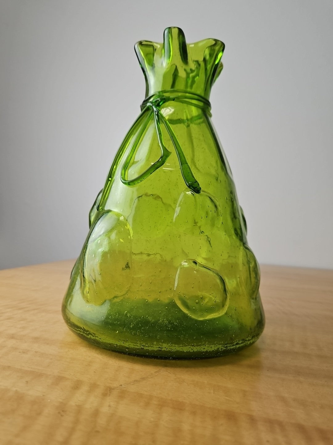Vintage Art Large Green Glass Vase Hand Blown Bubble Cinch Top Ribbon.