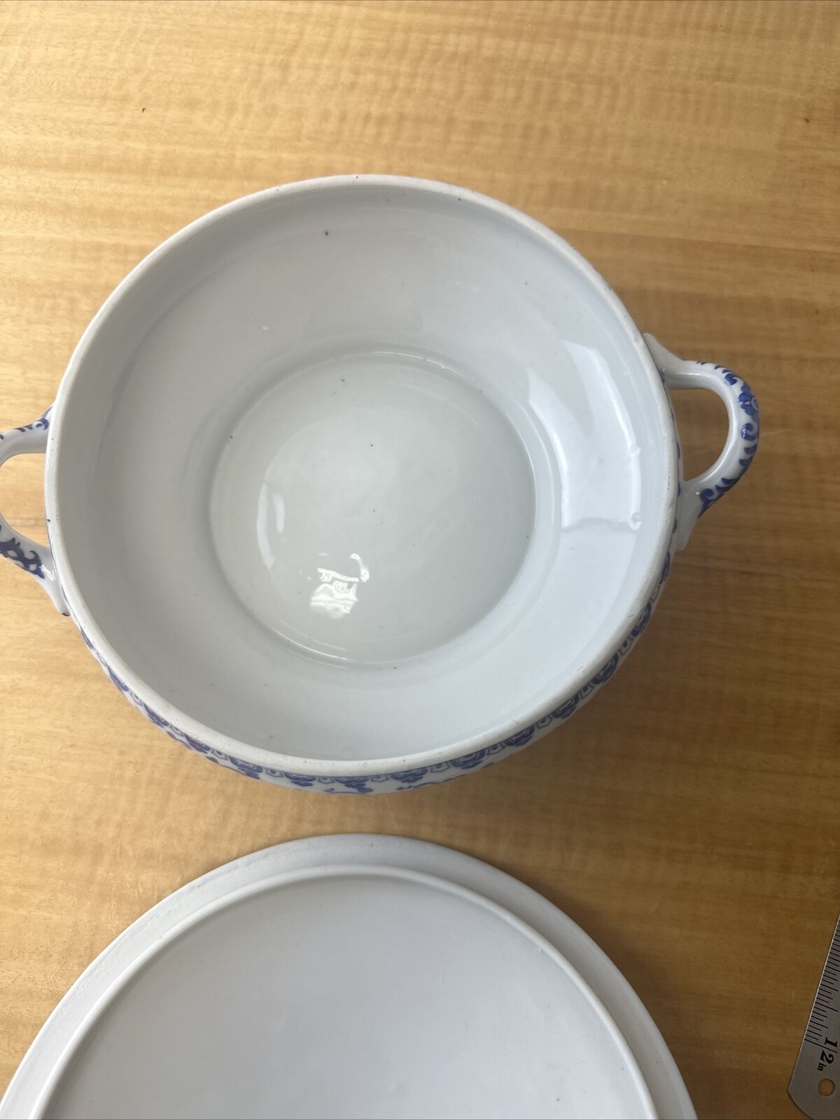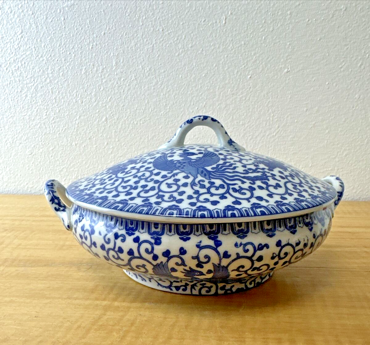 Vintage Blue Phoenix Bird Flying Turkey Circle Tureen Japan mark with flower