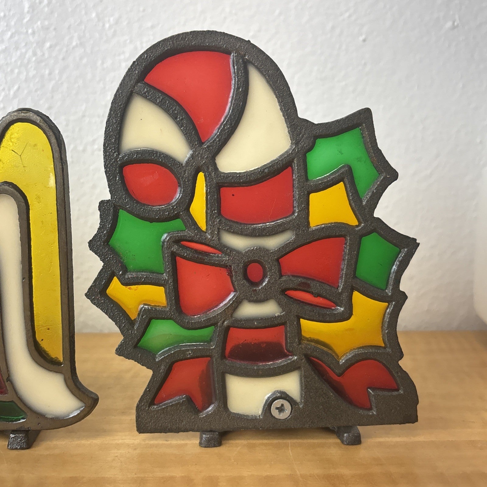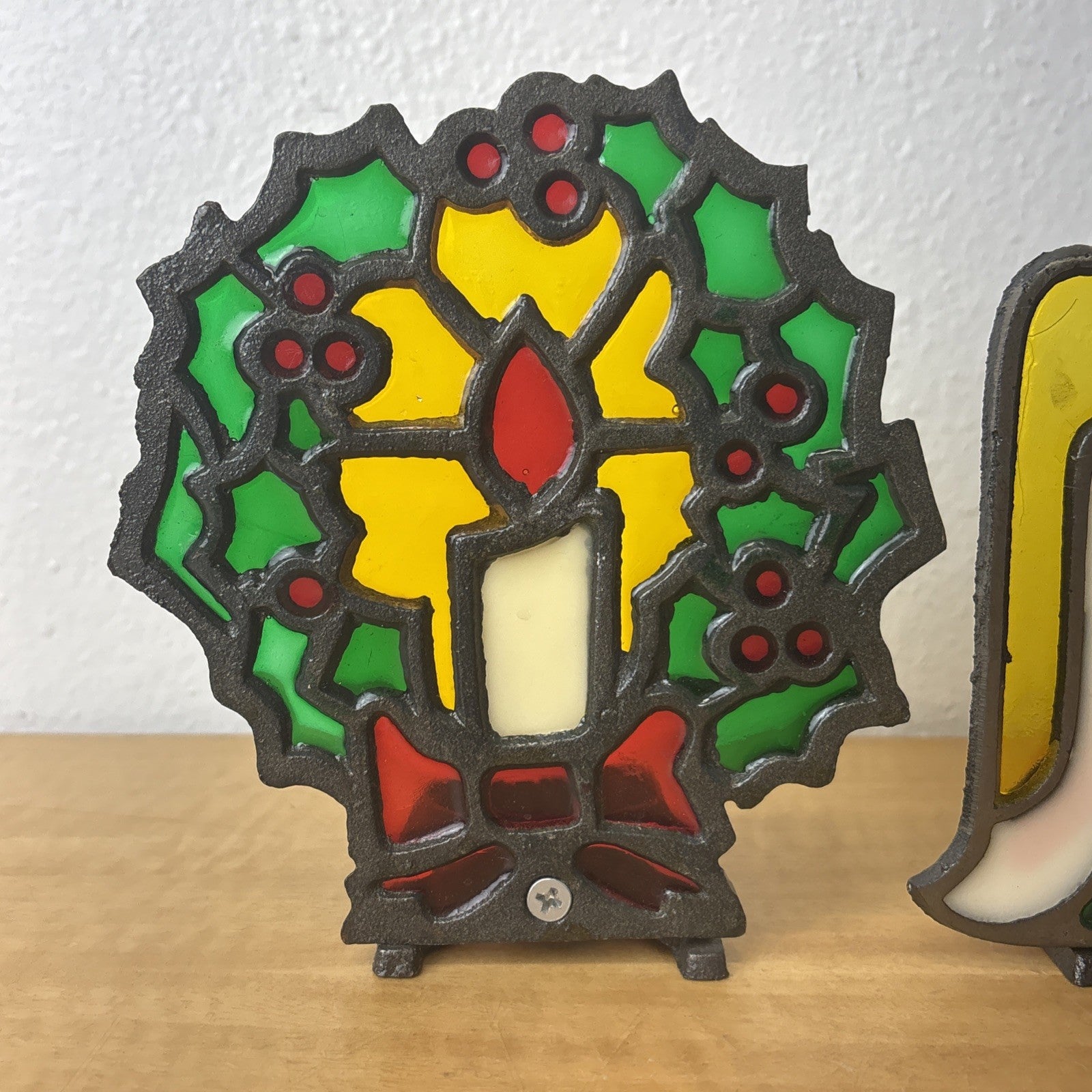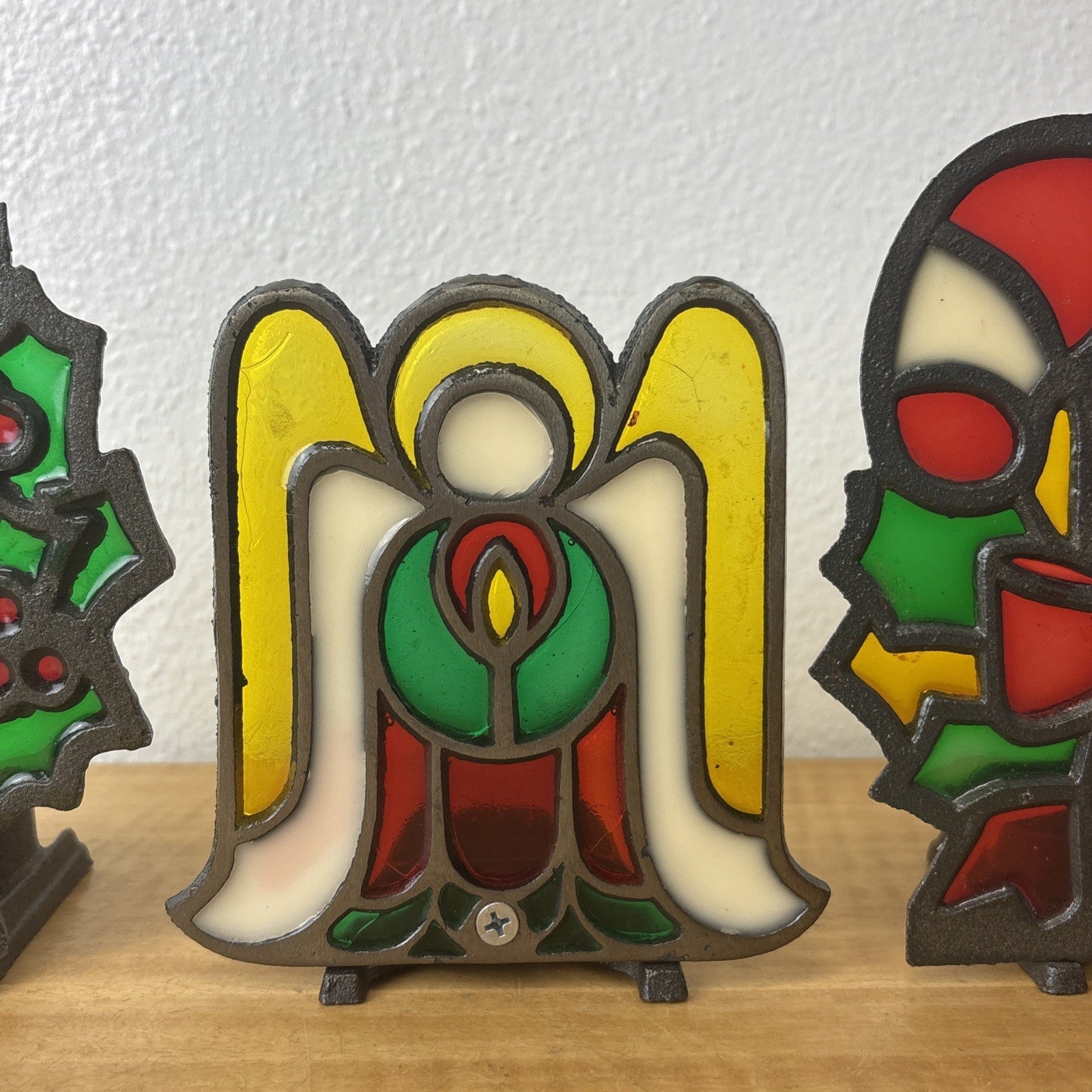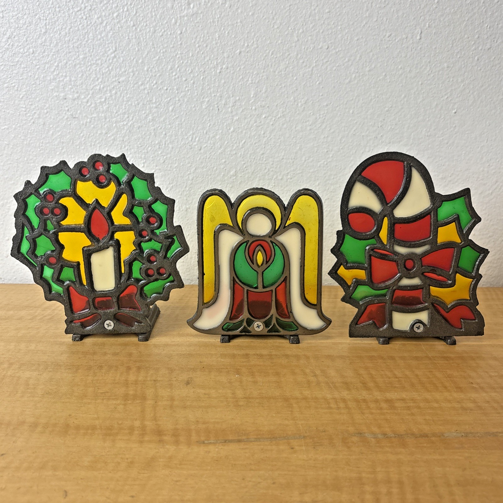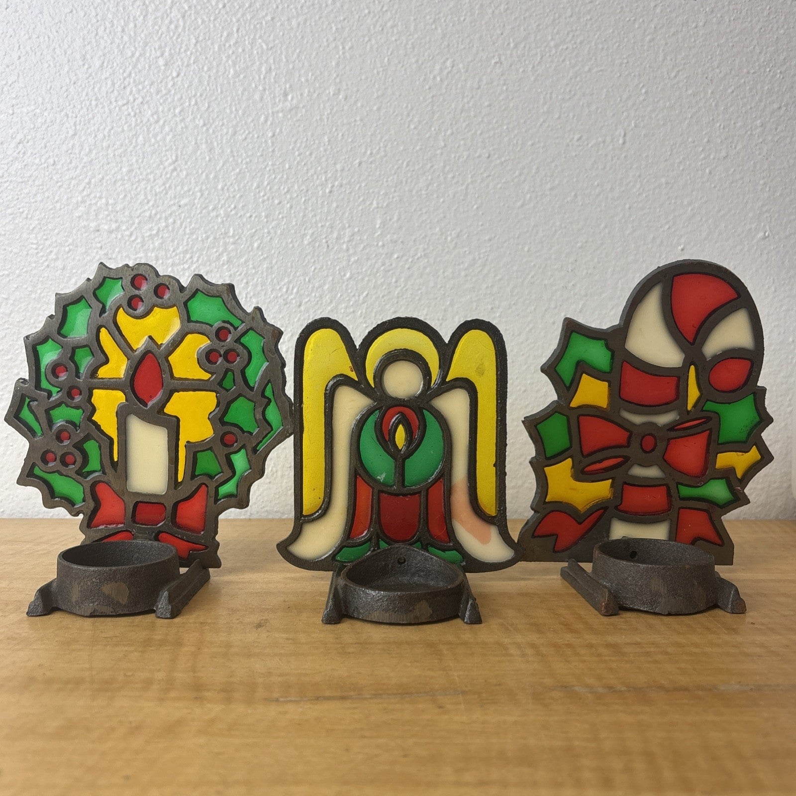 Vintage Cast Iron Stained Glass Christmas Candy Cane, Angel, & Wreath Tea Light