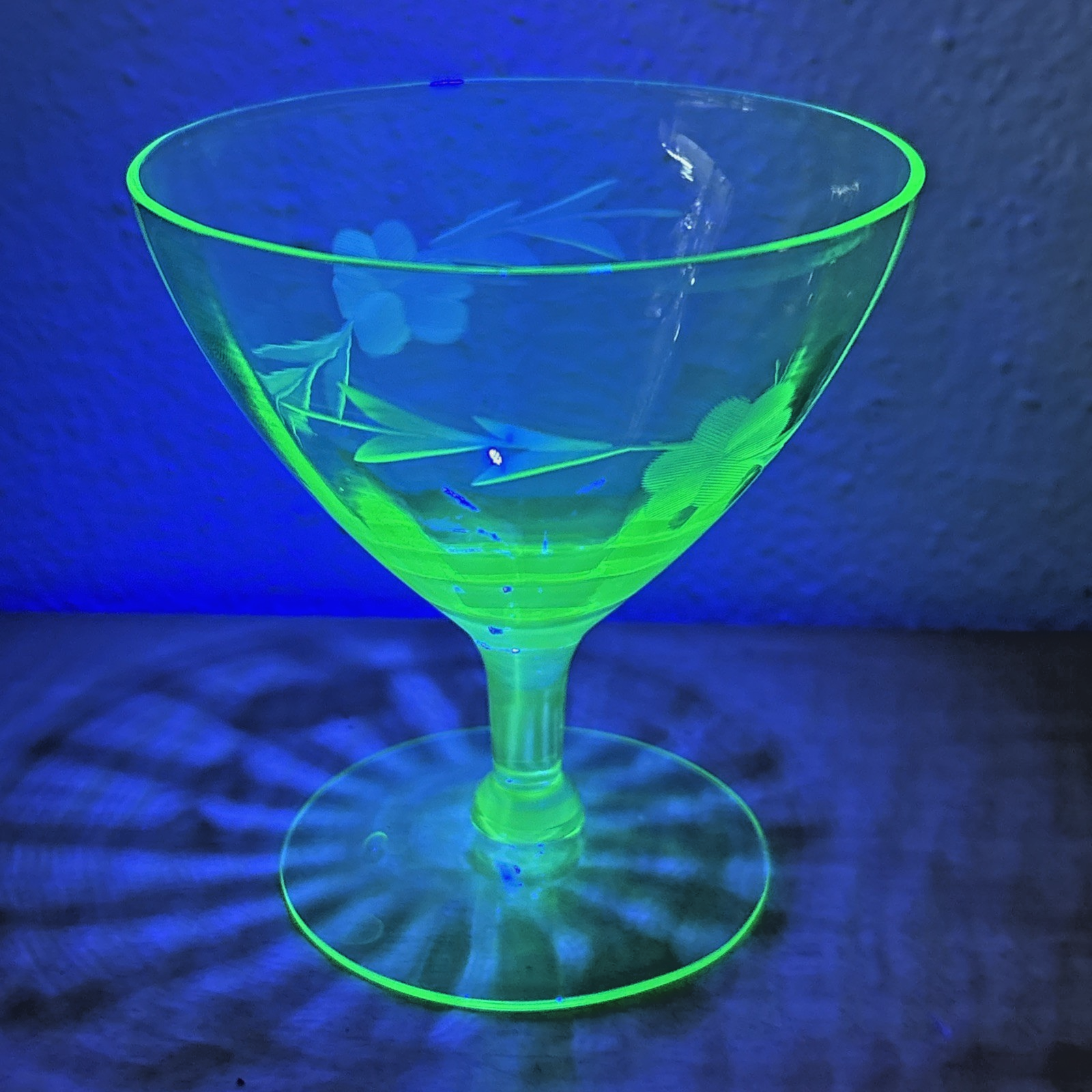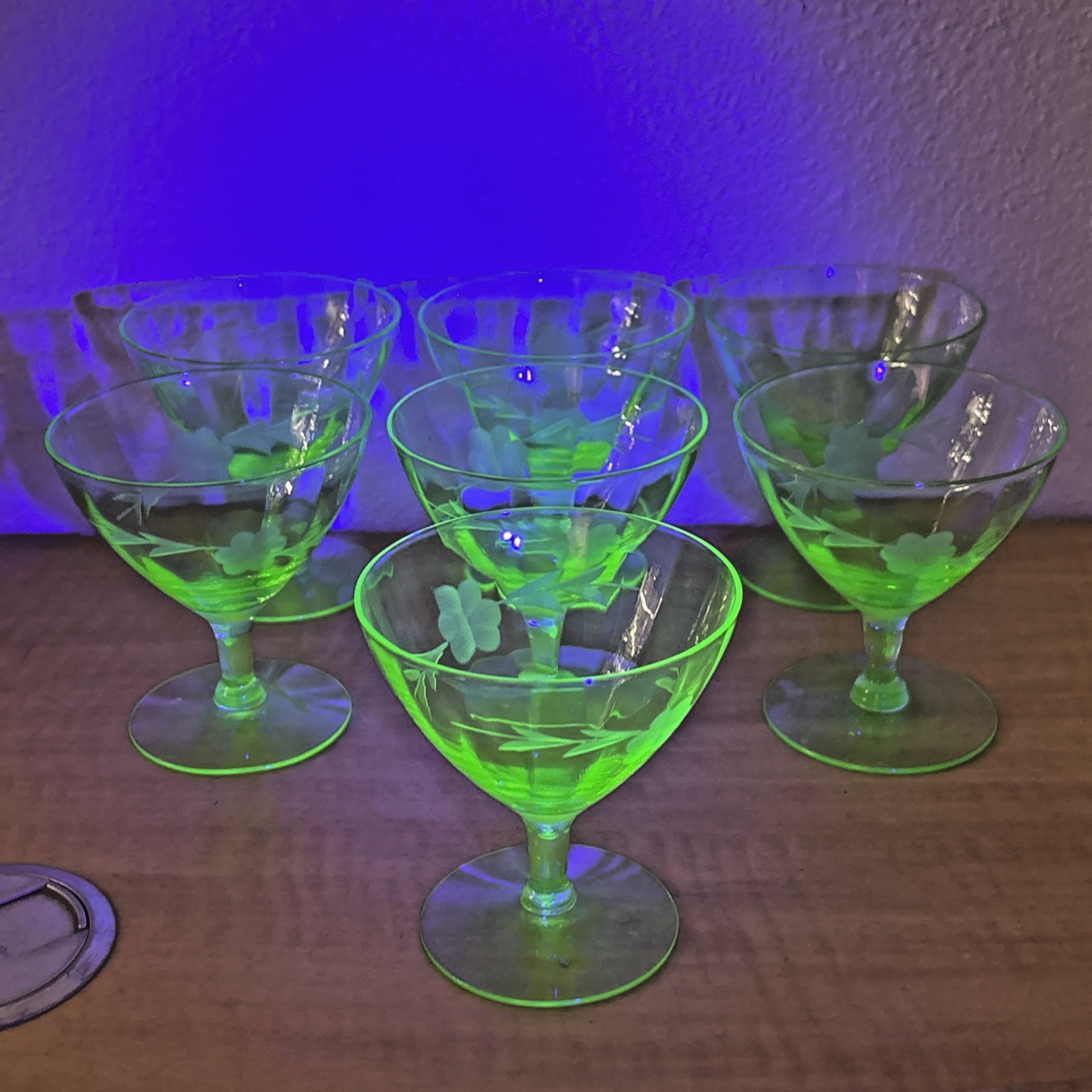 Vintage Champagne/Sherbet Clear Needle Etched Pattern Green Uranium Glass