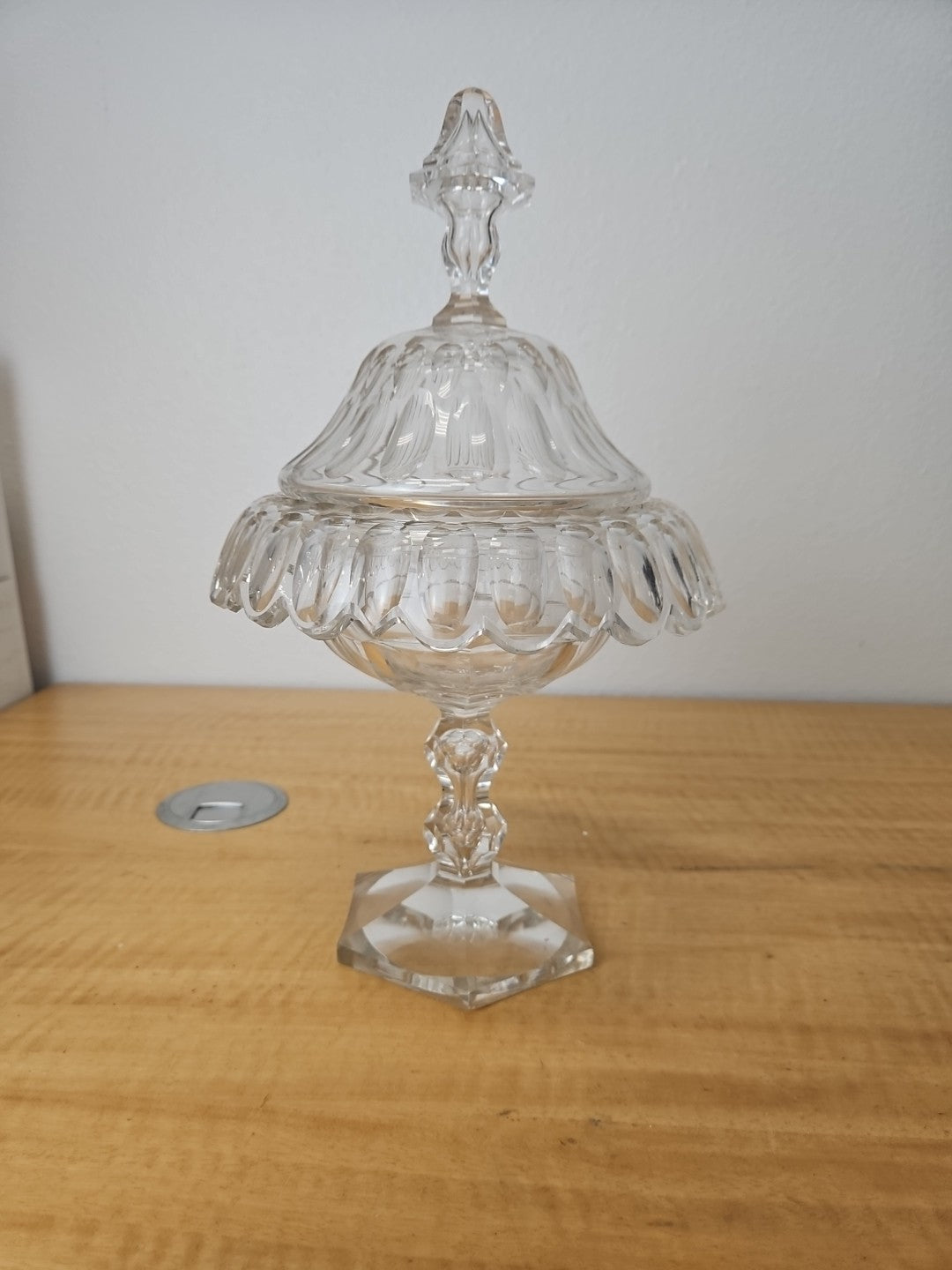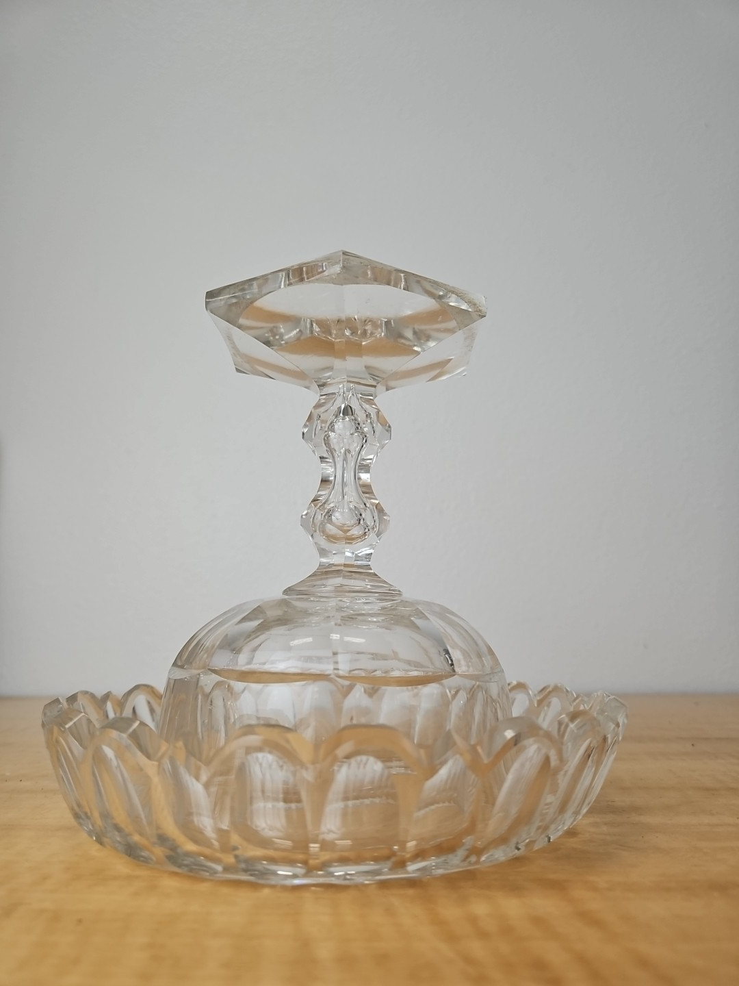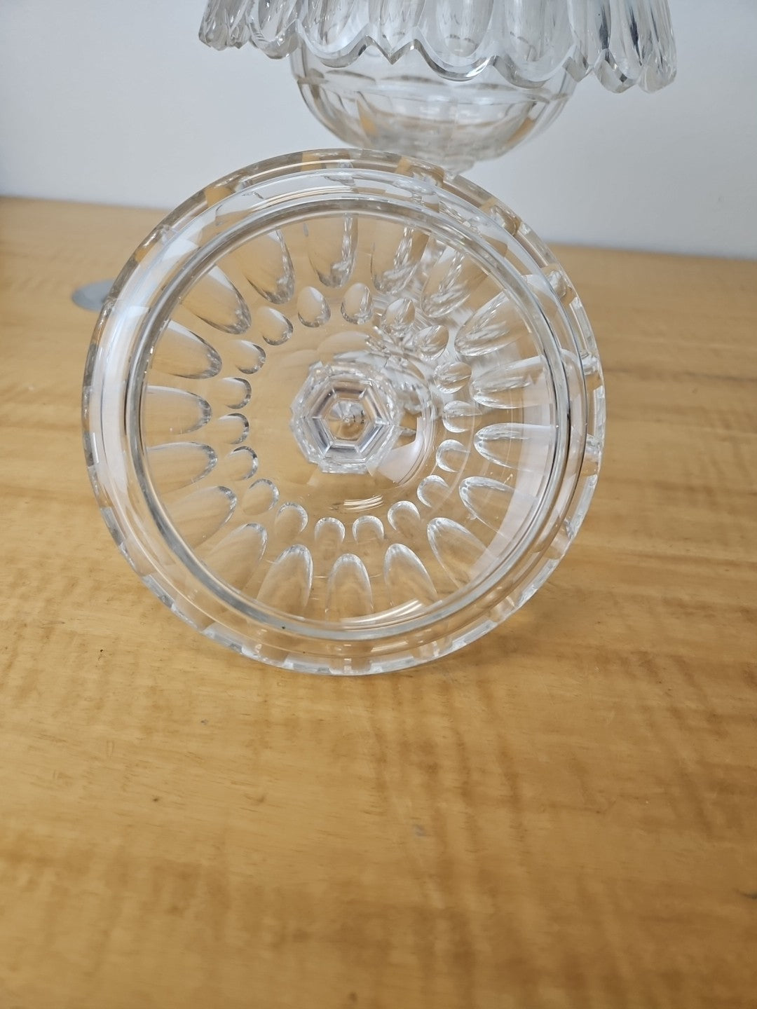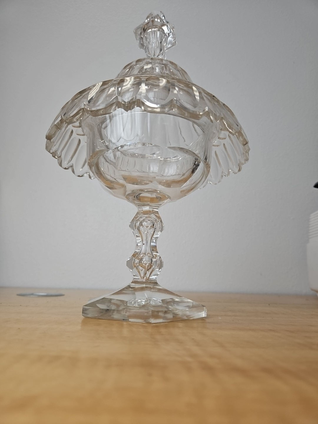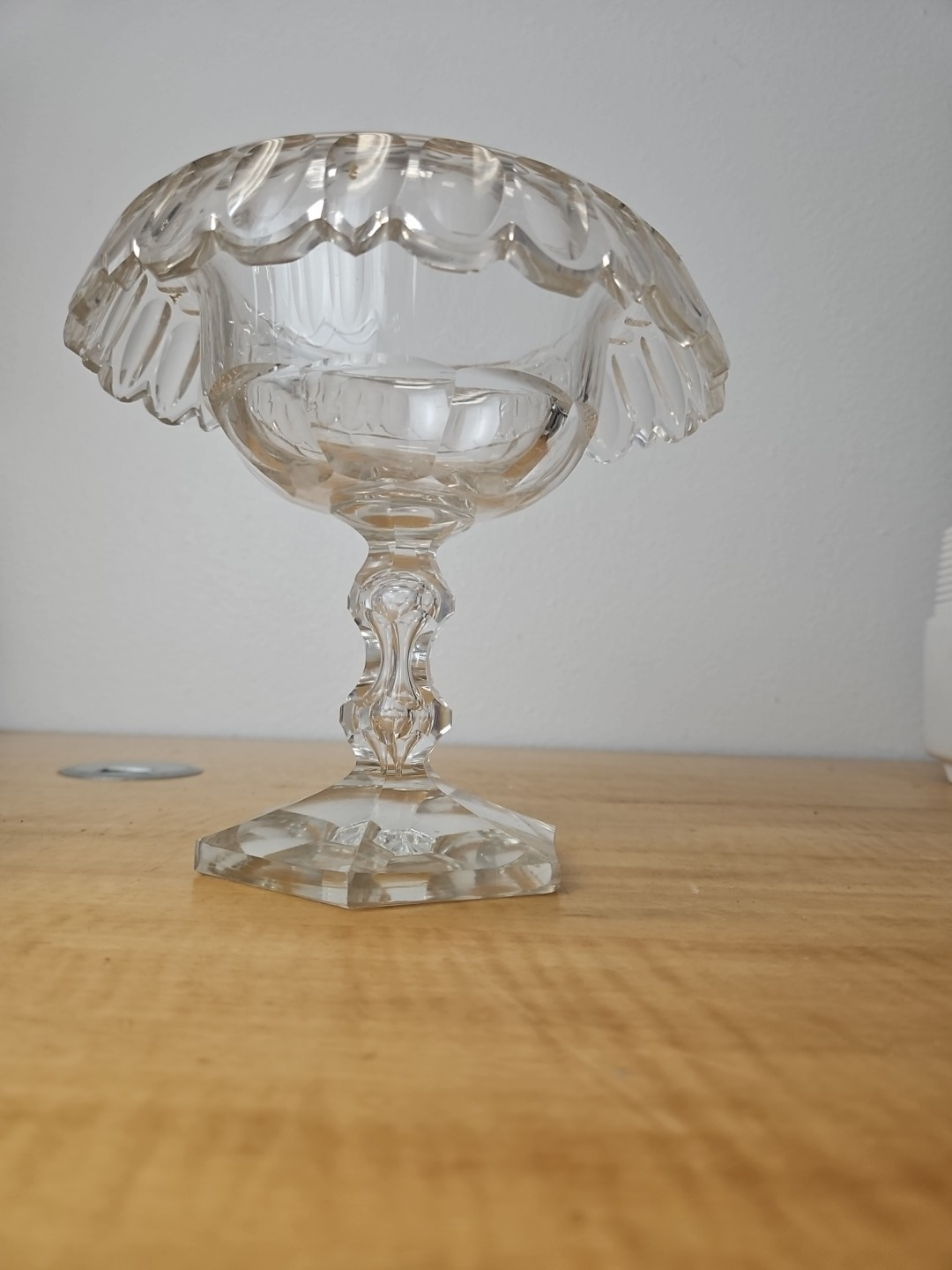 Vintage Crystal covered pedestal Dish Bowl; scalloped, turned-over rim 12 1/2"h
