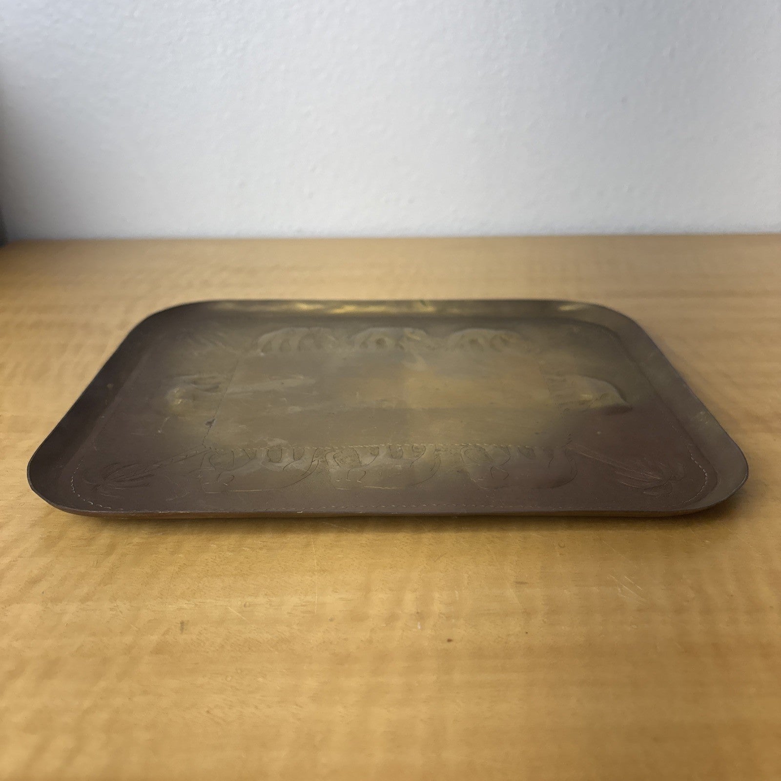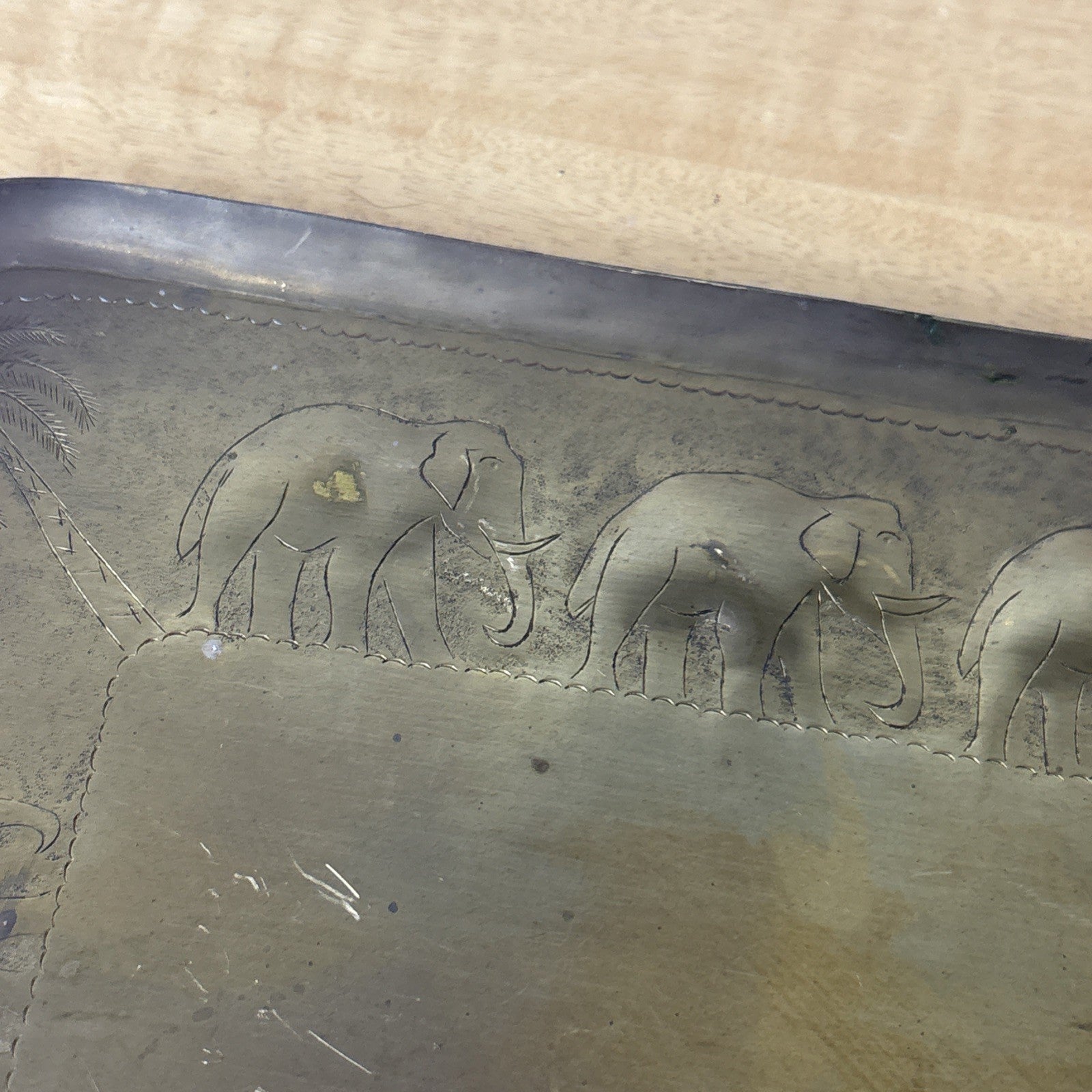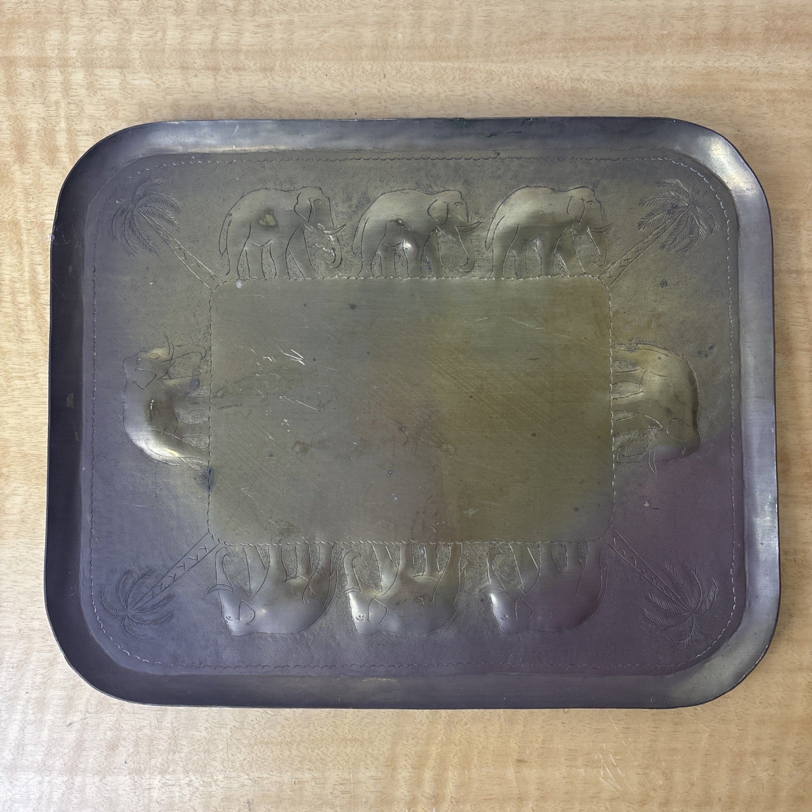 Vintage Etched Brass Trinket Dish Elephant and Palm Tree Design