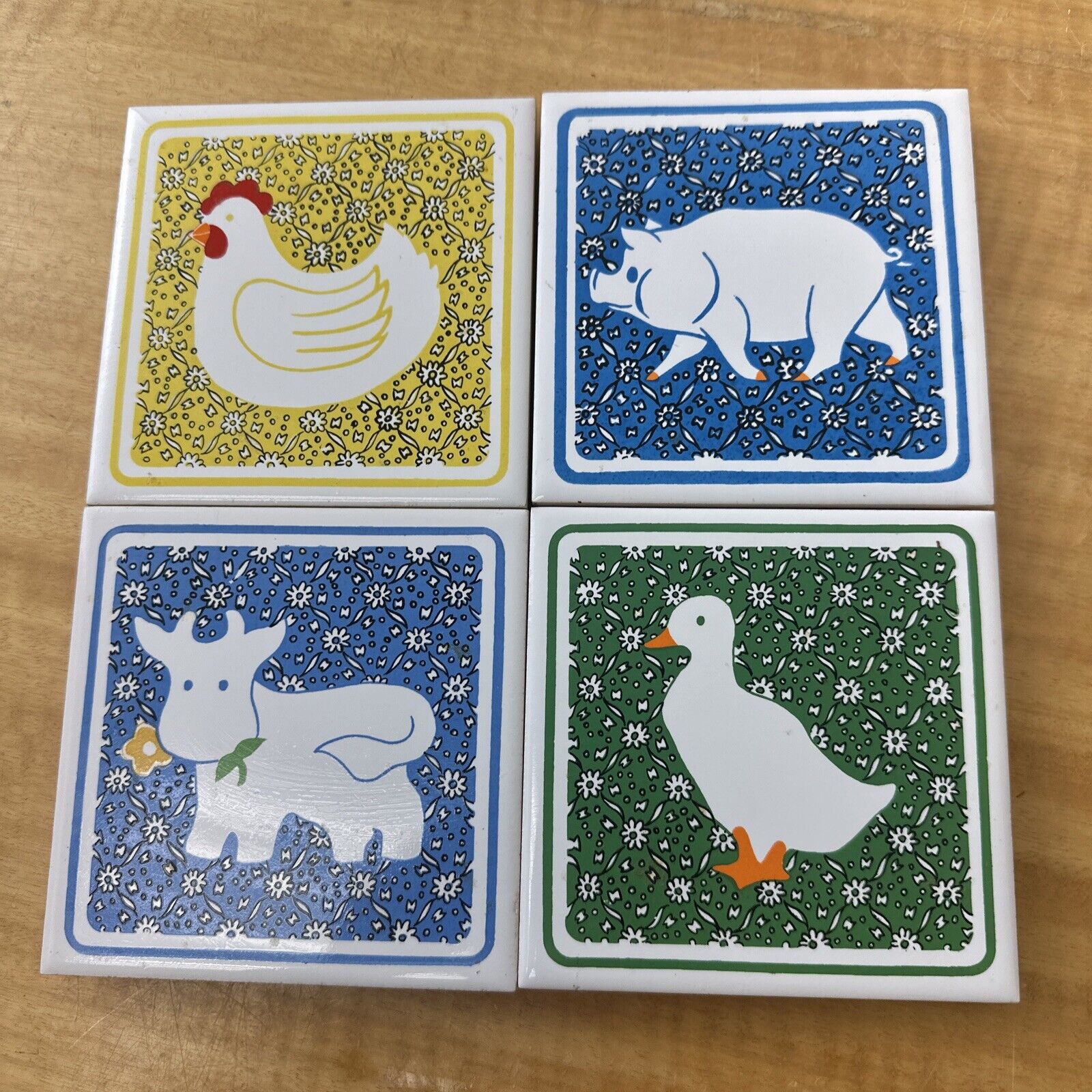 VINTAGE FARM ANIMAL COUNTRY CALICO CERAMIC TILE TRIVETS COASTER SET OF 4