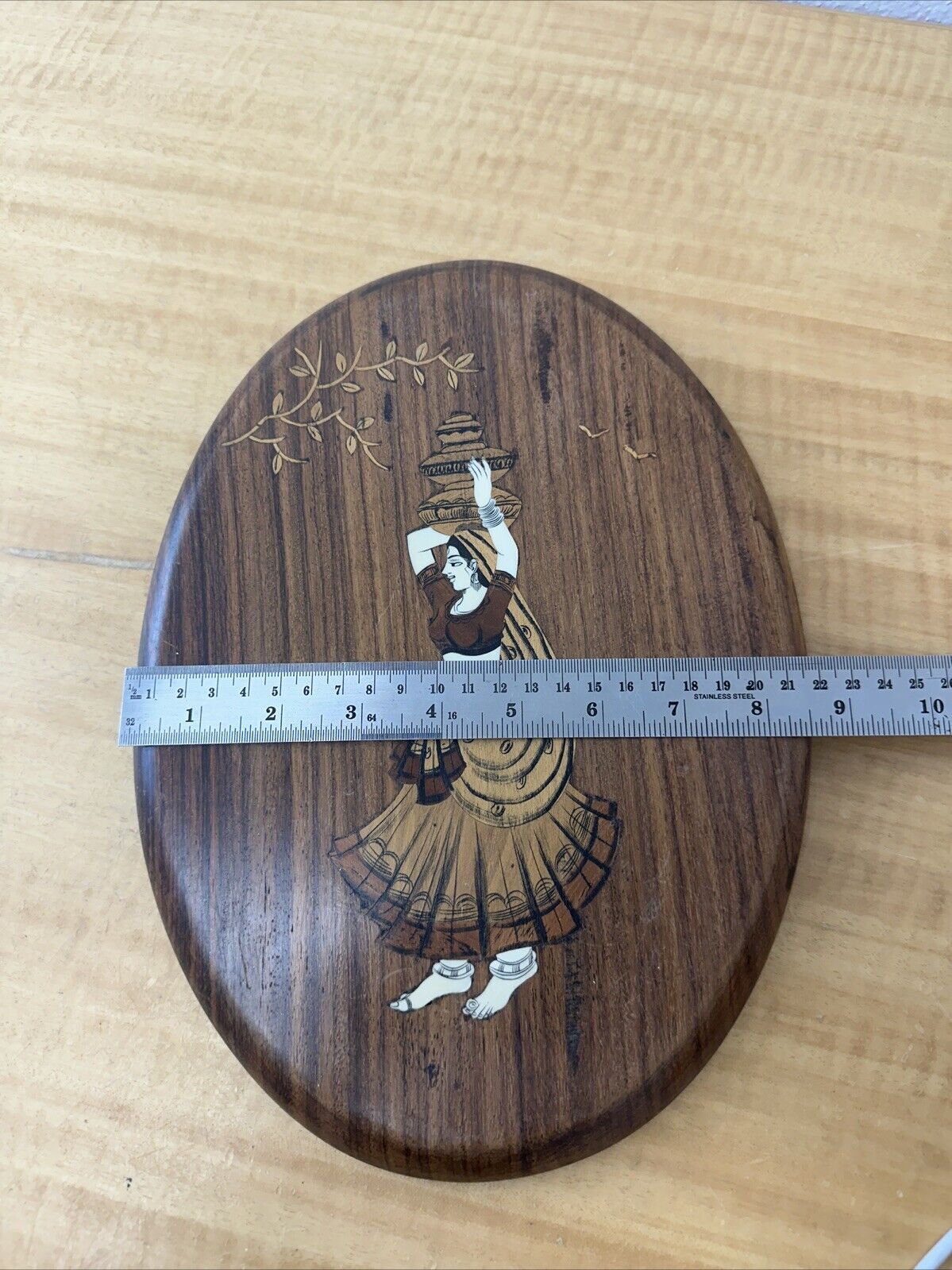 Vintage Indian Inlaid Wood Handmade Handcarved Plaque Women -Oval