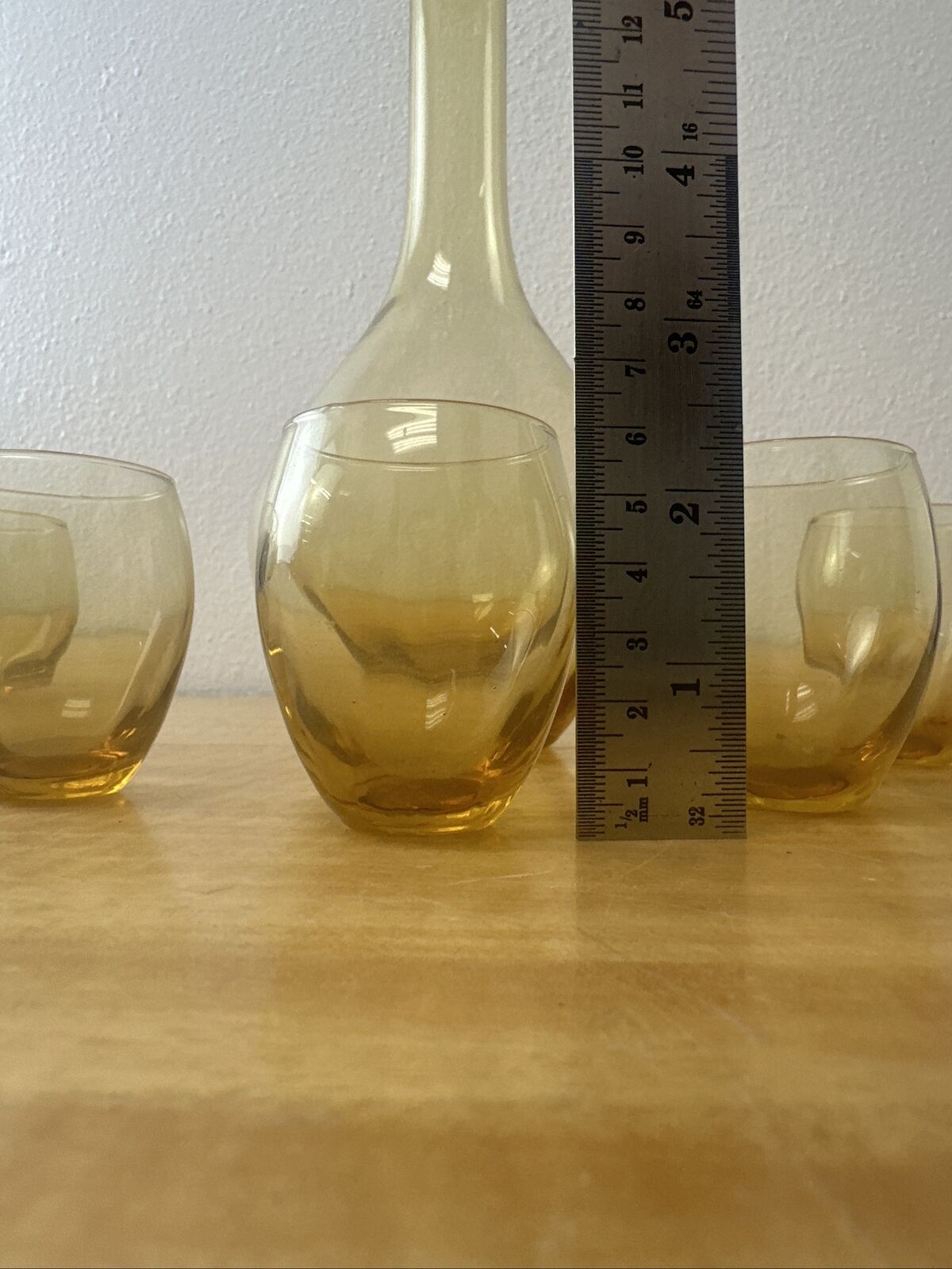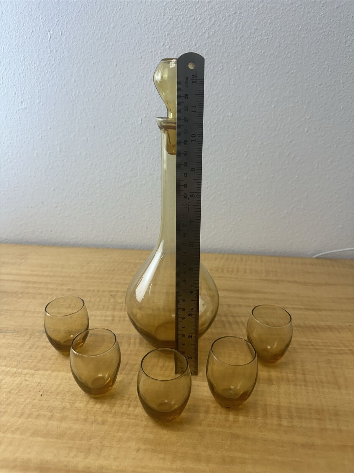 Vintage Italian Art Glass Yellow/Amber Wheat Decanter & 5 Matching Glasses