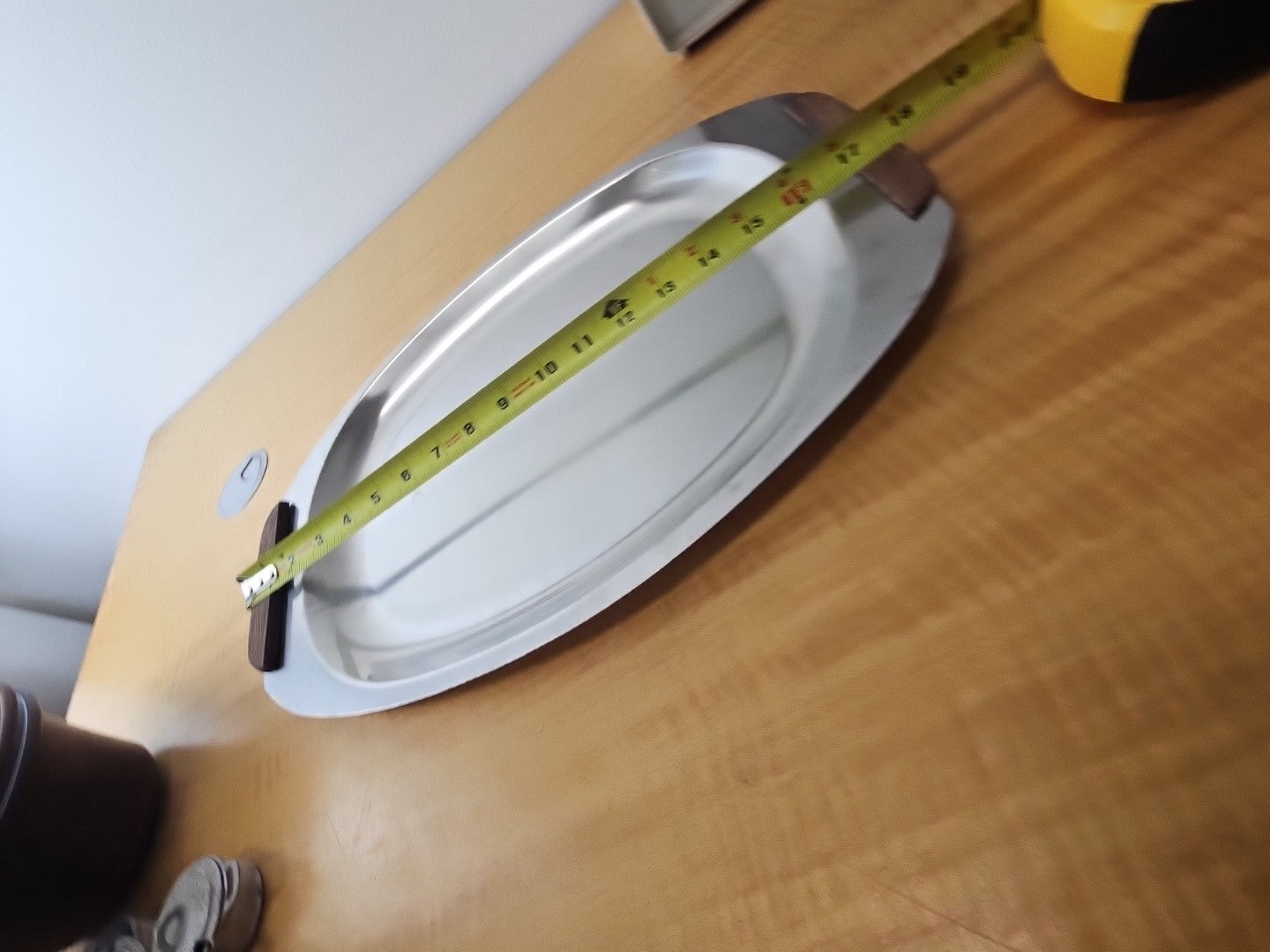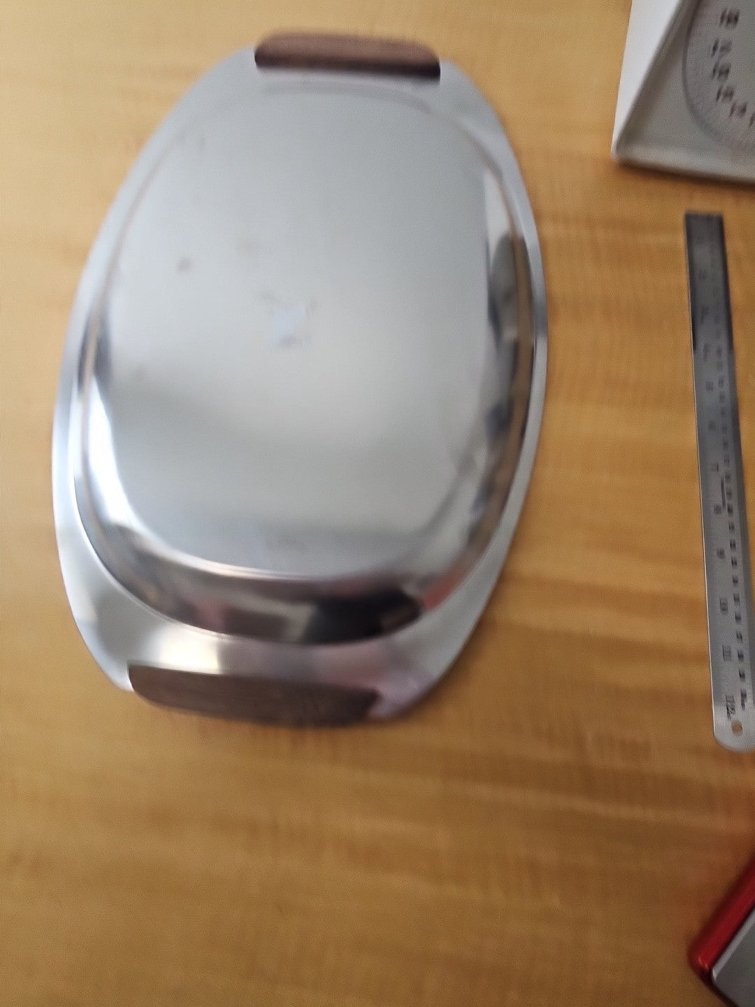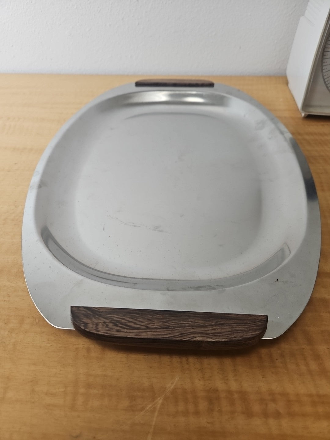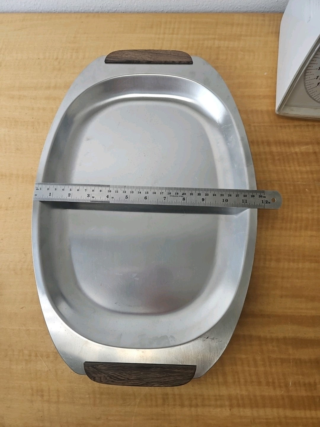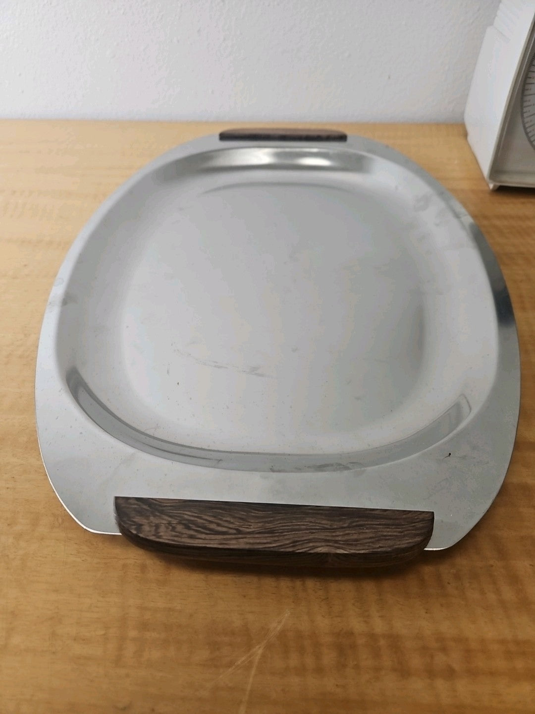 Vintage MCM Stainless Steel Serving Tray with Wooden Handles, 17 3/4 x 11 1/4"