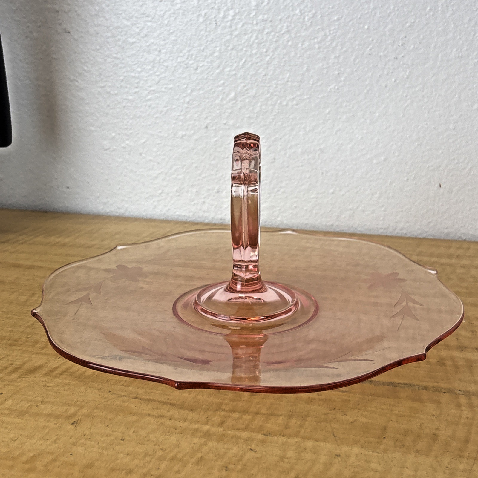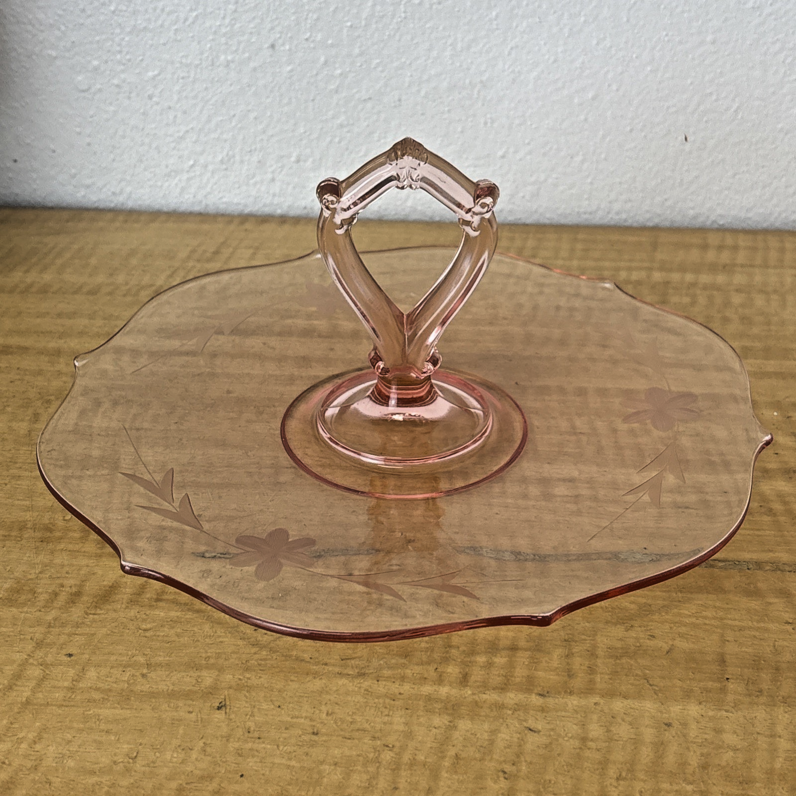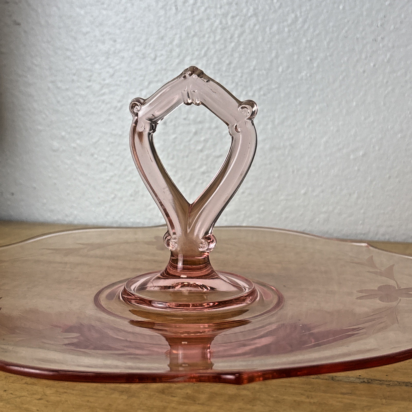Vintage Pink Depression Glass Single Tiered Snack Tray w/ Handle & Etched Flower