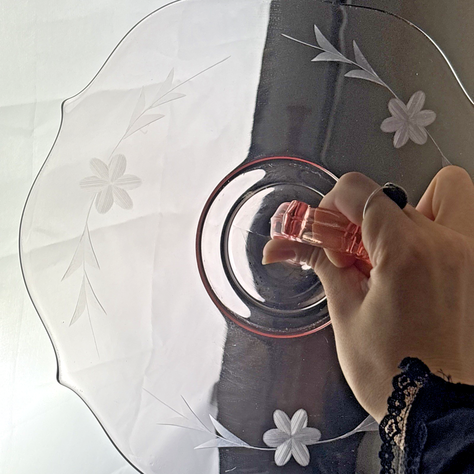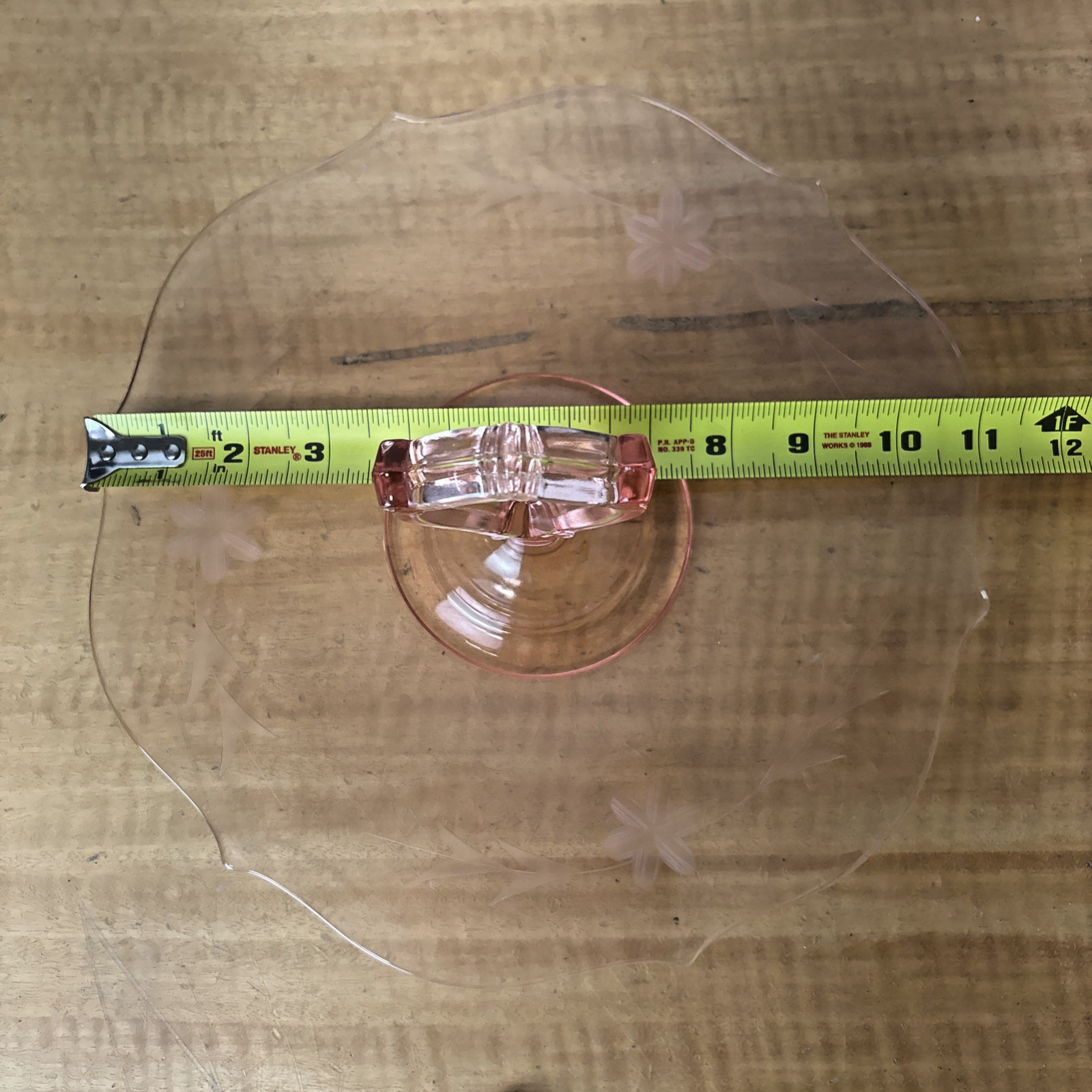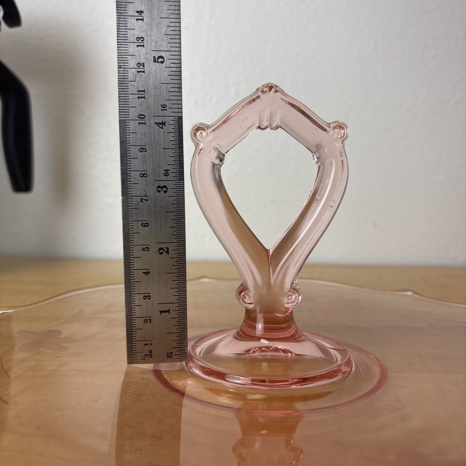 Vintage Pink Depression Glass Single Tiered Snack Tray w/ Handle & Etched Flower