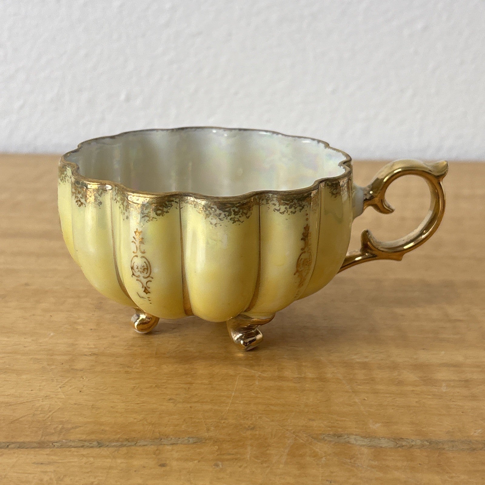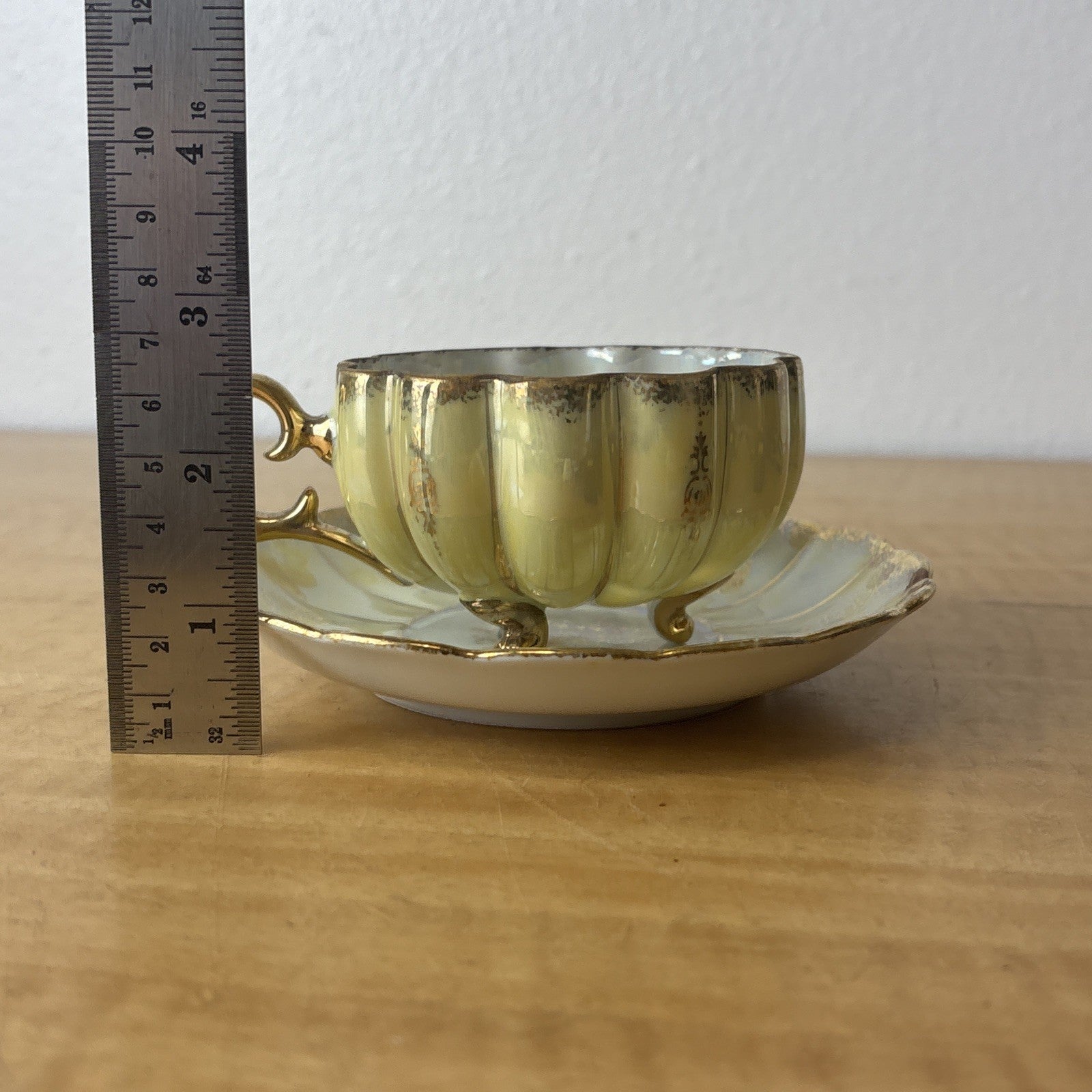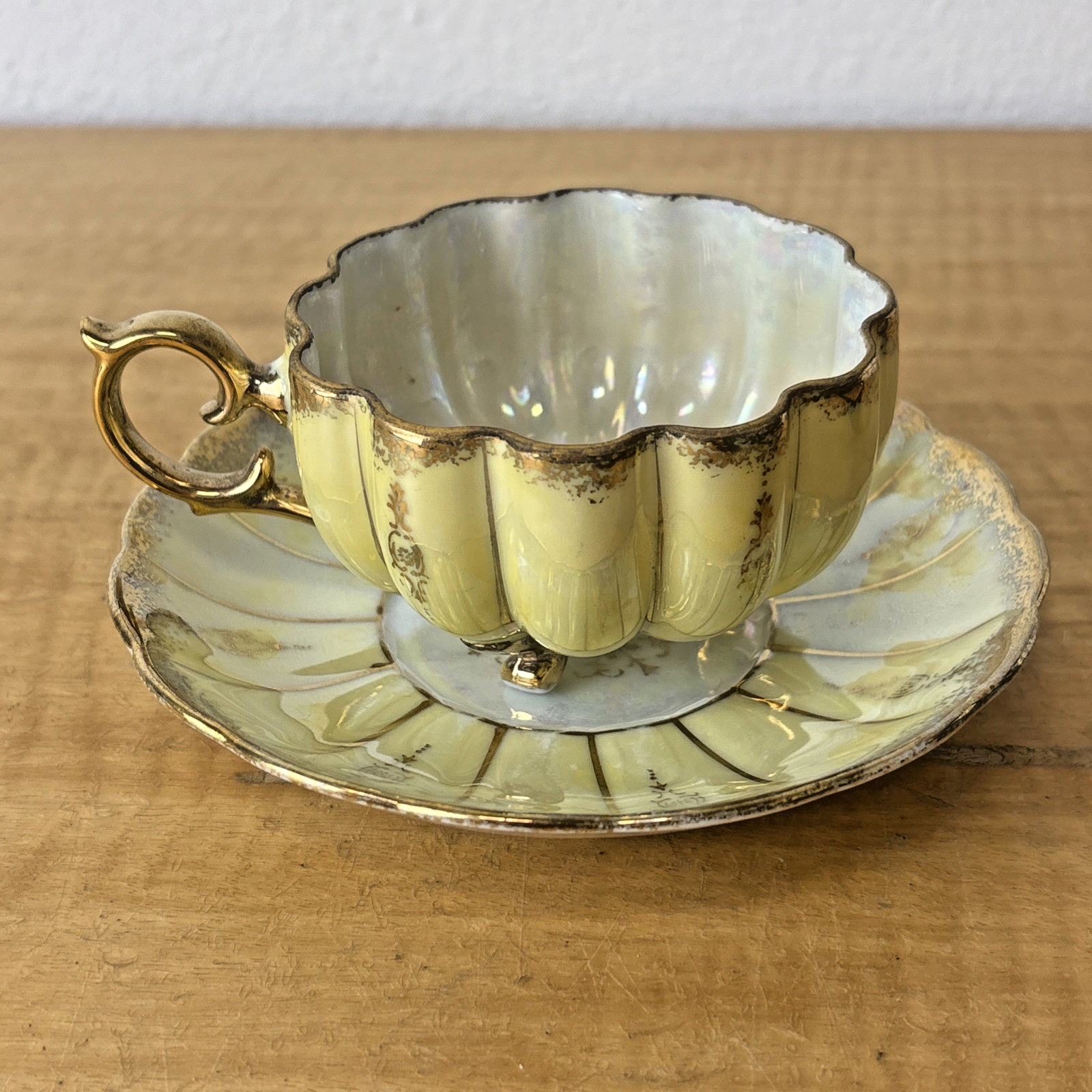Vintage Royal Sealy China Green & Gold Footed Tea Cup & Saucer Japan Iridescent