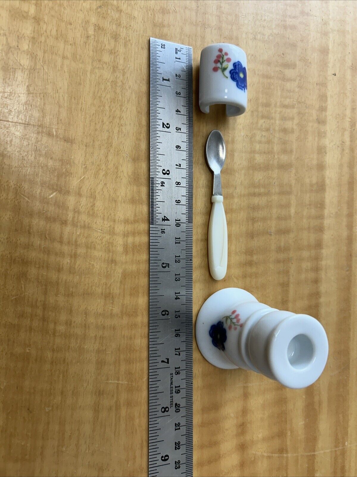 2 Candle Holders, 7 Spoons, 7 Napkin Rings, 7 Teacups, 7 Smaller plates, 7 Larger plates, 1 Cream Pitcher, 1 Tray