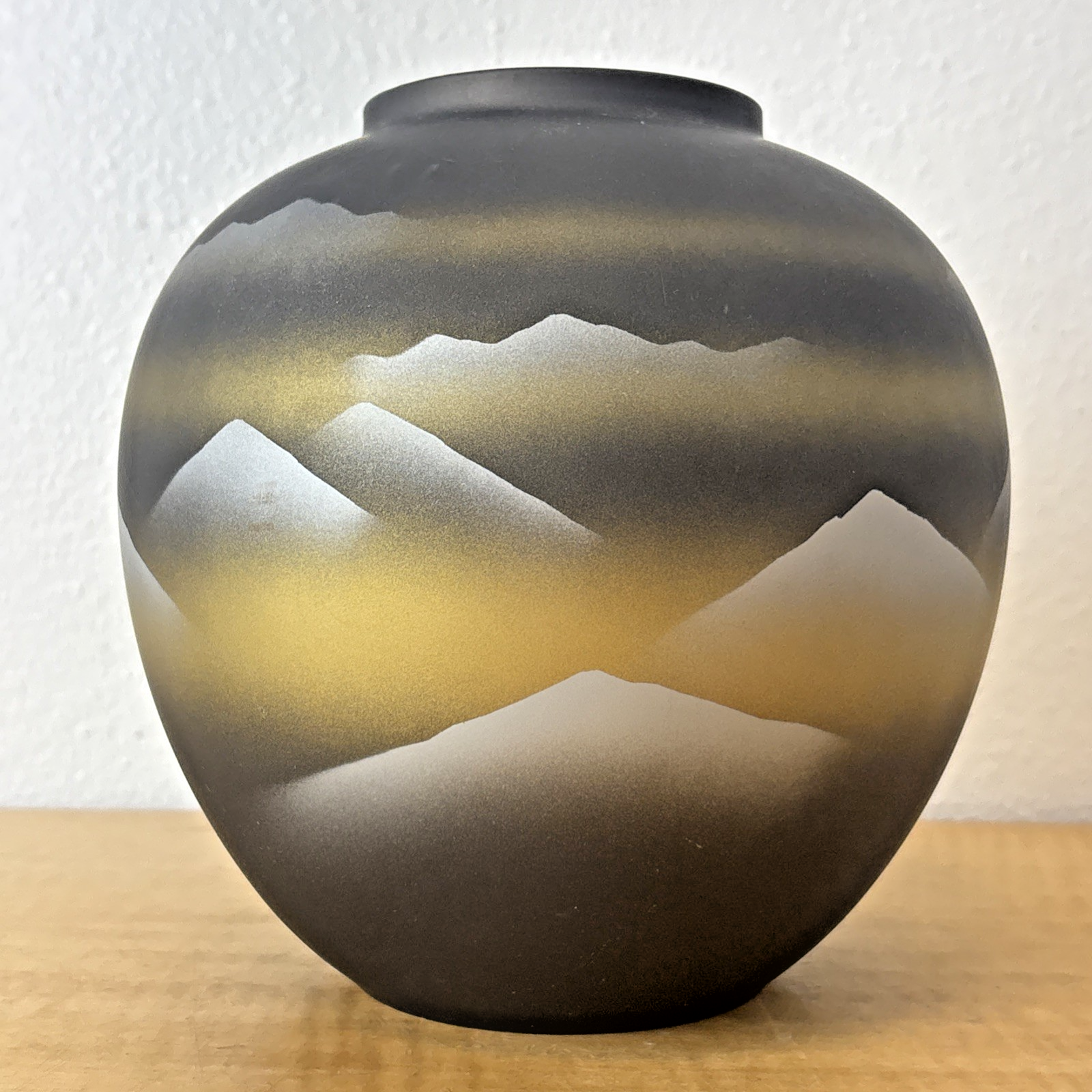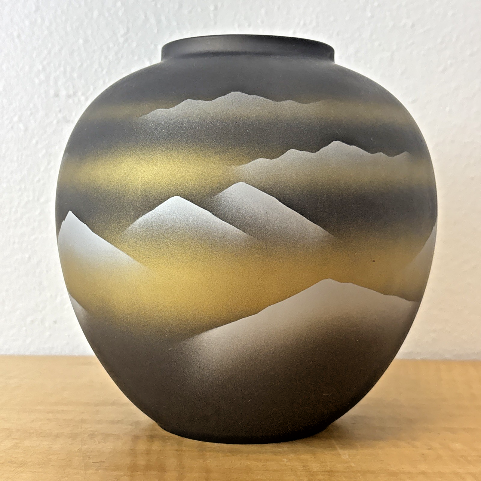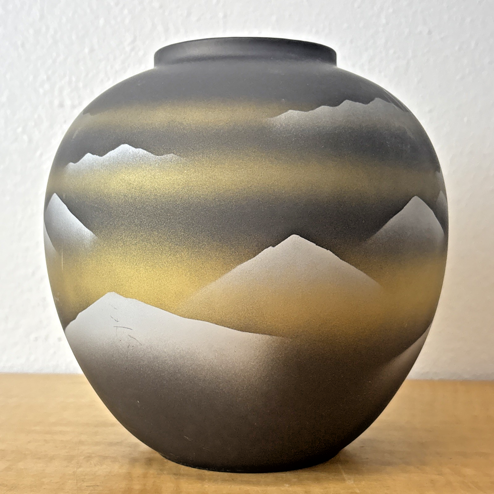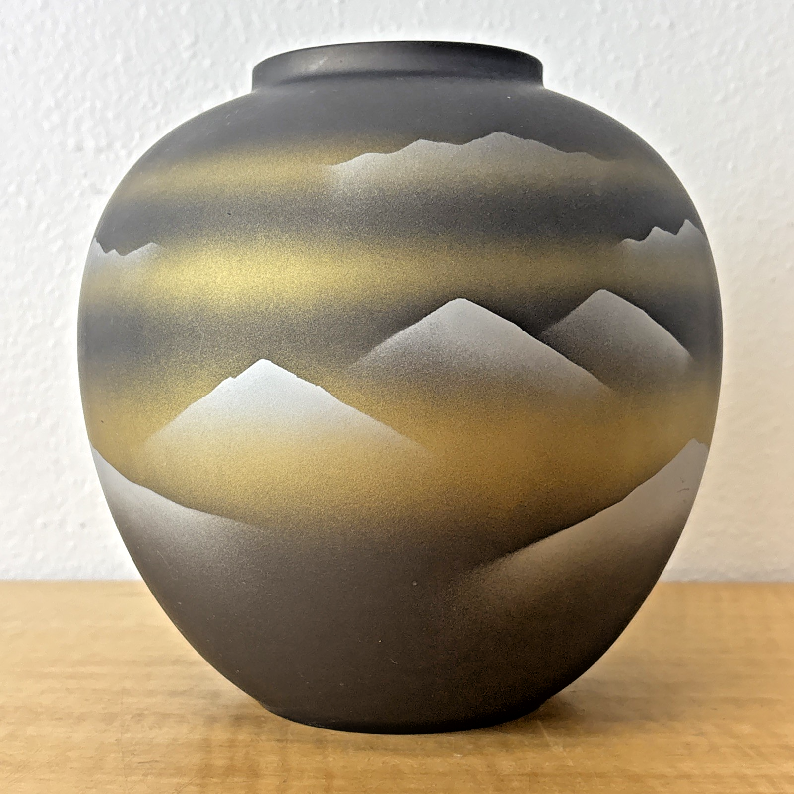Vintage Tajimi Japanese Ceramic Vase with Stylized Mountain Scene – Gray, Gold