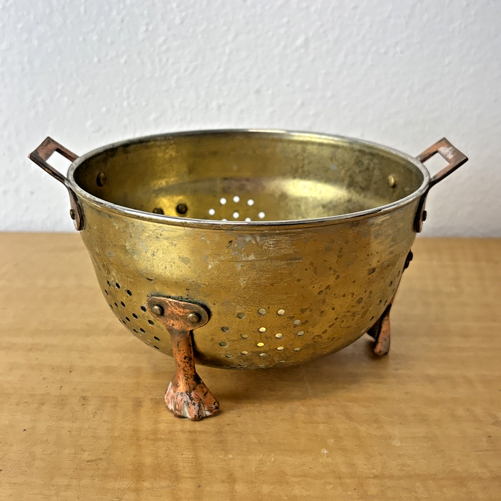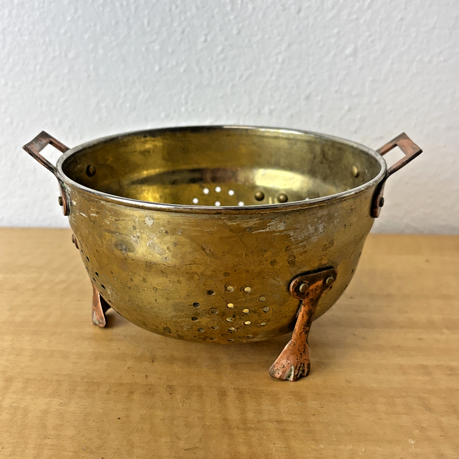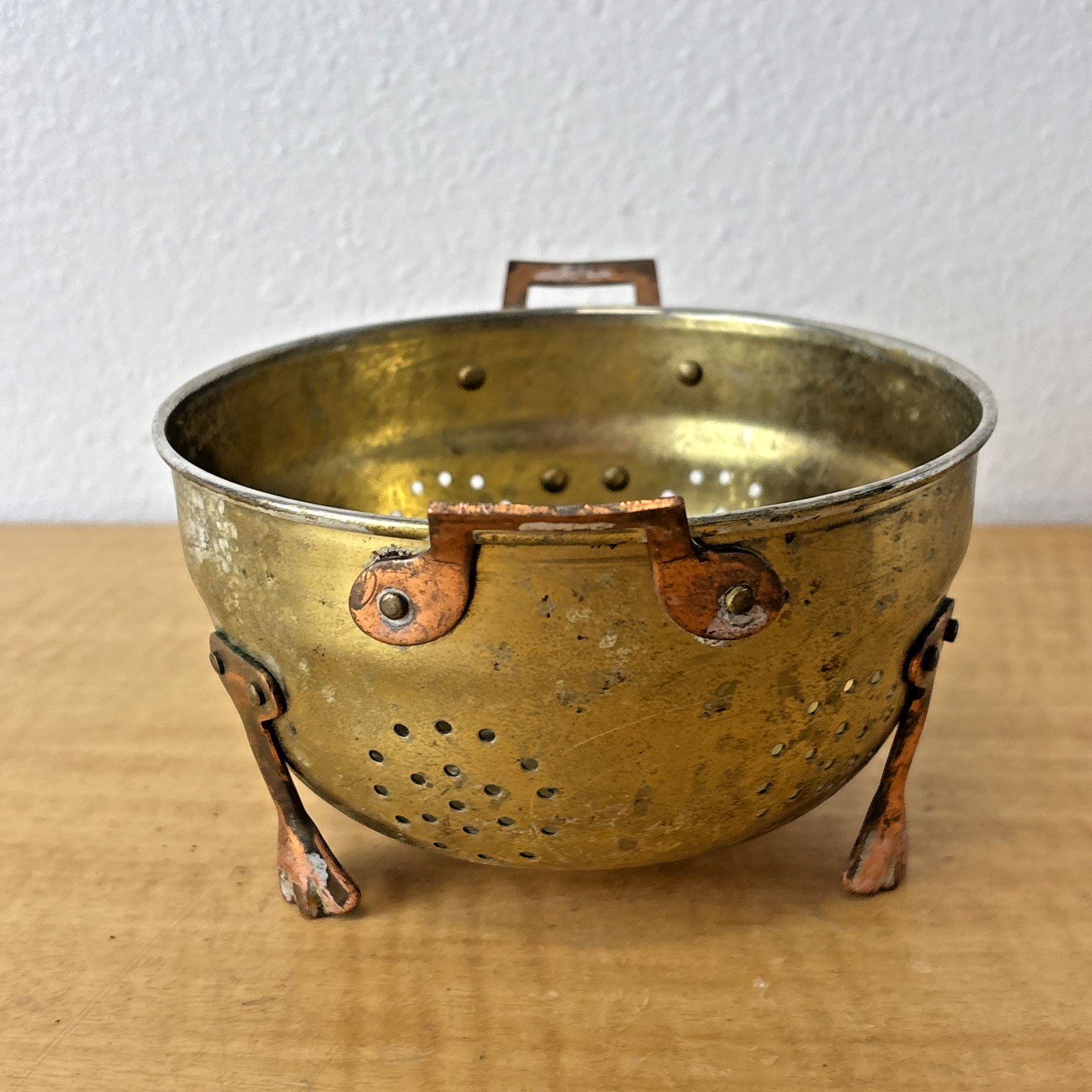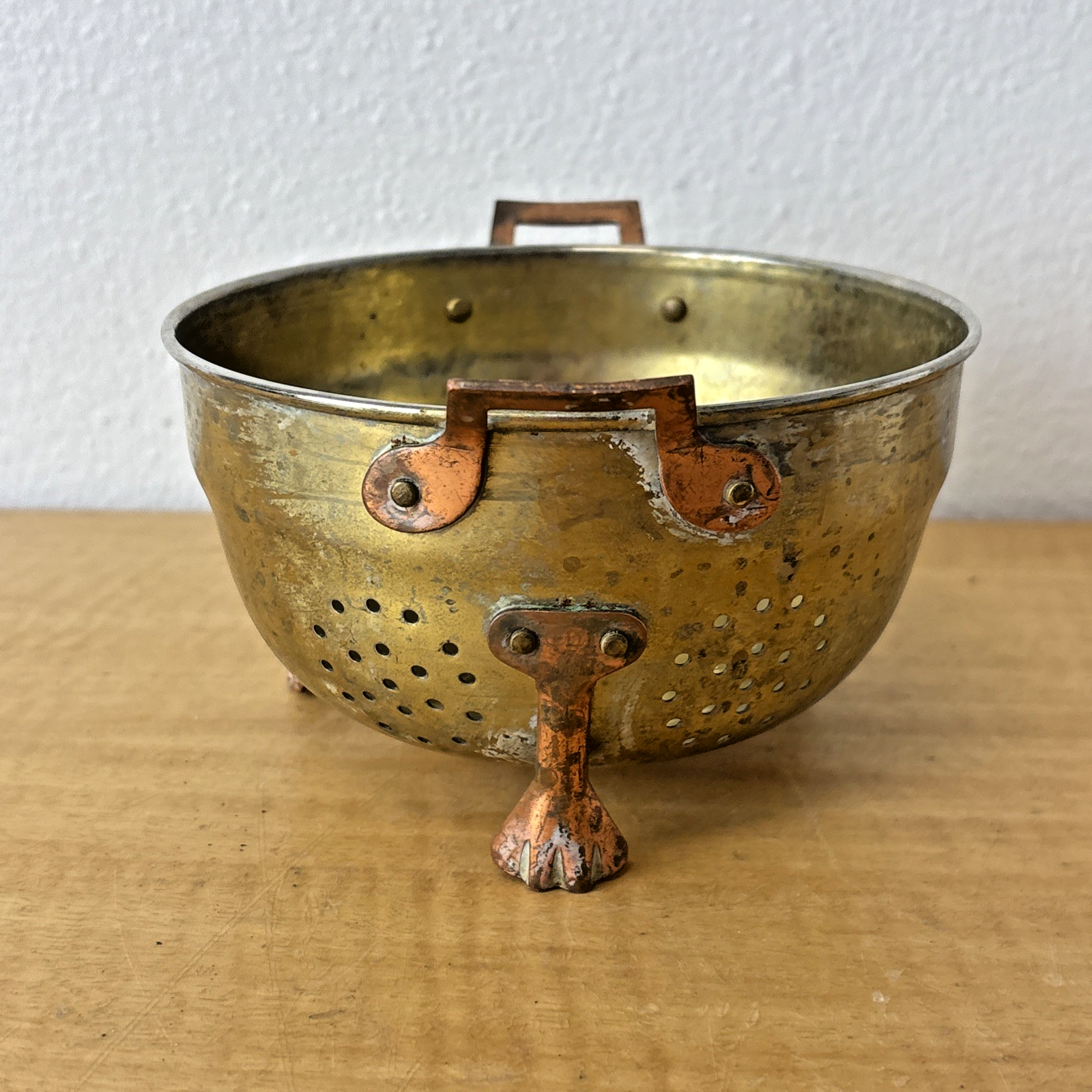 Vintage Three Footed Two Handled Metal ( Copper & Brass ? ) Colander Pot