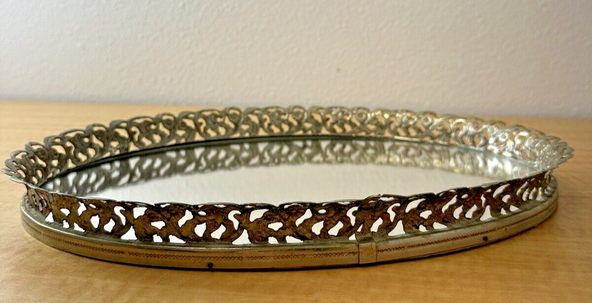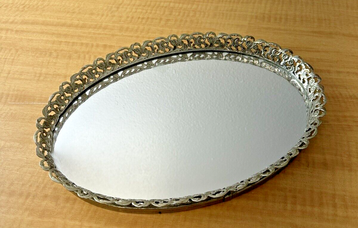 VTG 70s Regency MCM Glamour Large Brass Silver Mirrored Perfume Vanity Tray