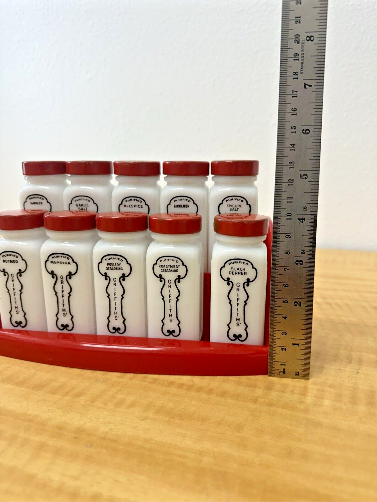VTG DECO KITCHEN SET OF 12 GRIFFITHS SPICE JARS, MILK GLASS IN RED PLASTIC RACK