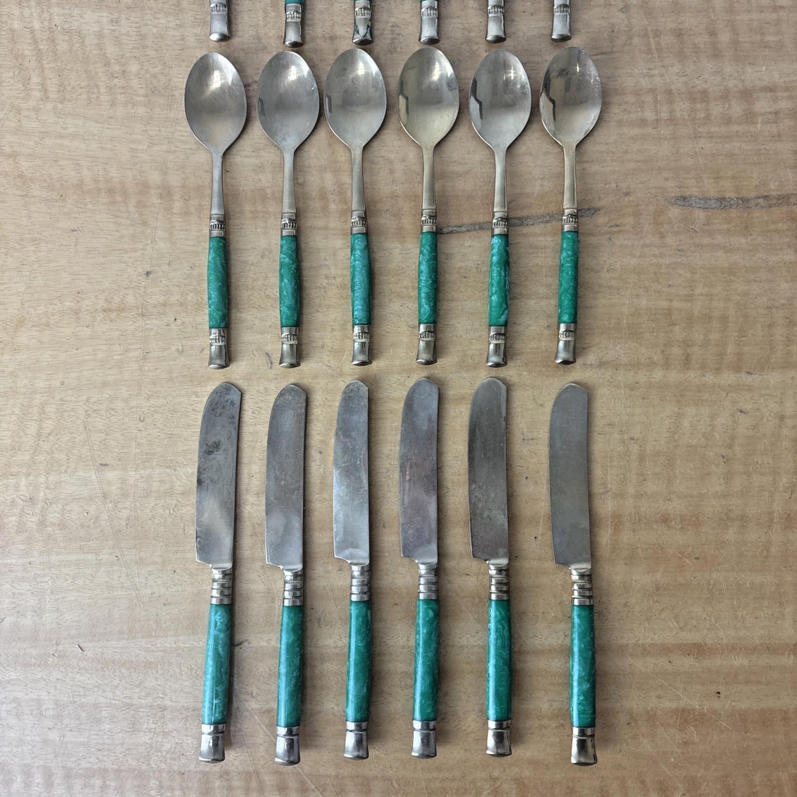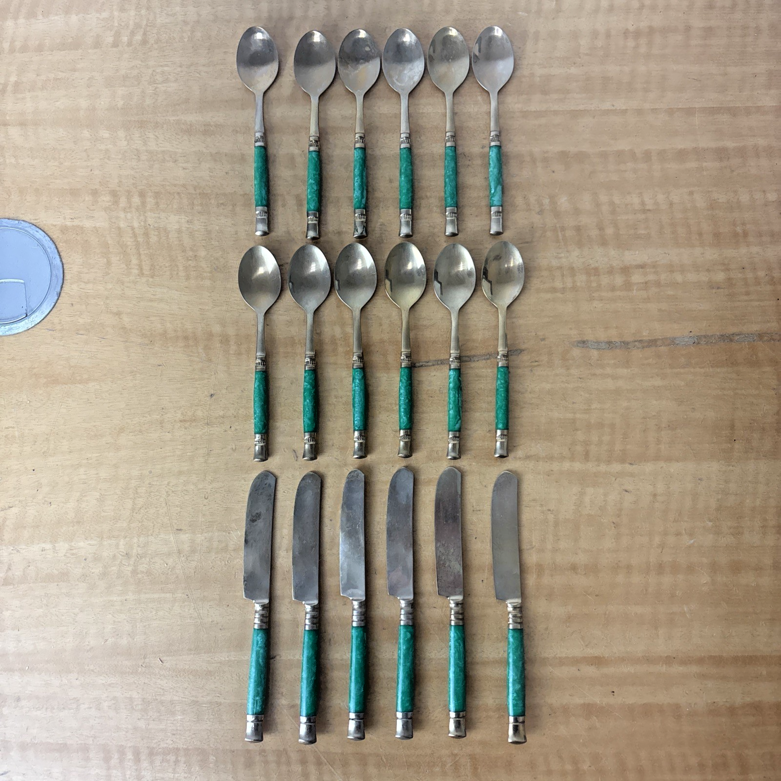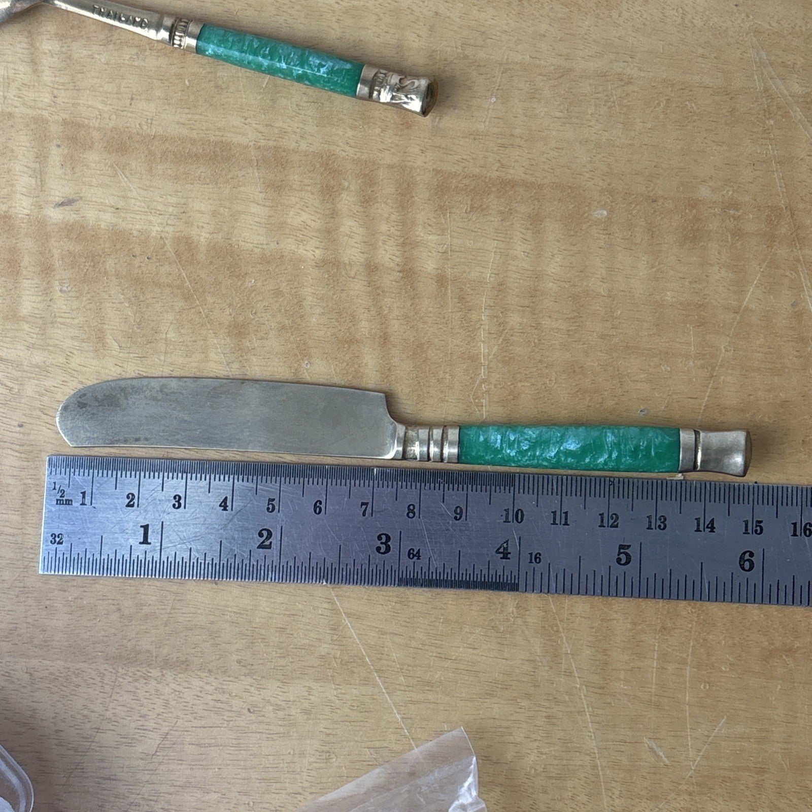 VTG Green Bakelite Gold Handle Set of Appetizer Utensils 6 Knives 12 Spoons
