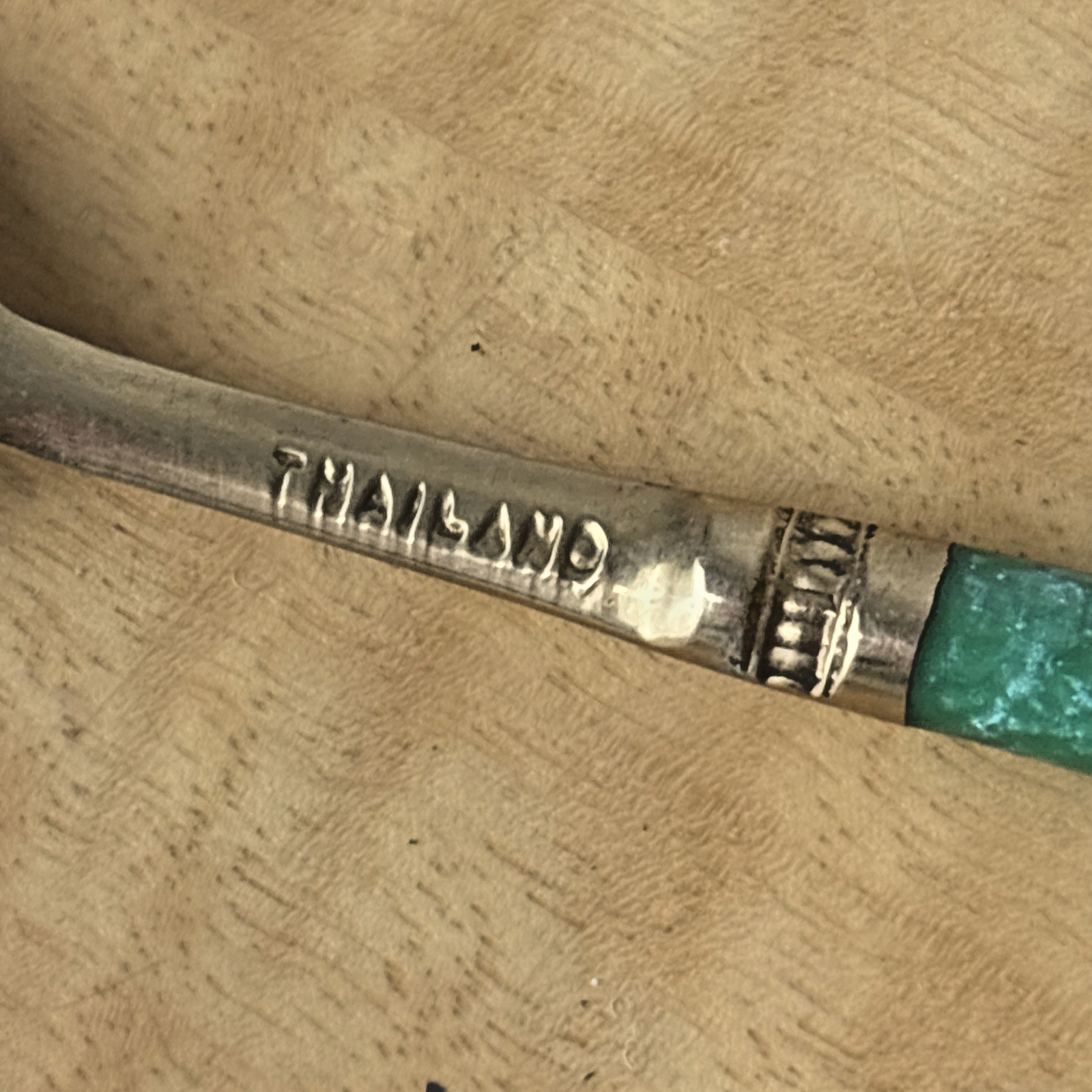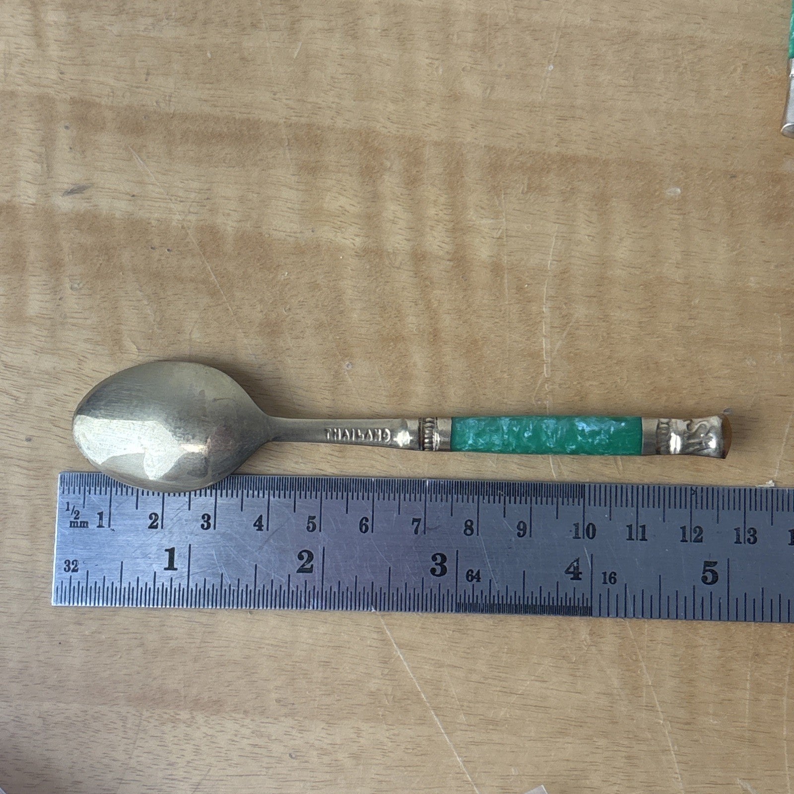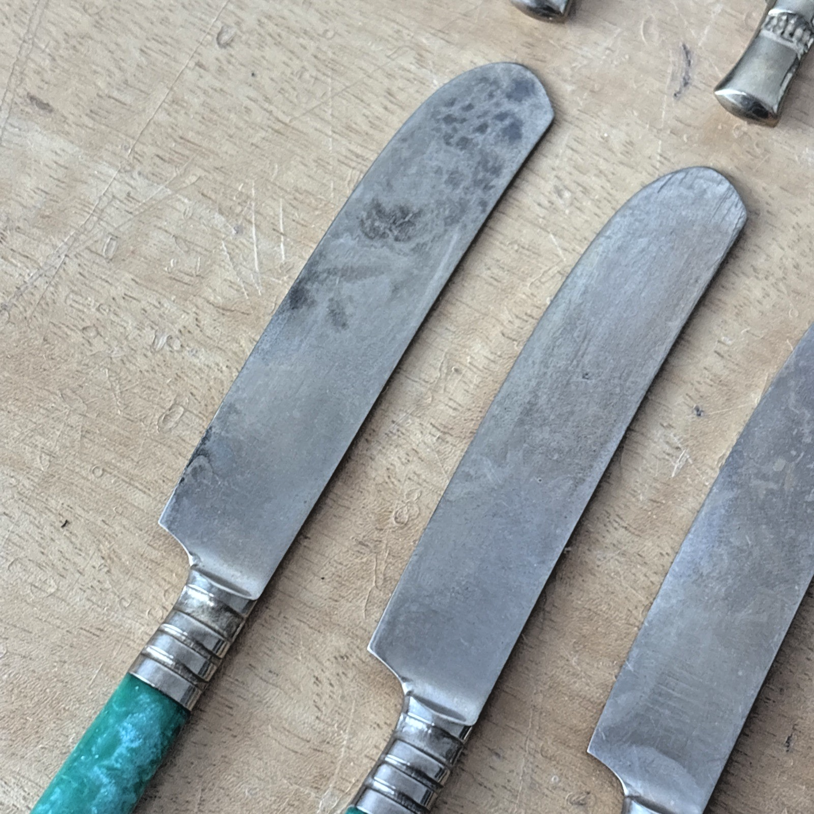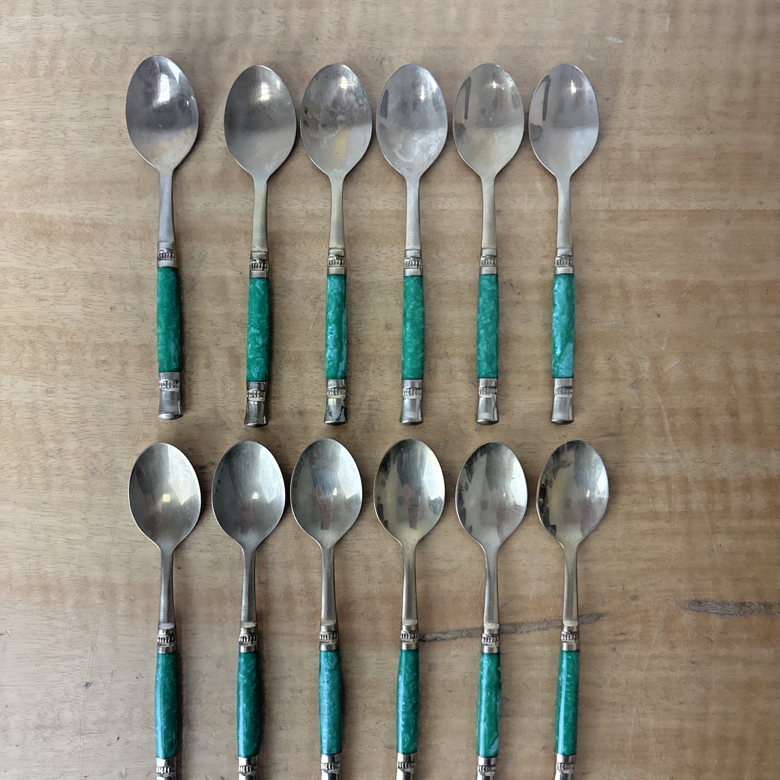 VTG Green Bakelite Gold Handle Set of Appetizer Utensils 6 Knives 12 Spoons