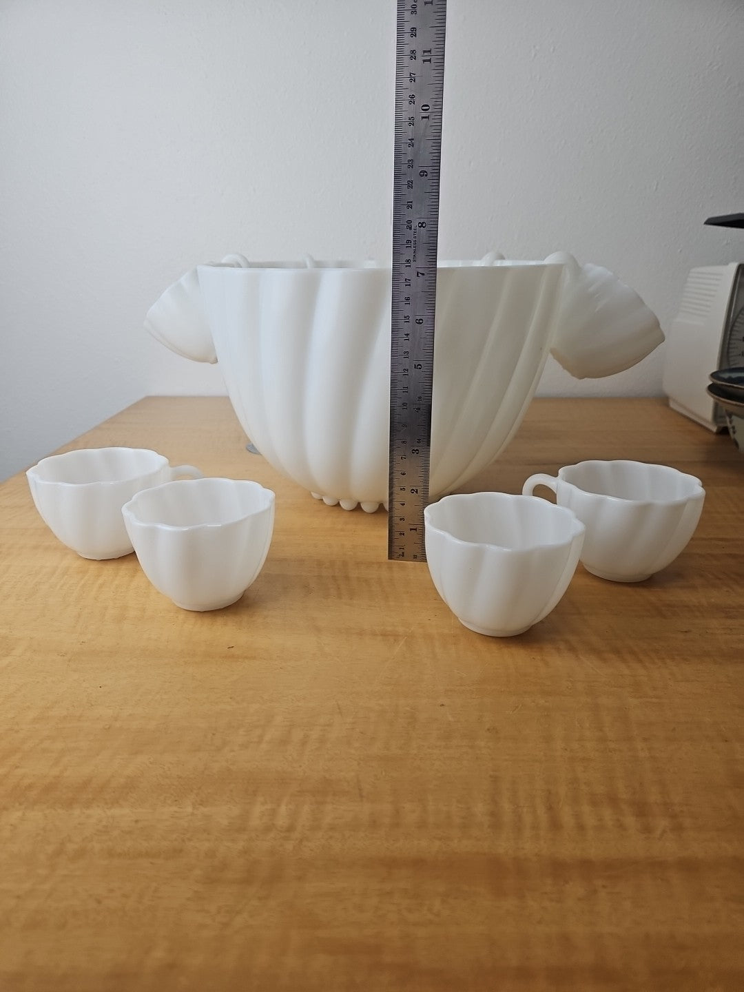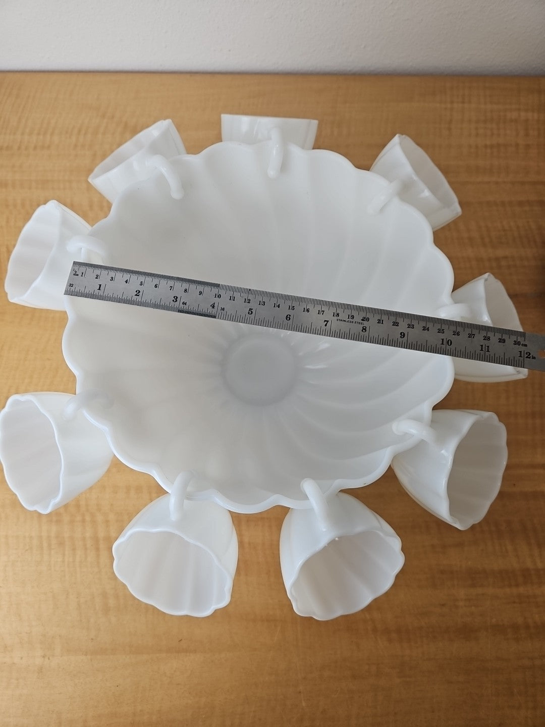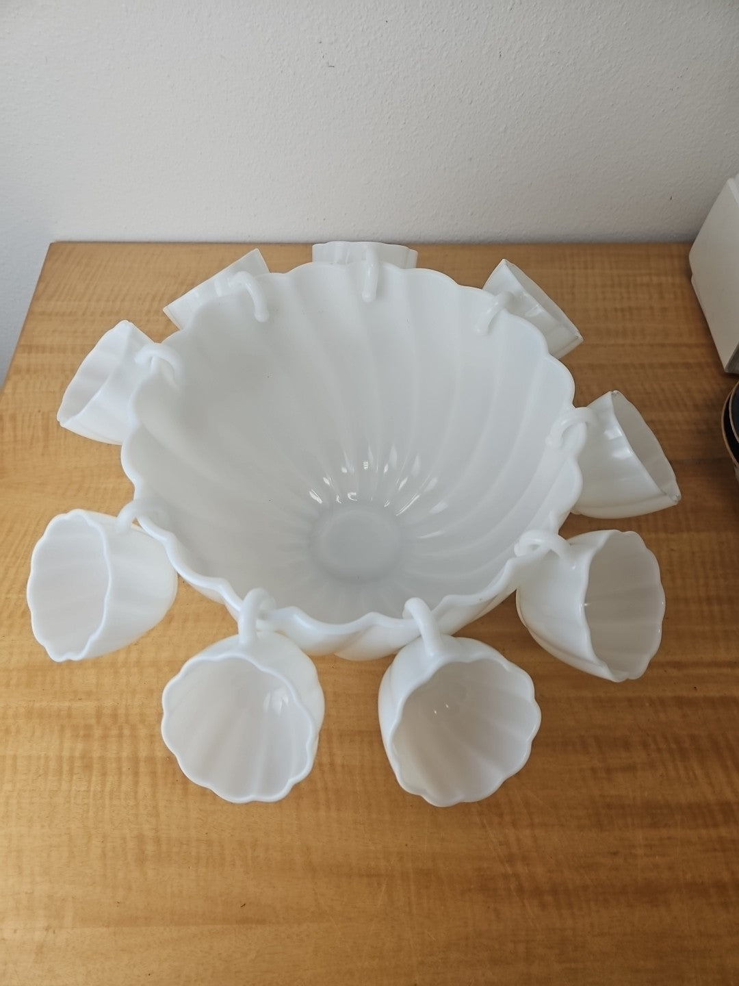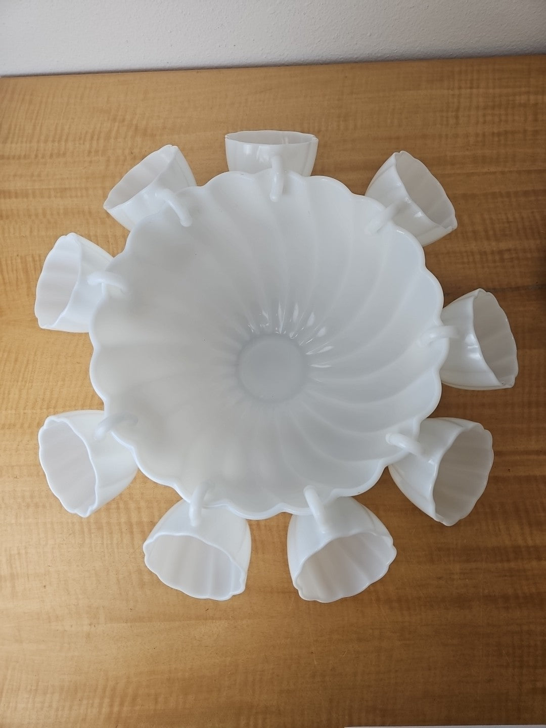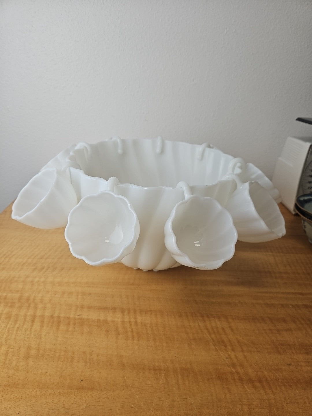 White Milk Glass Punchbowl and 9 Matching Hangable Cups Scalloped Vintage 10.5"