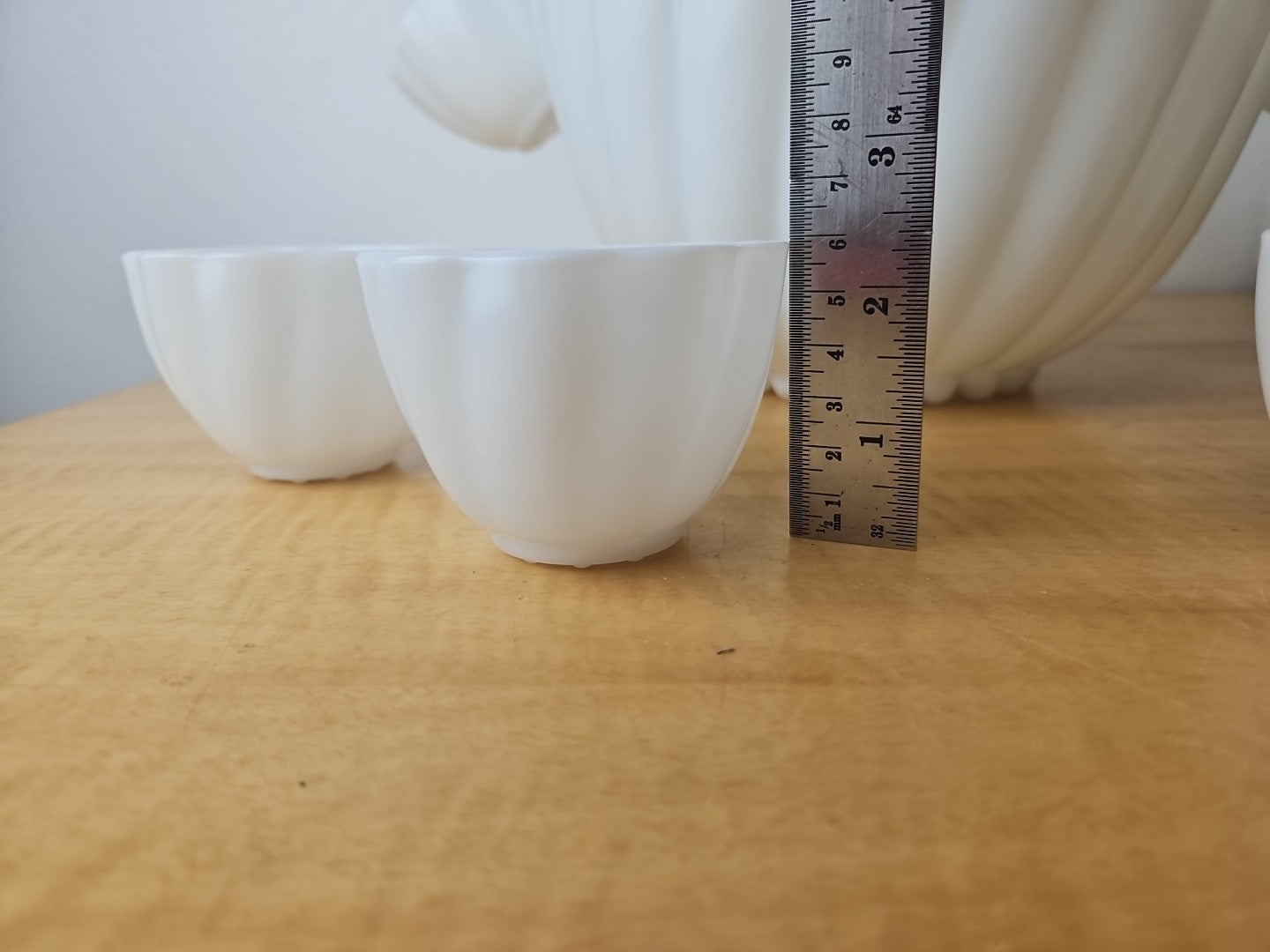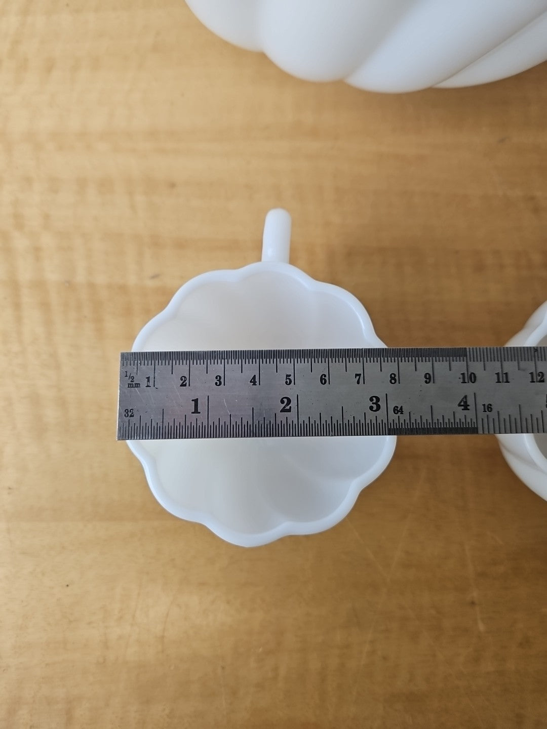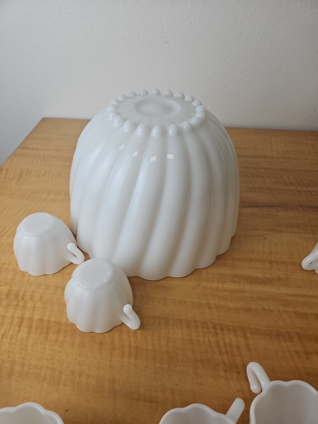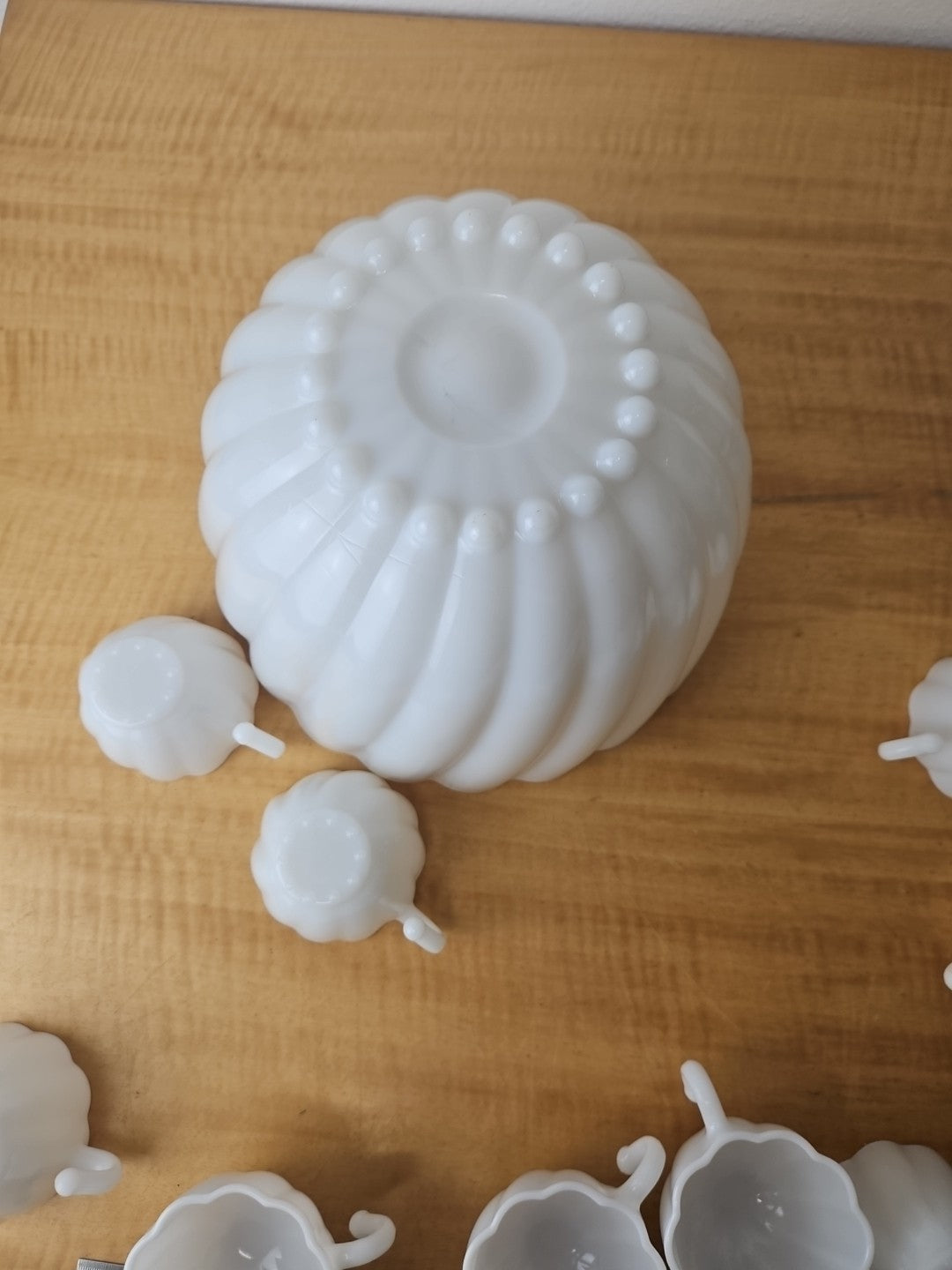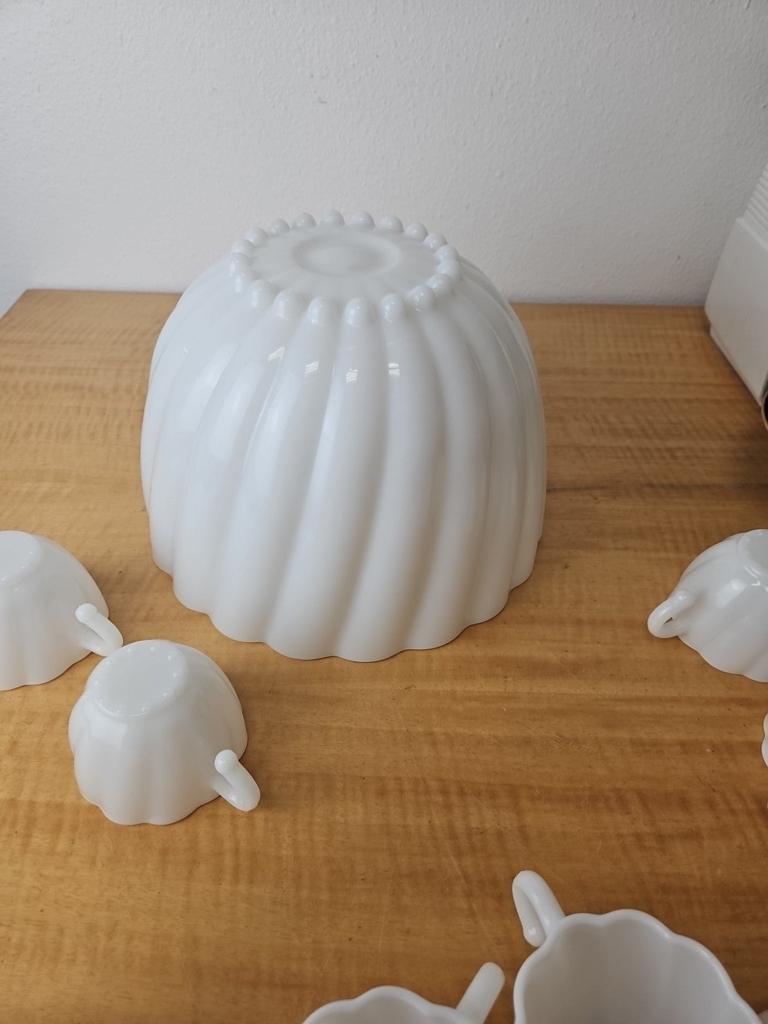 White Milk Glass Punchbowl and 9 Matching Hangable Cups Scalloped Vintage 10.5"