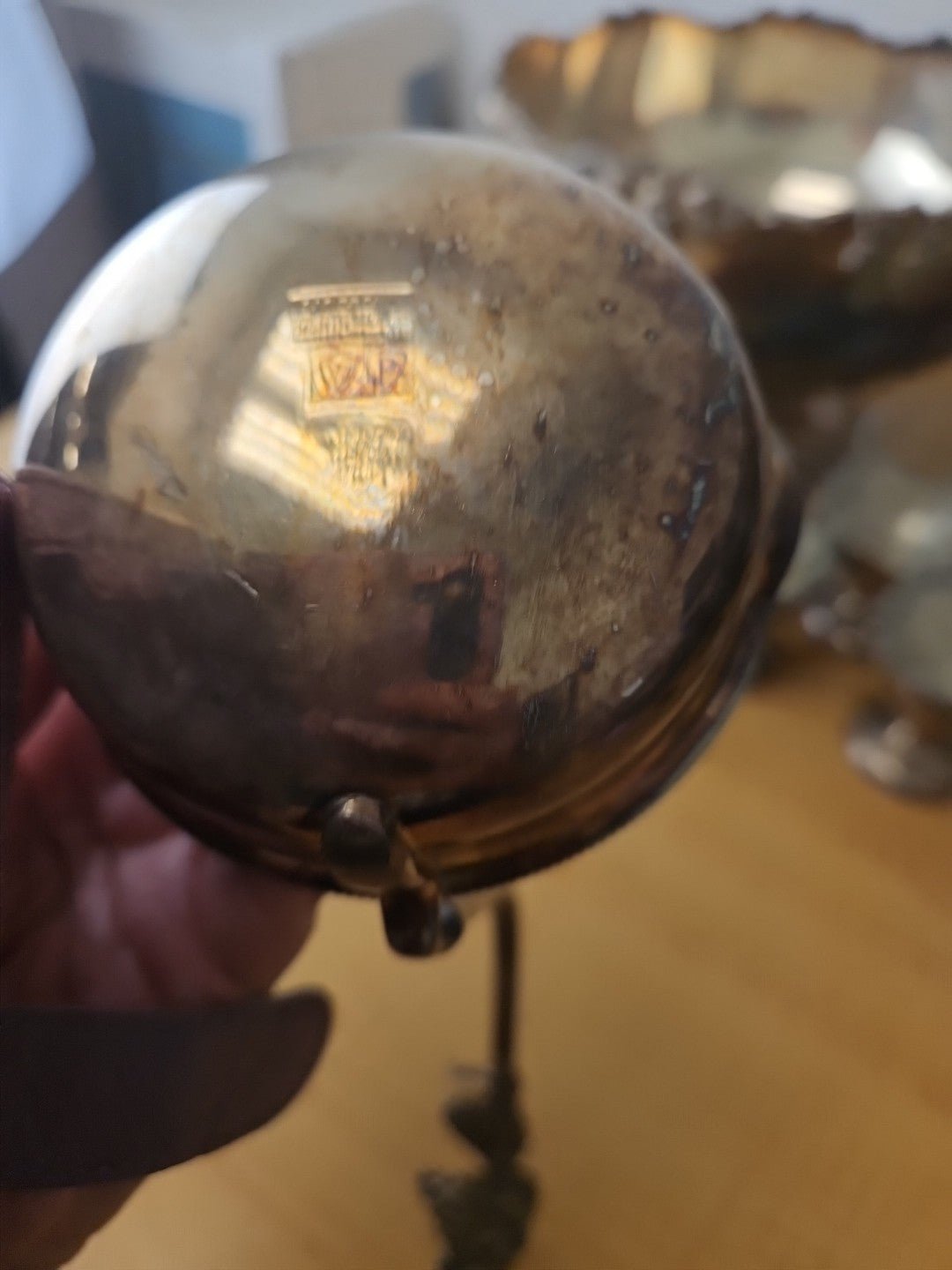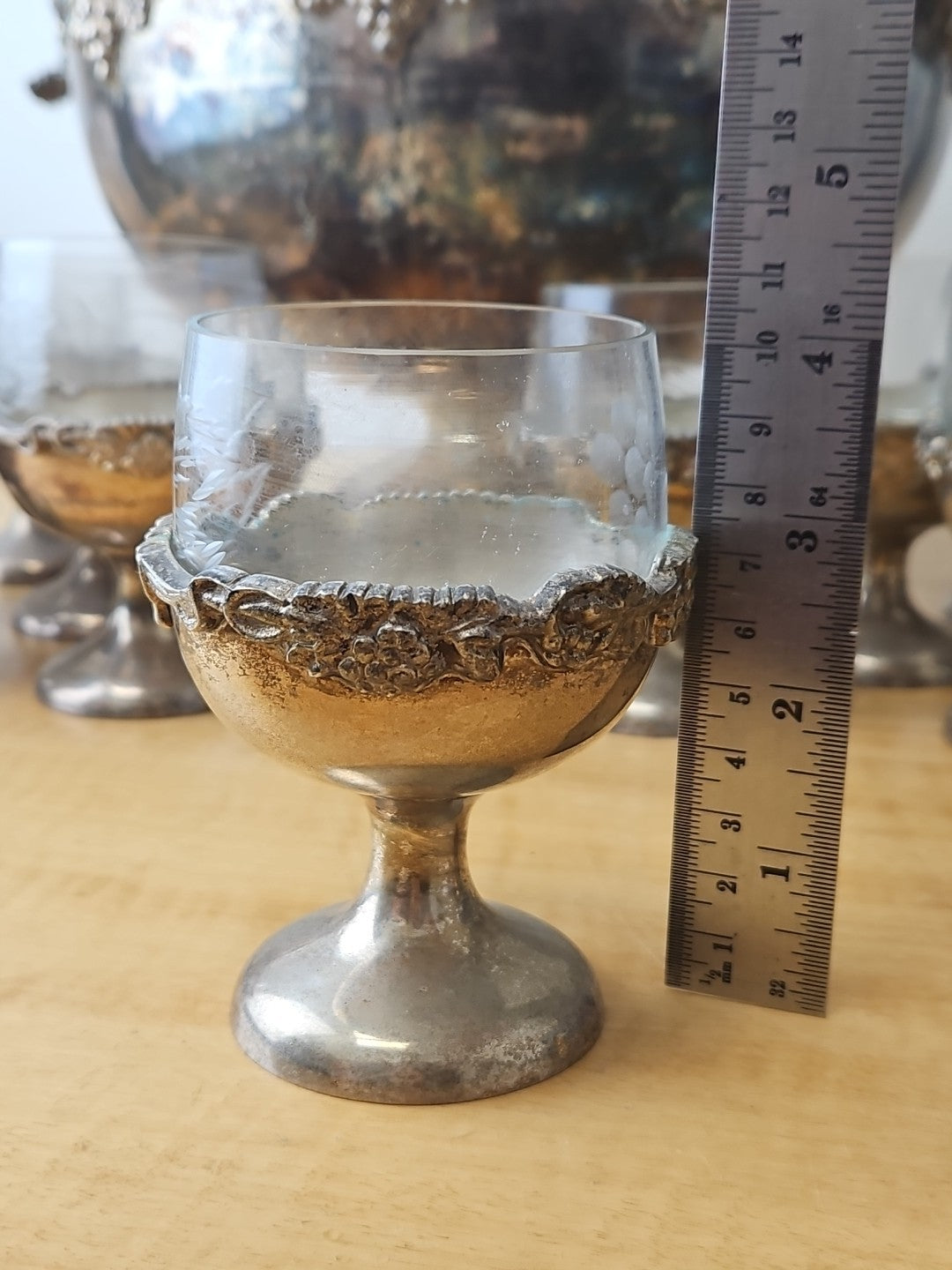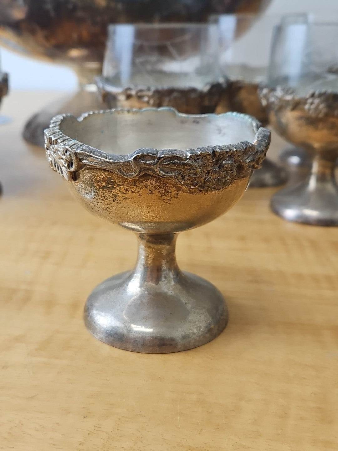 Condition Description: needs polishing, 1 cup not original, 1 cup has a tiny chip in the rim.