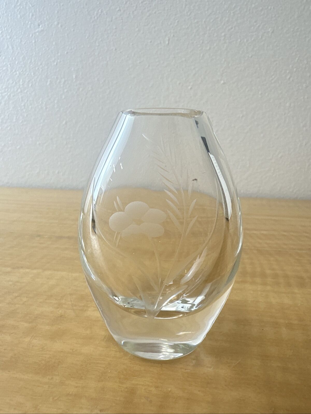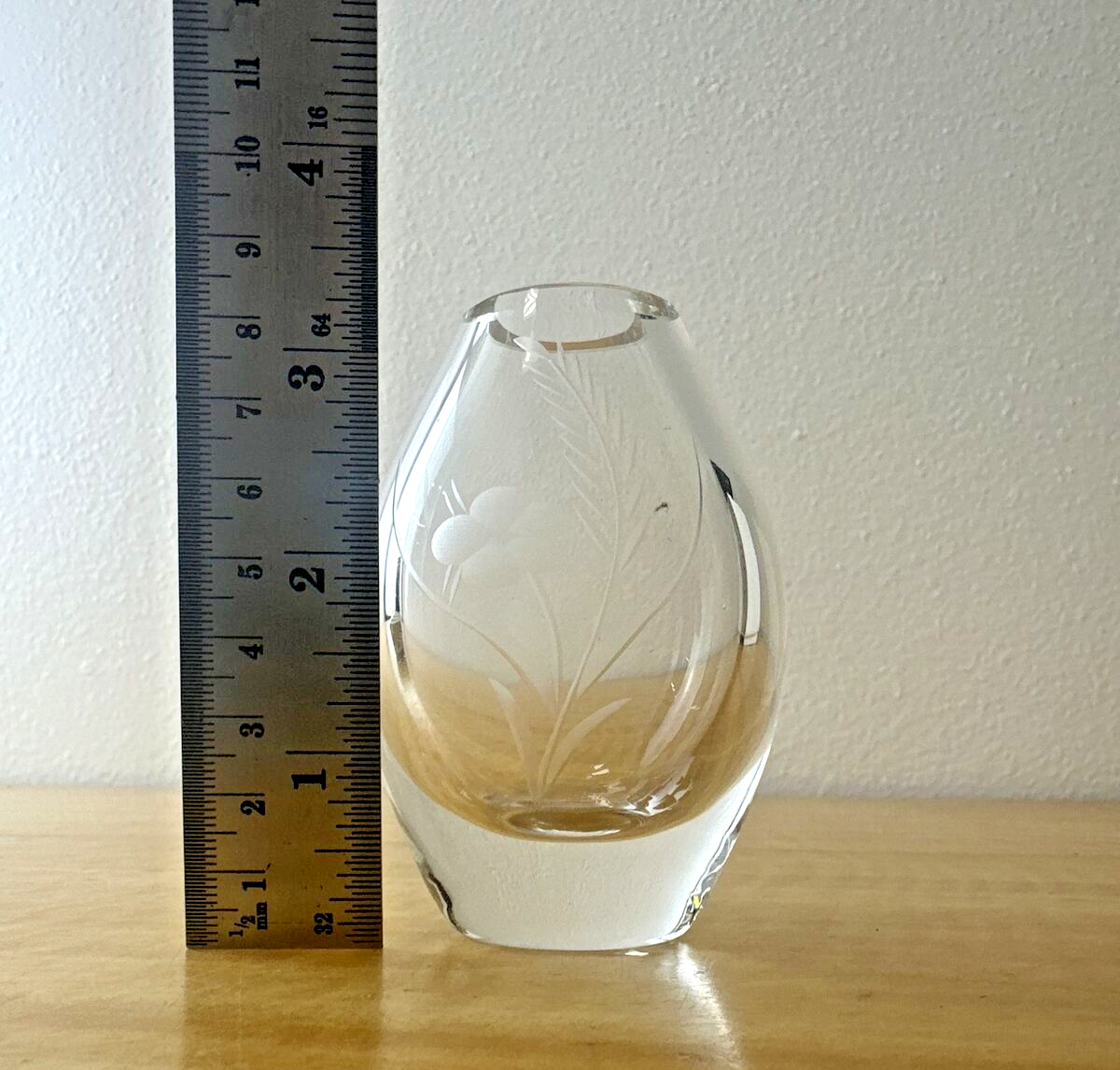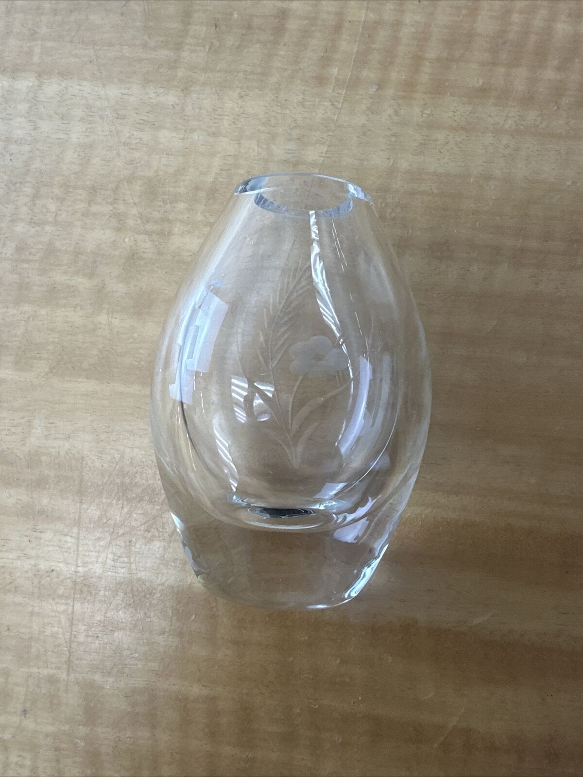 Clear Thick Glass Bud Vase Etched Flower Heavy Oval 3.5 Inch
