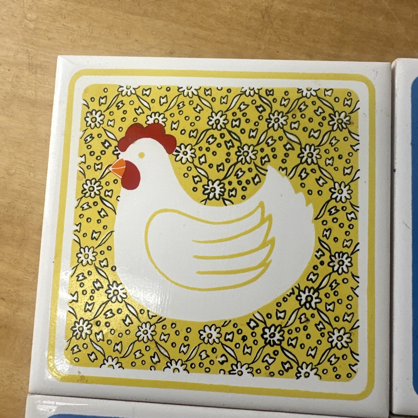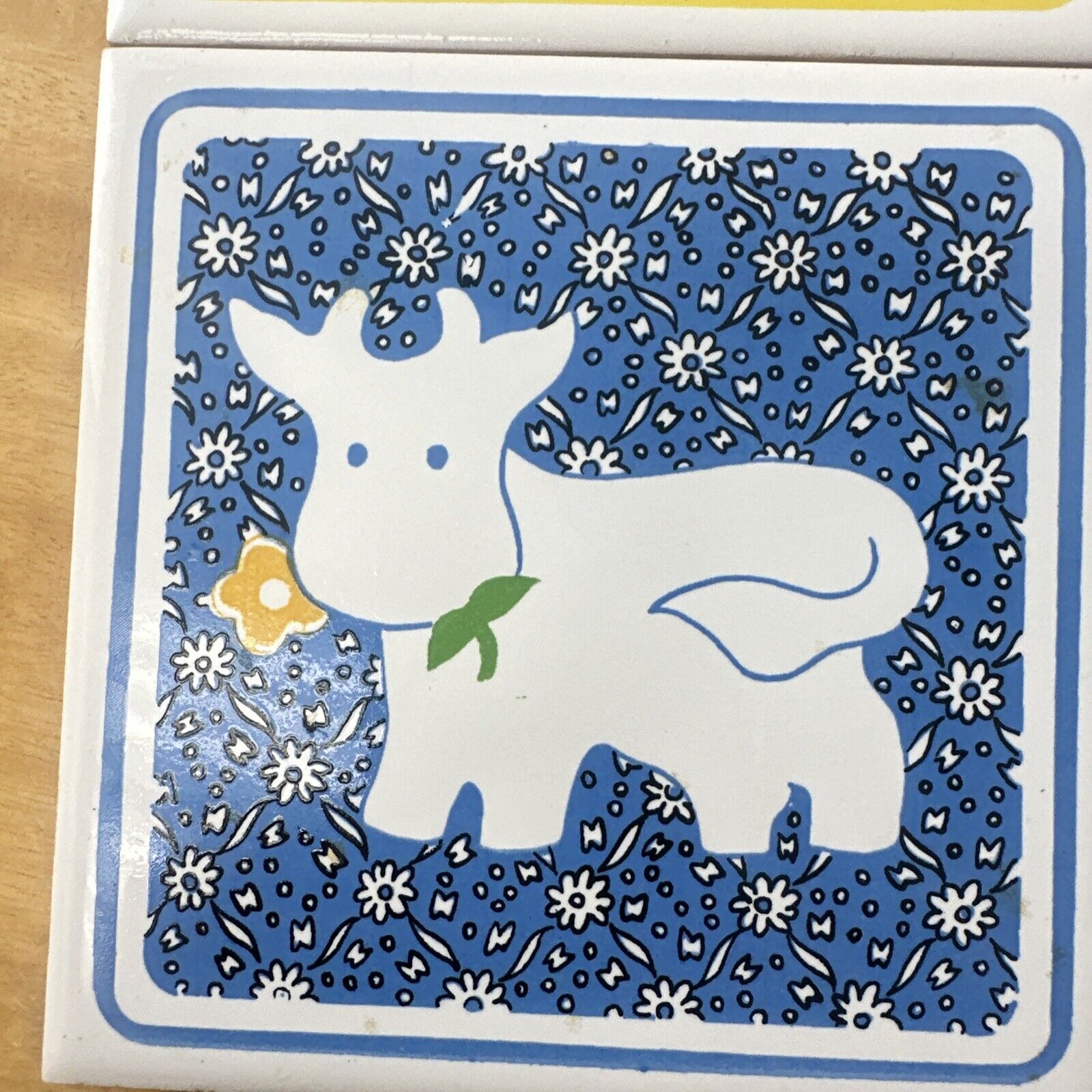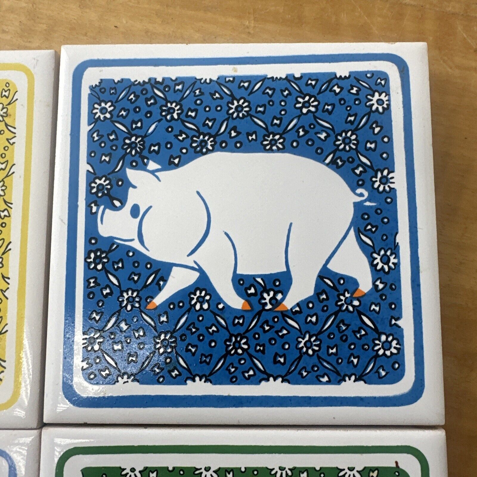 VINTAGE FARM ANIMAL COUNTRY CALICO CERAMIC TILE TRIVETS COASTER SET OF 4