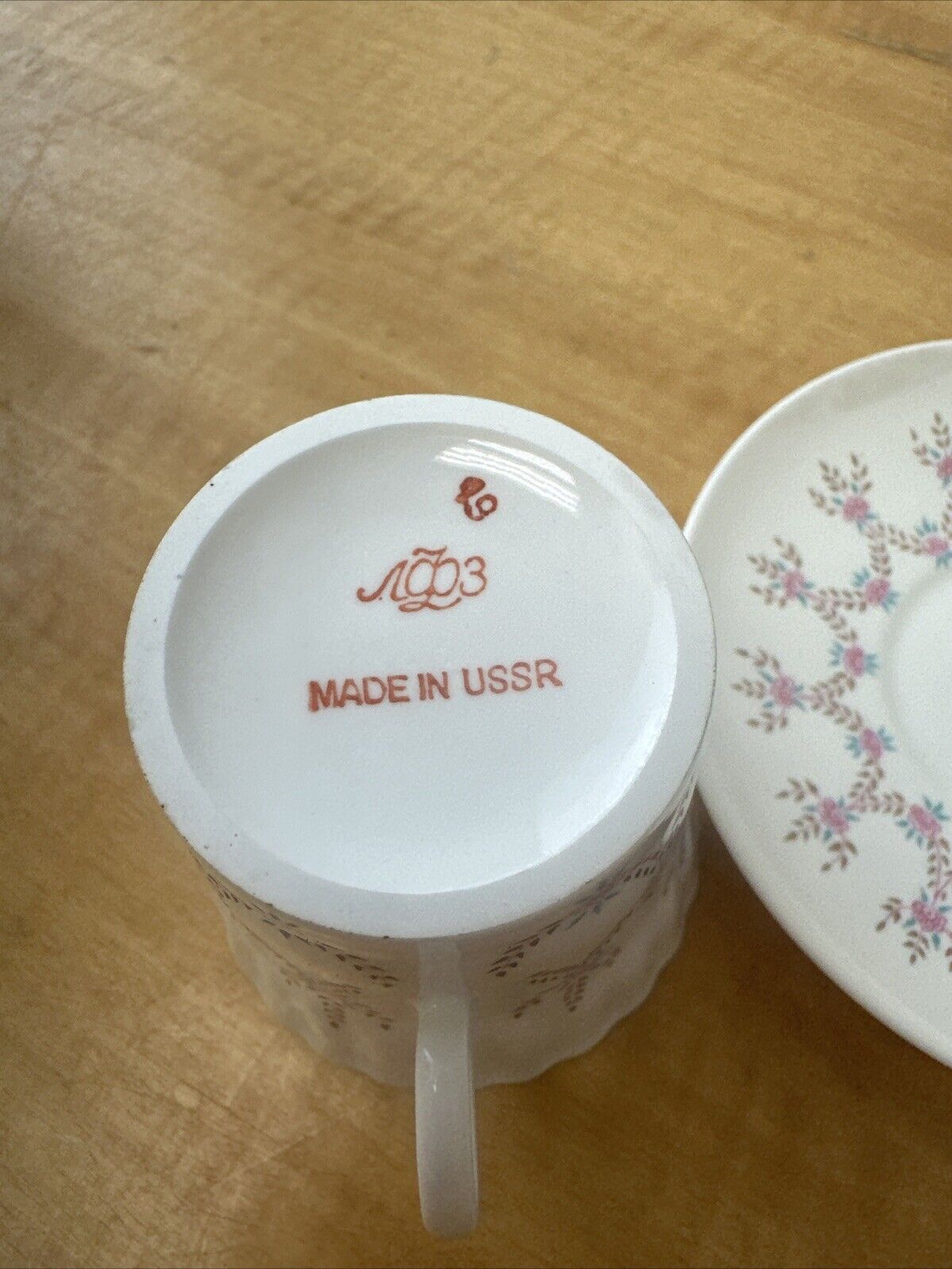 Lomonosov Teacup and Saucer Pink Flowers Green Leaves Russia USSR Vintage