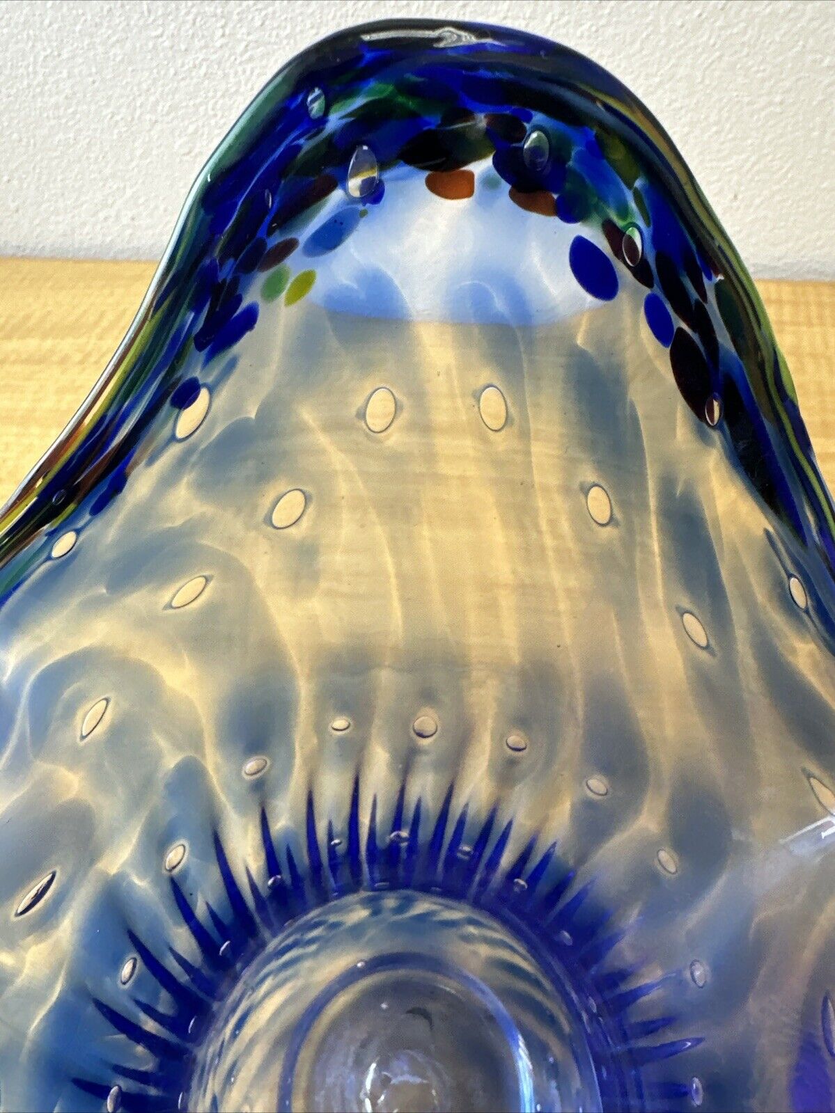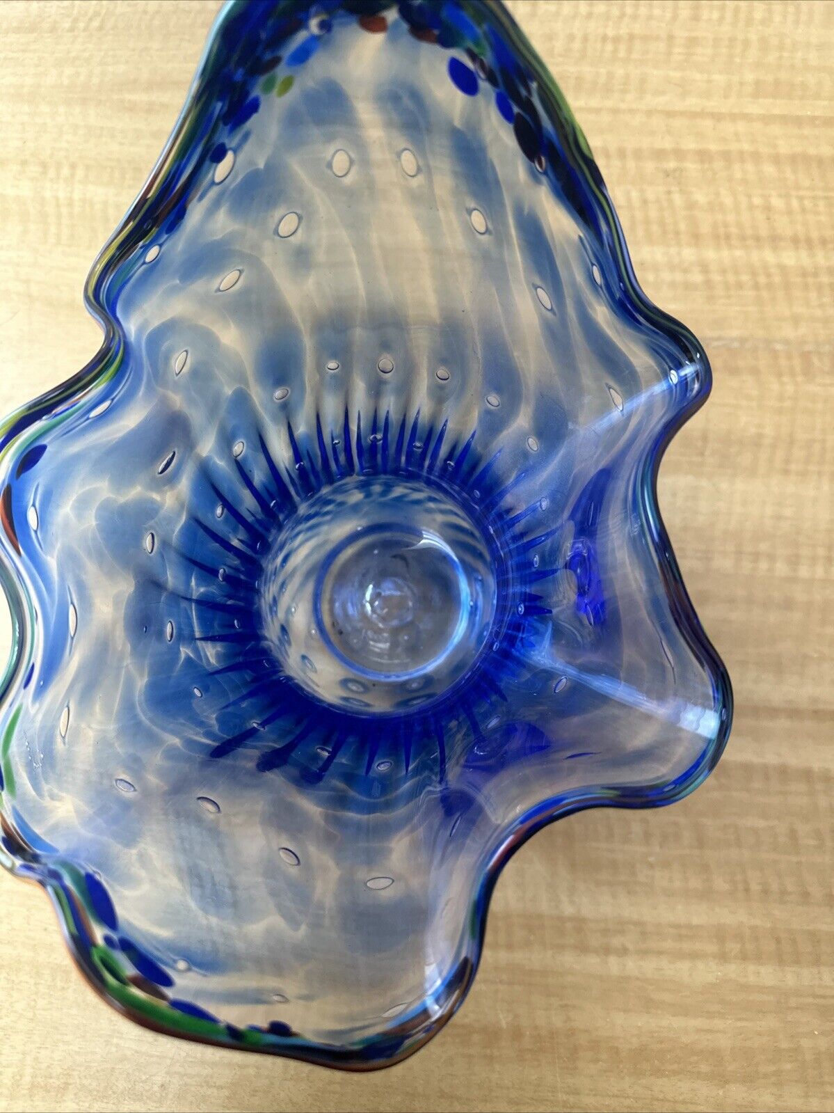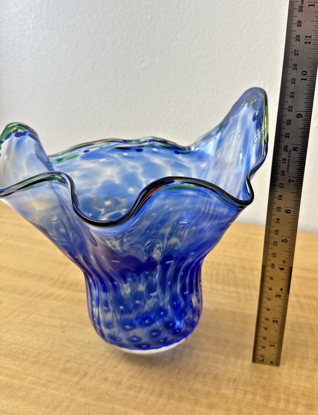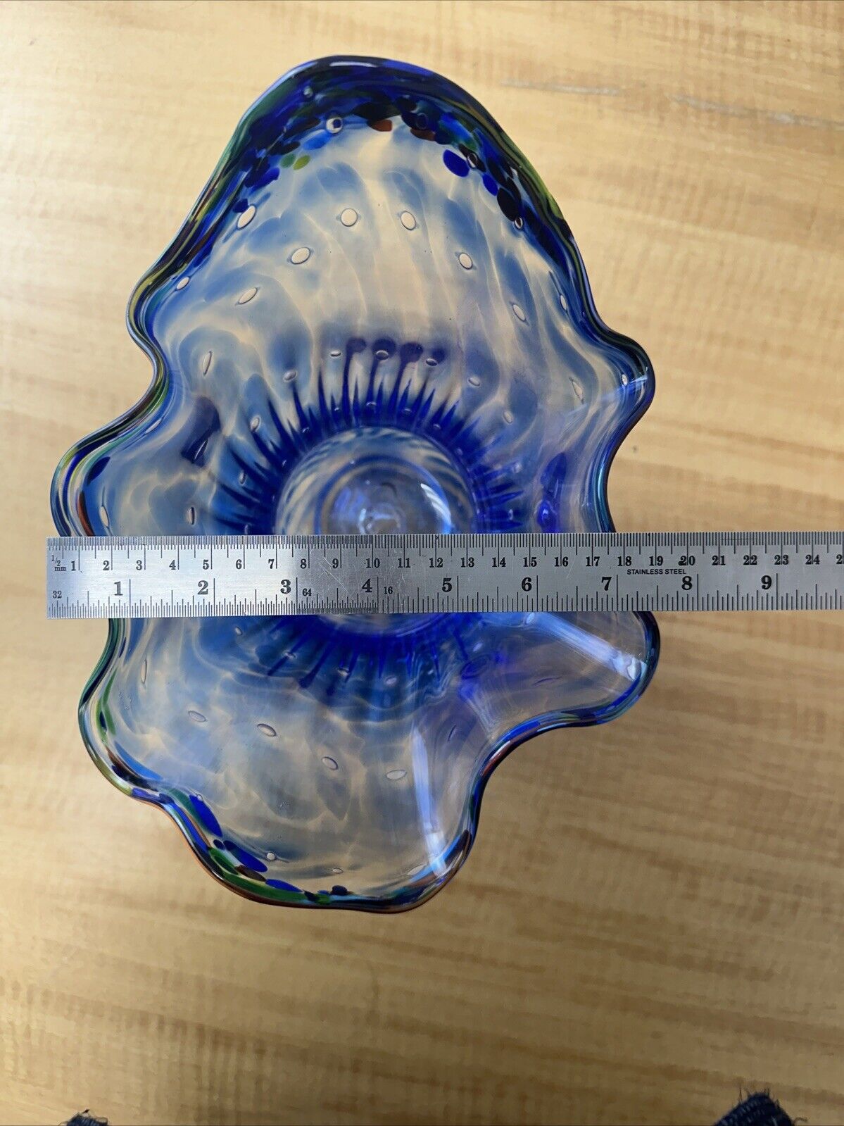Vintage Lefton Hand Blown Swirled Ruffle Colorful Edge Blue Glass Vase