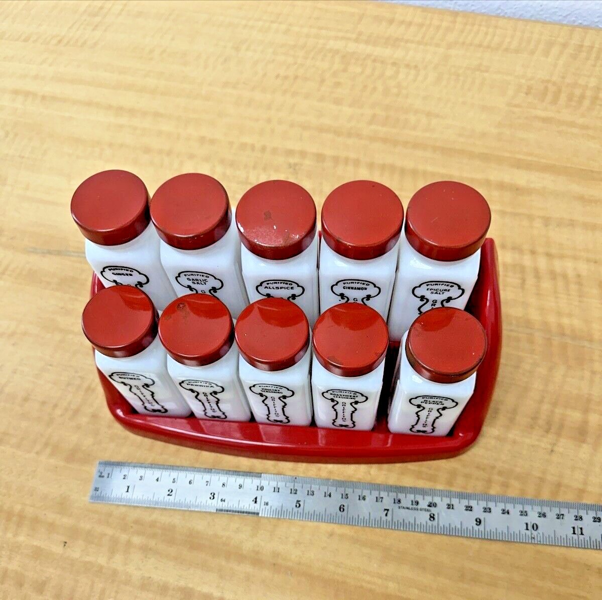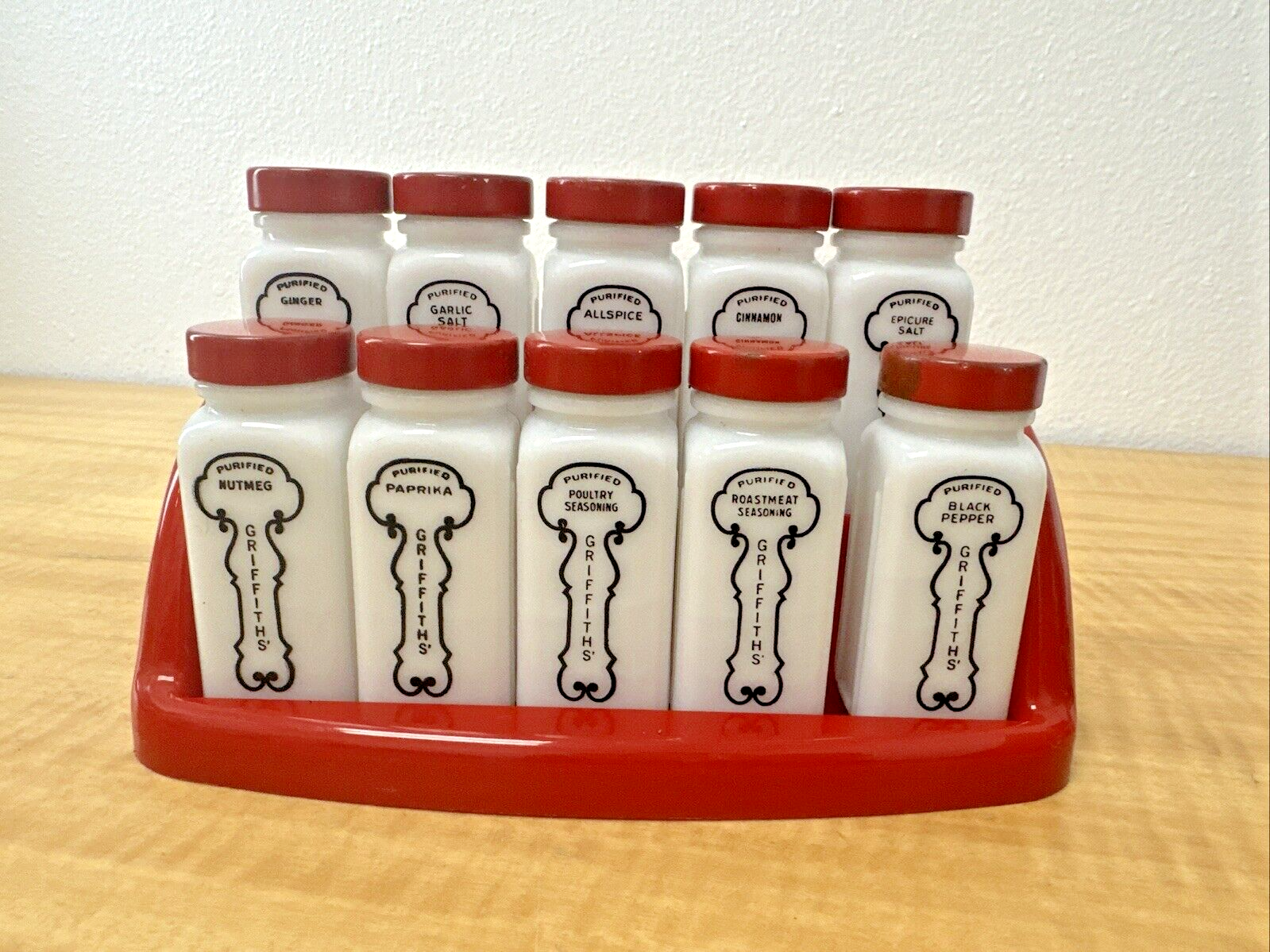 VTG DECO KITCHEN SET OF 12 GRIFFITHS SPICE JARS, MILK GLASS IN RED PLASTIC RACK