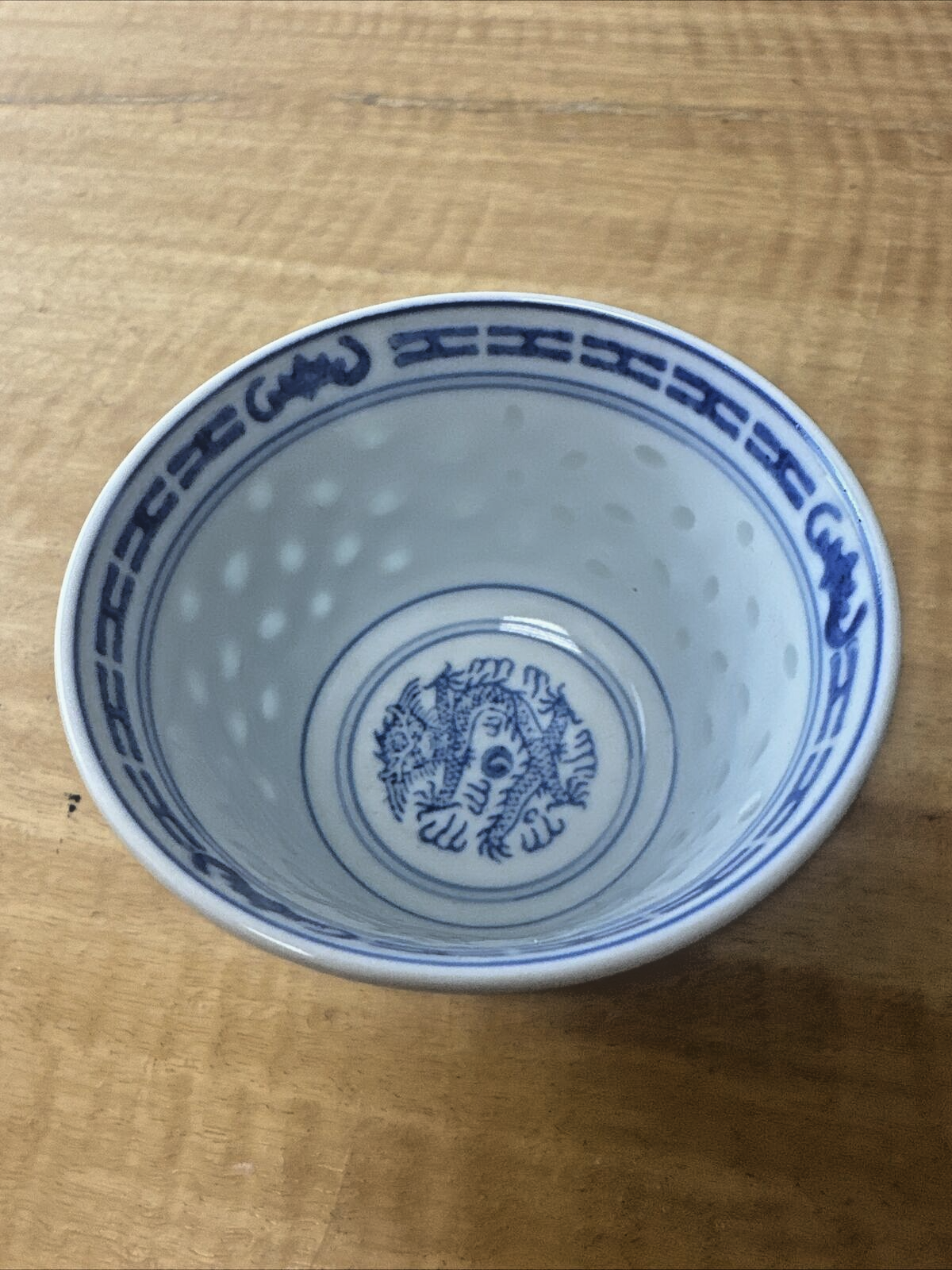 Vintage Chinese Rice Eyes Tea/Sake Cups 1 Each Rice Grain 2.5” Tall Blue White