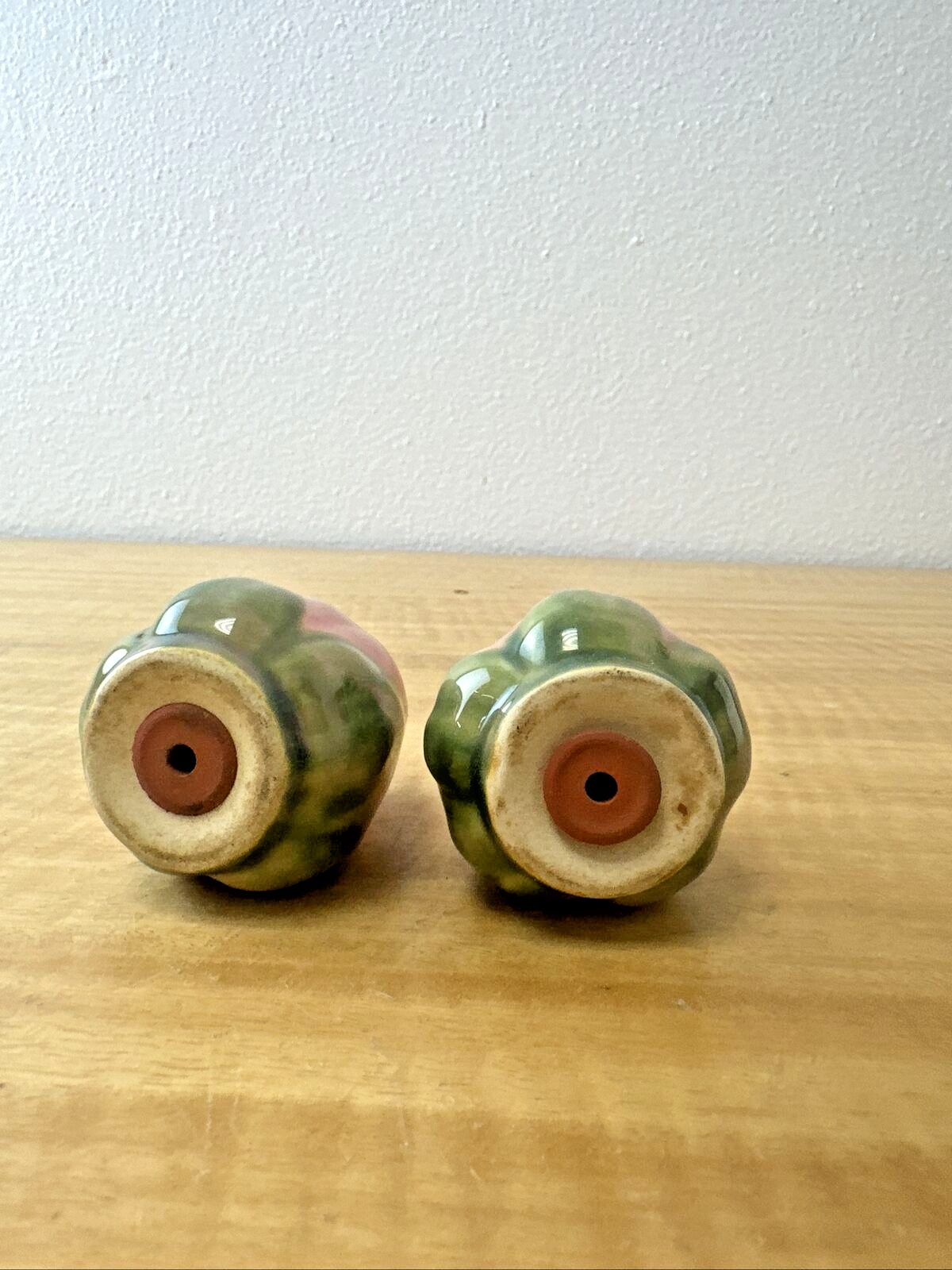 Pair of Small Pink Rose Bud w Green Leaves Salt & Pepper Shakers