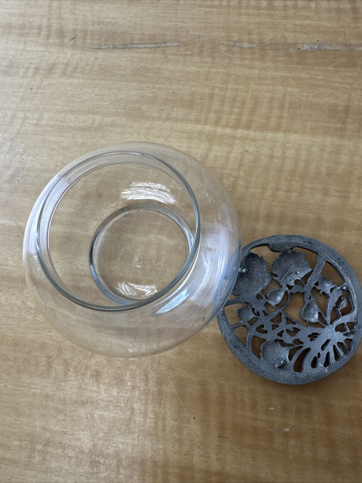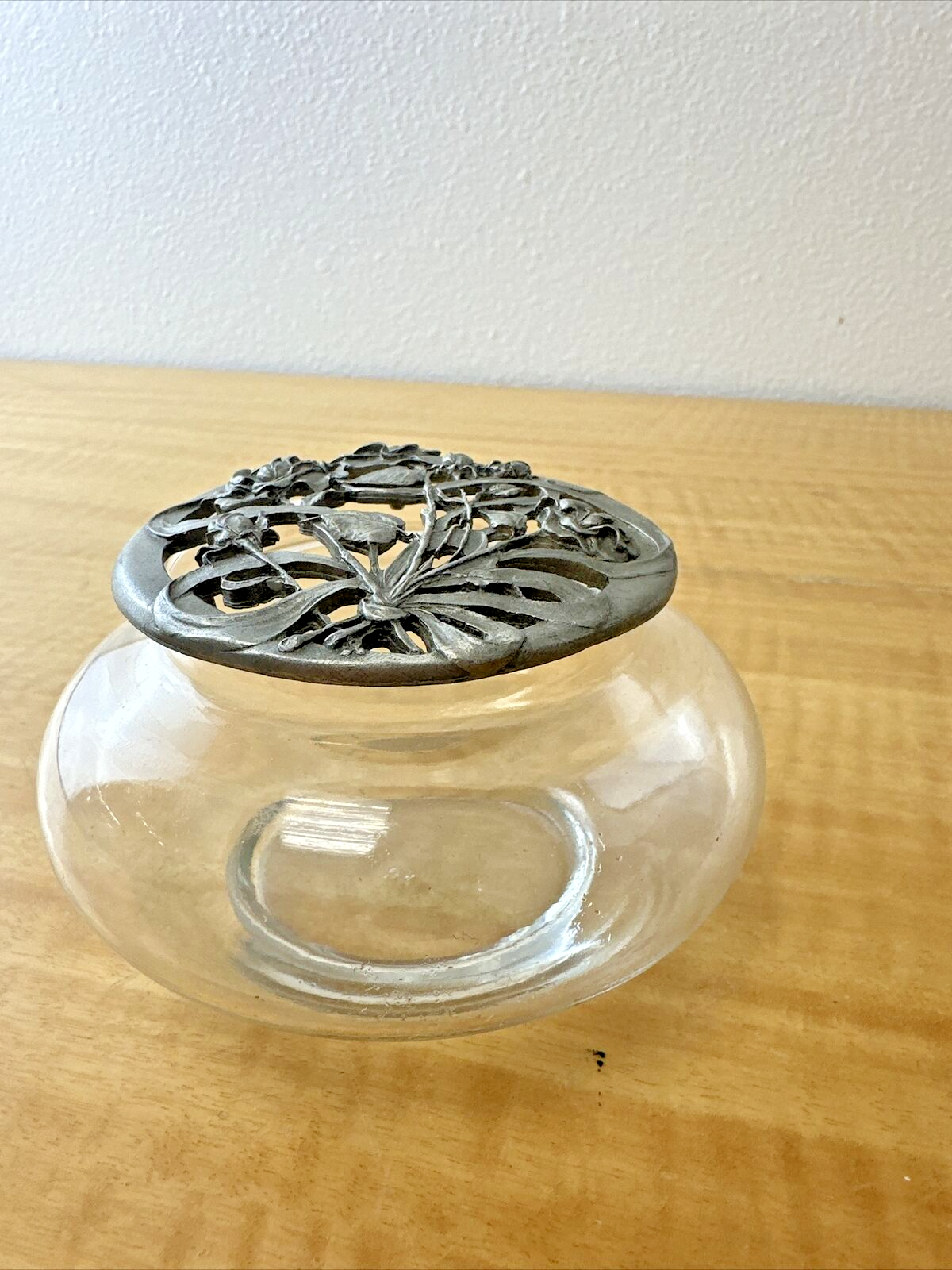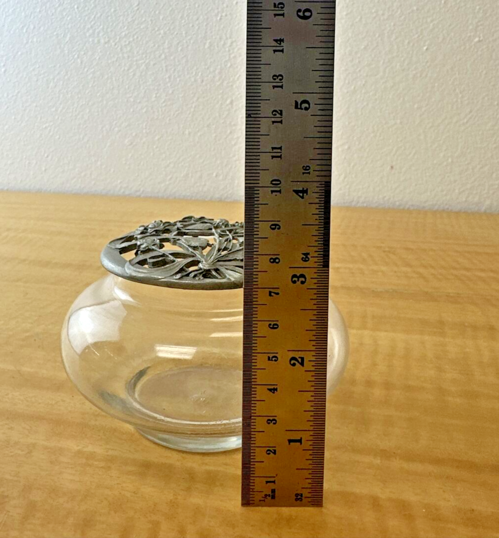 Pewter Lid Rose Potpourri Clear Glass Dish ~ 3" Tall