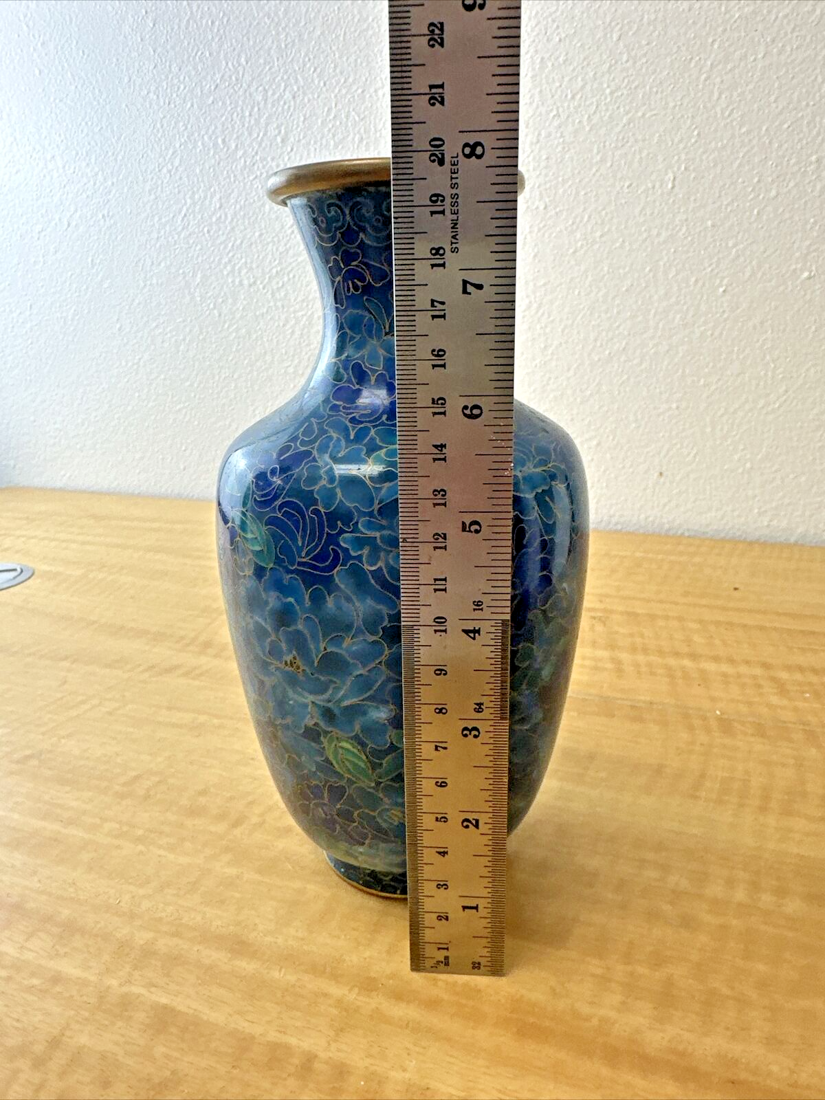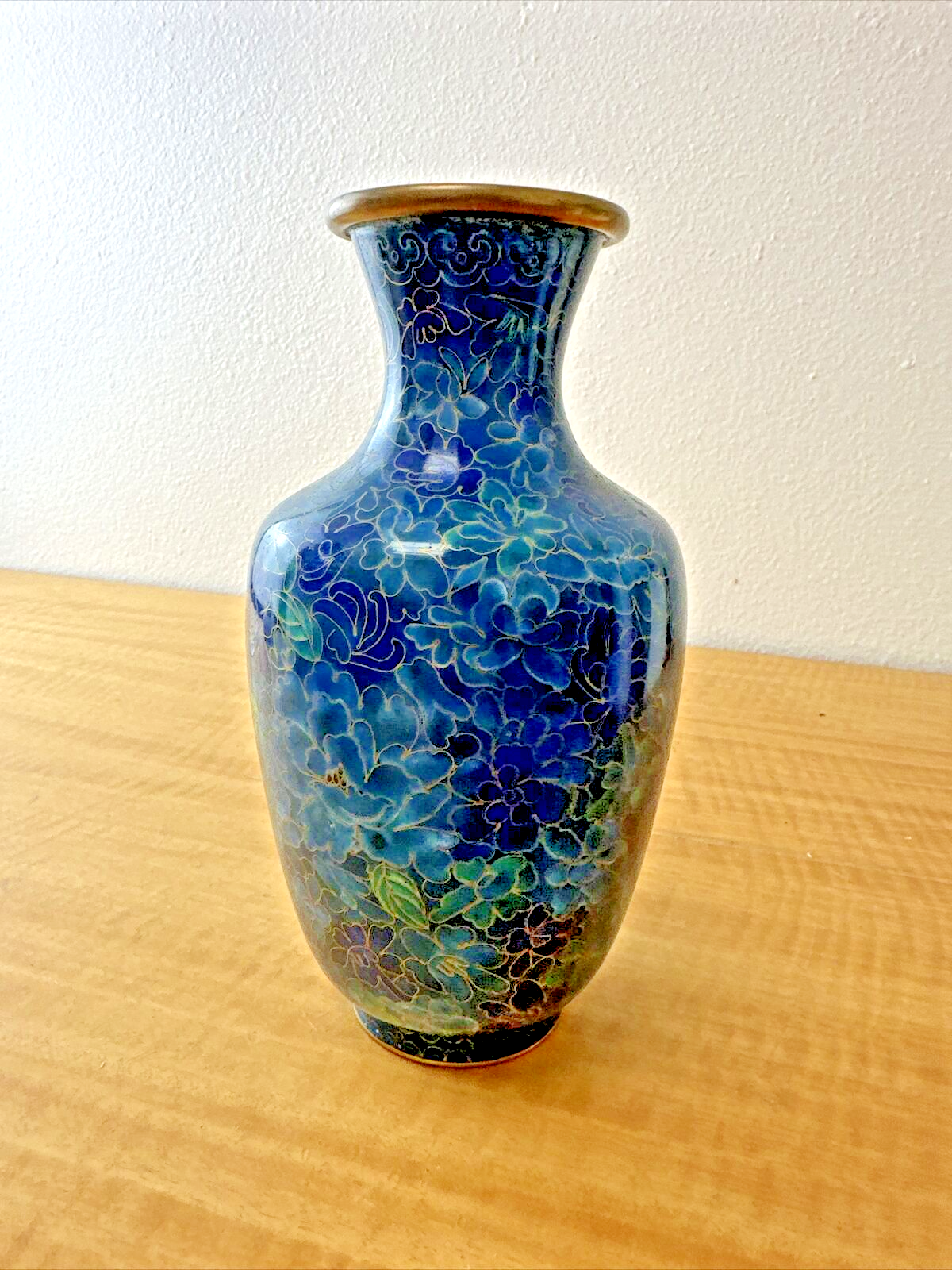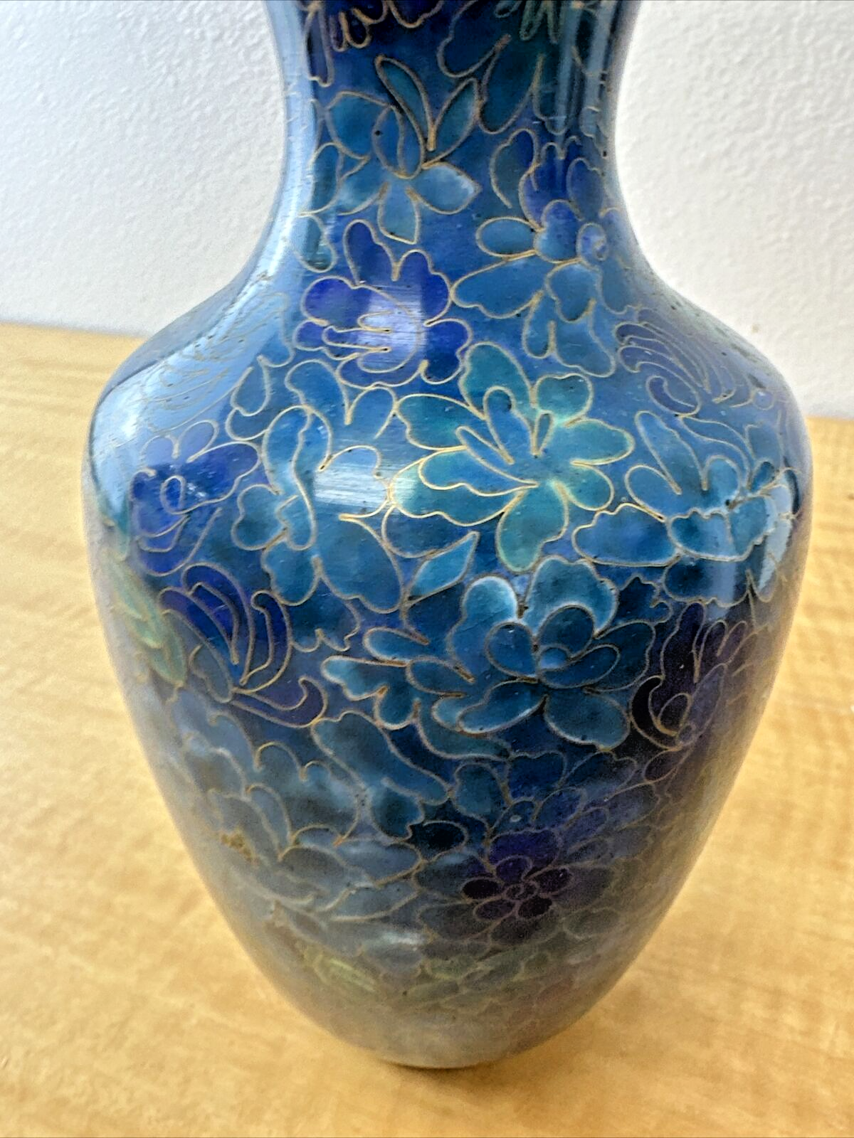 Vintage Chinese Cloisonne Floral Flower Blue Vase 8.25 Inches Tall