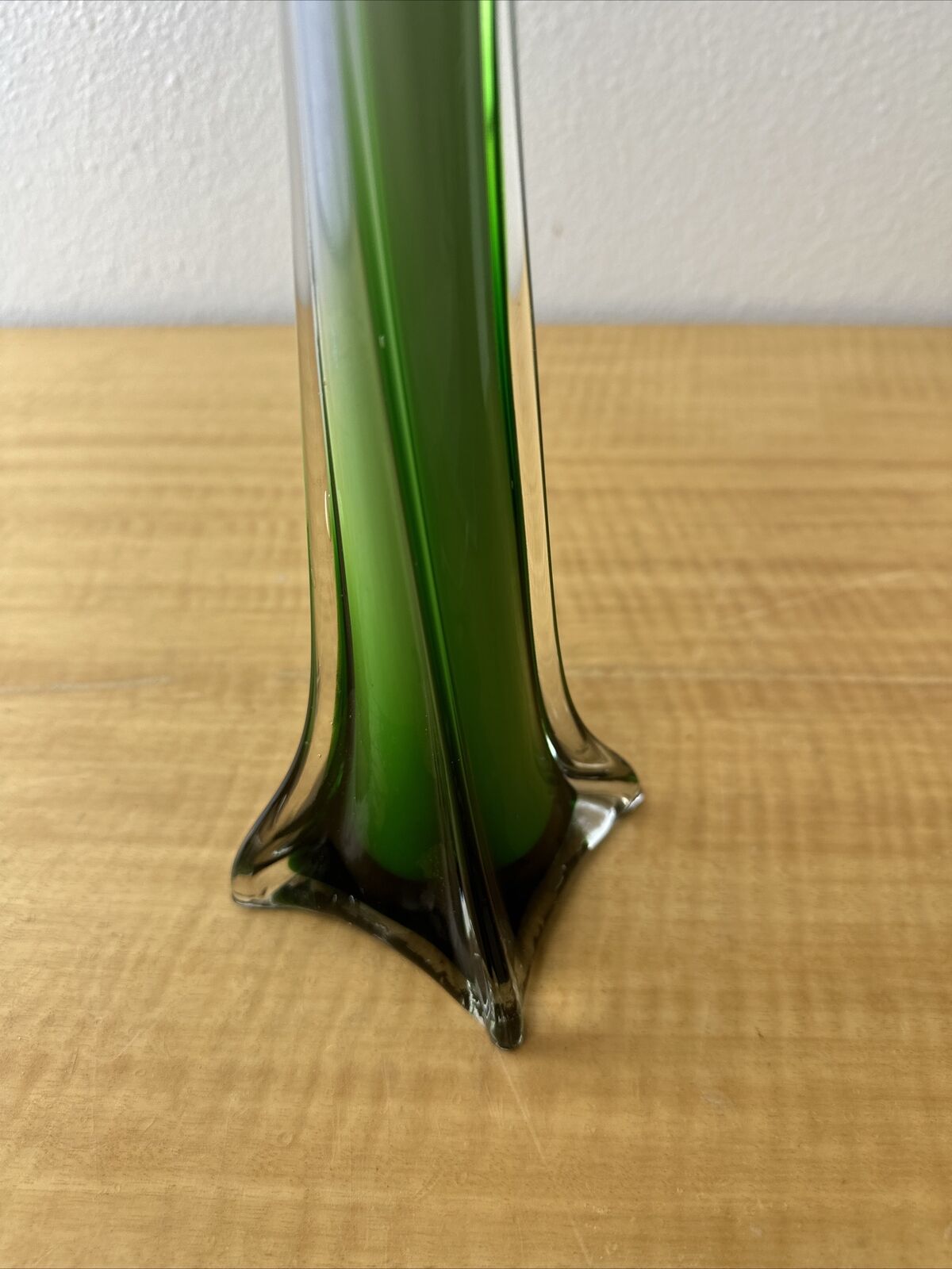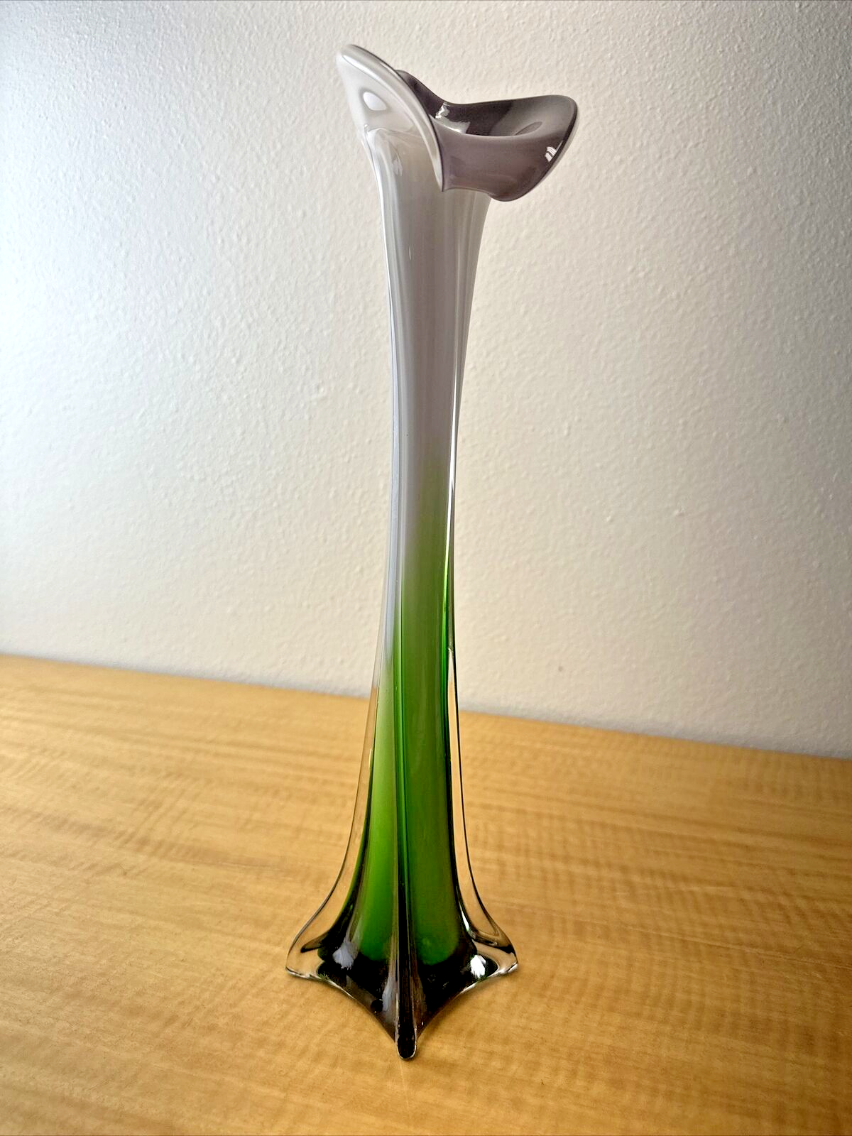 16" tall gorgeous hand blown clear, green, white & brown glass art flower vase