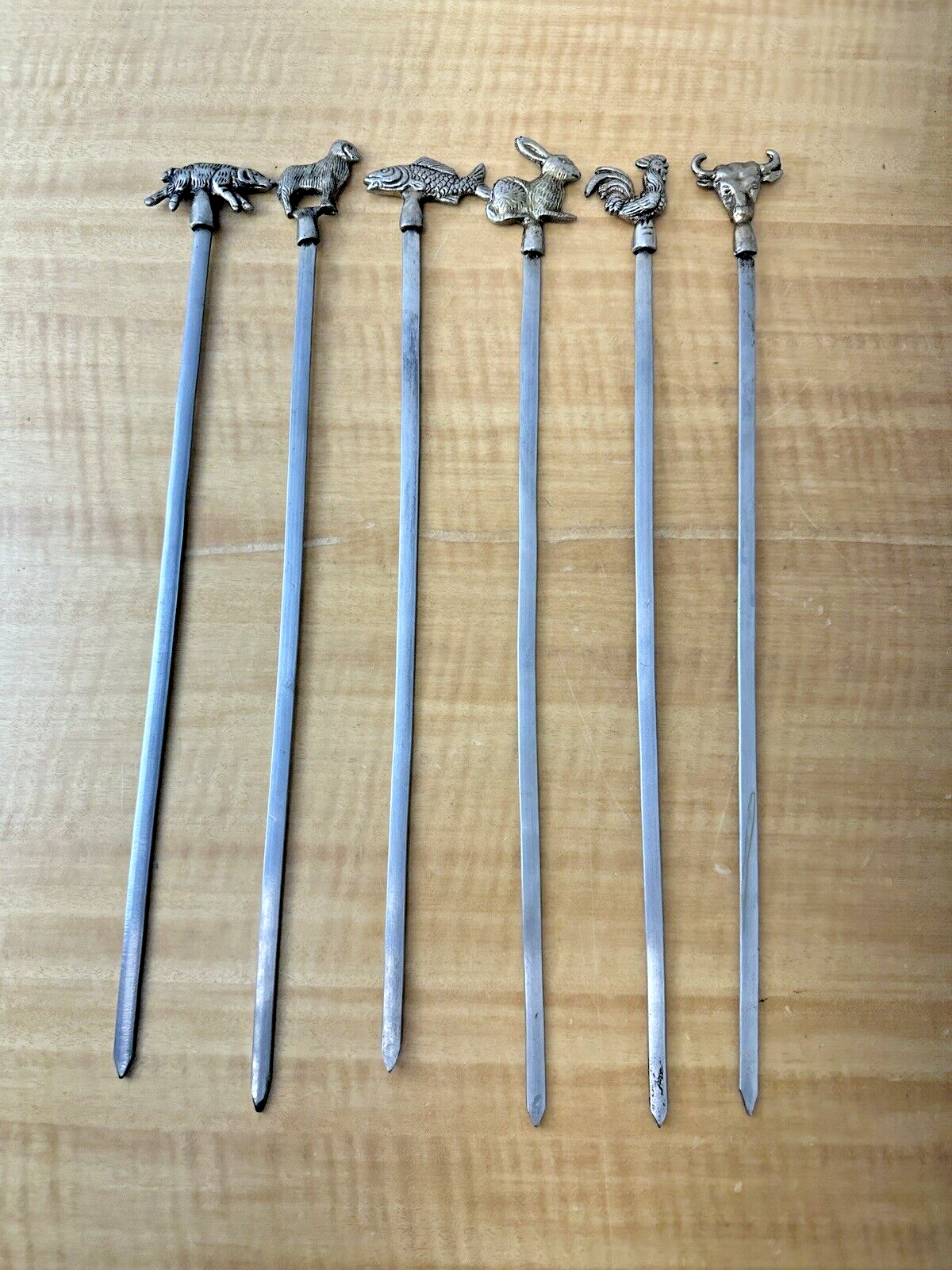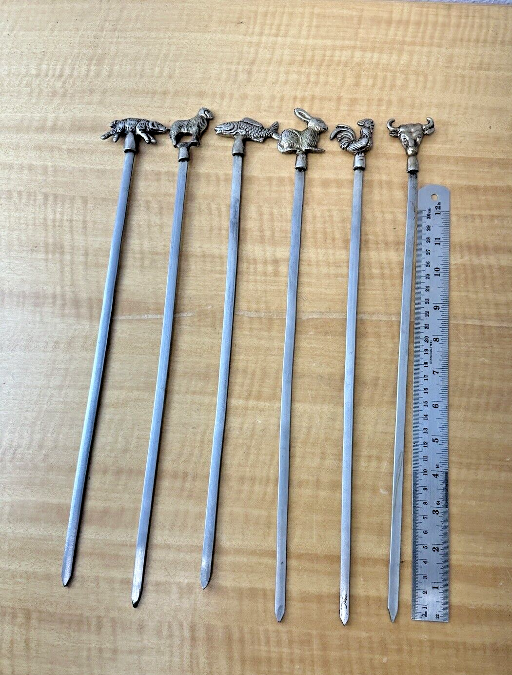 6 Vintage Shish Kebab Stainless Steel Skewers Animal Figures