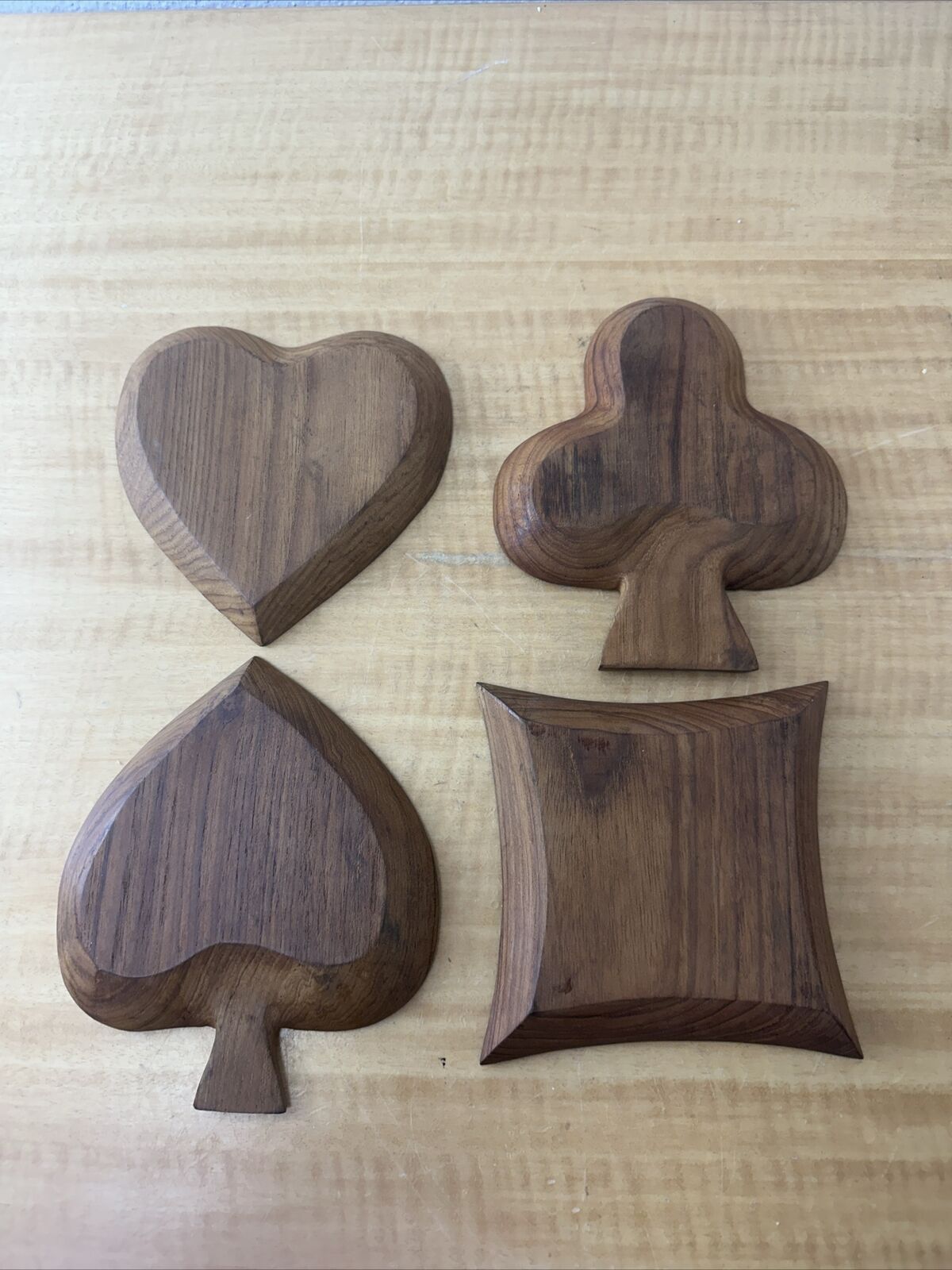 Set of 4 Vintage Playing Card Suit Teak or Monkey Pod Wood Figural Snack Dishes