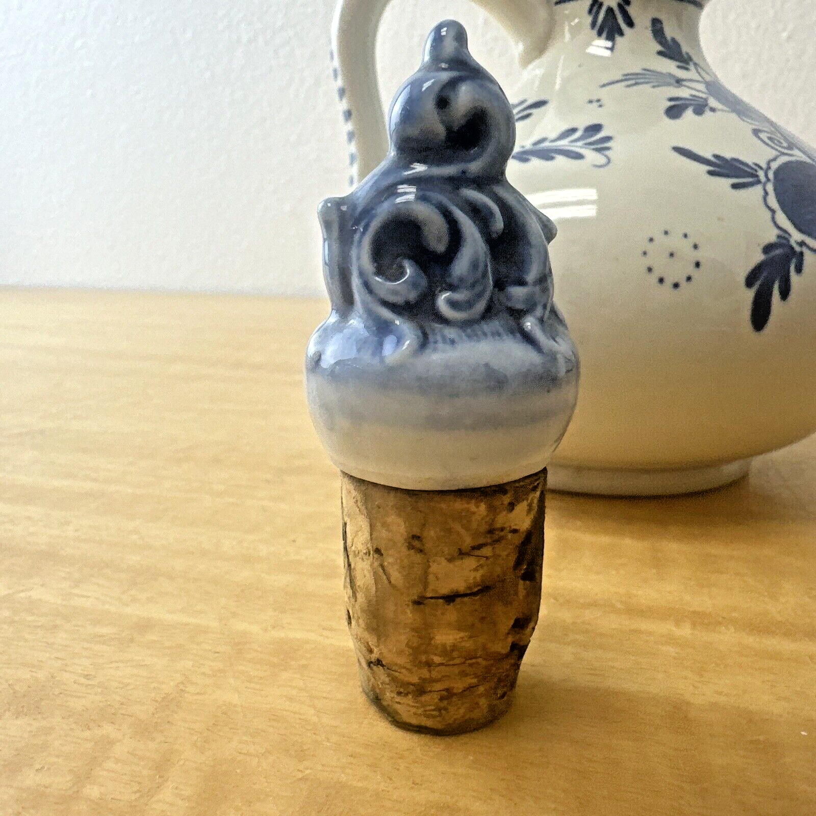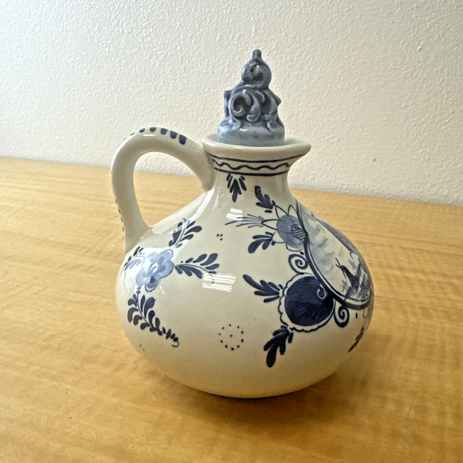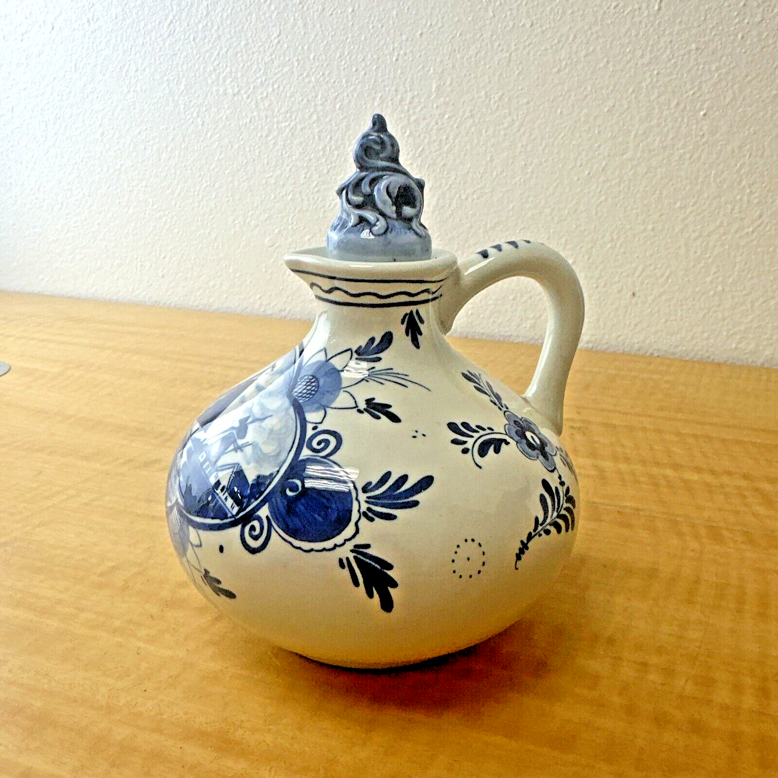 Delft Blauw Erven Lucas Bols Bulbous Handled Jug, Windmill/Flowers w/ Stopper
