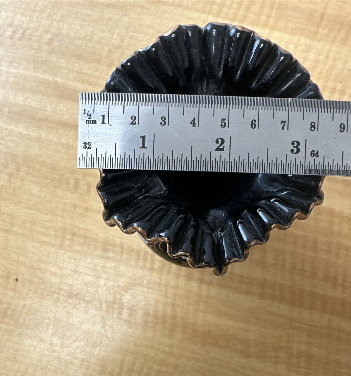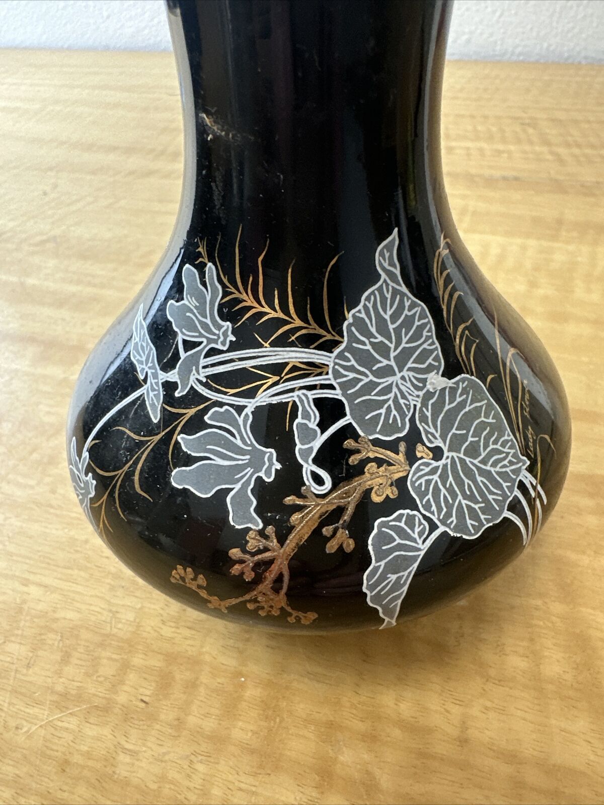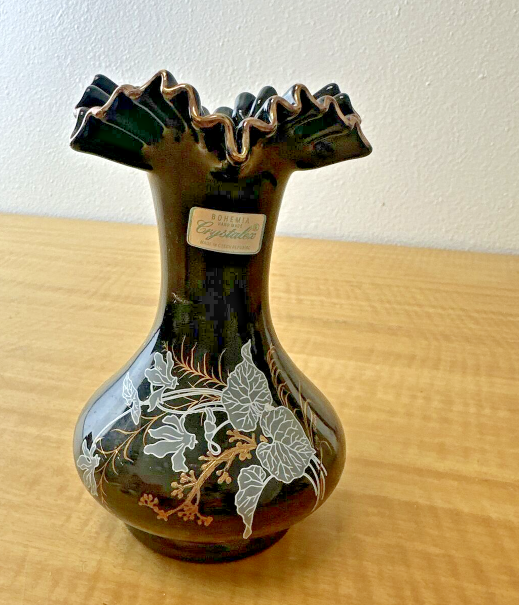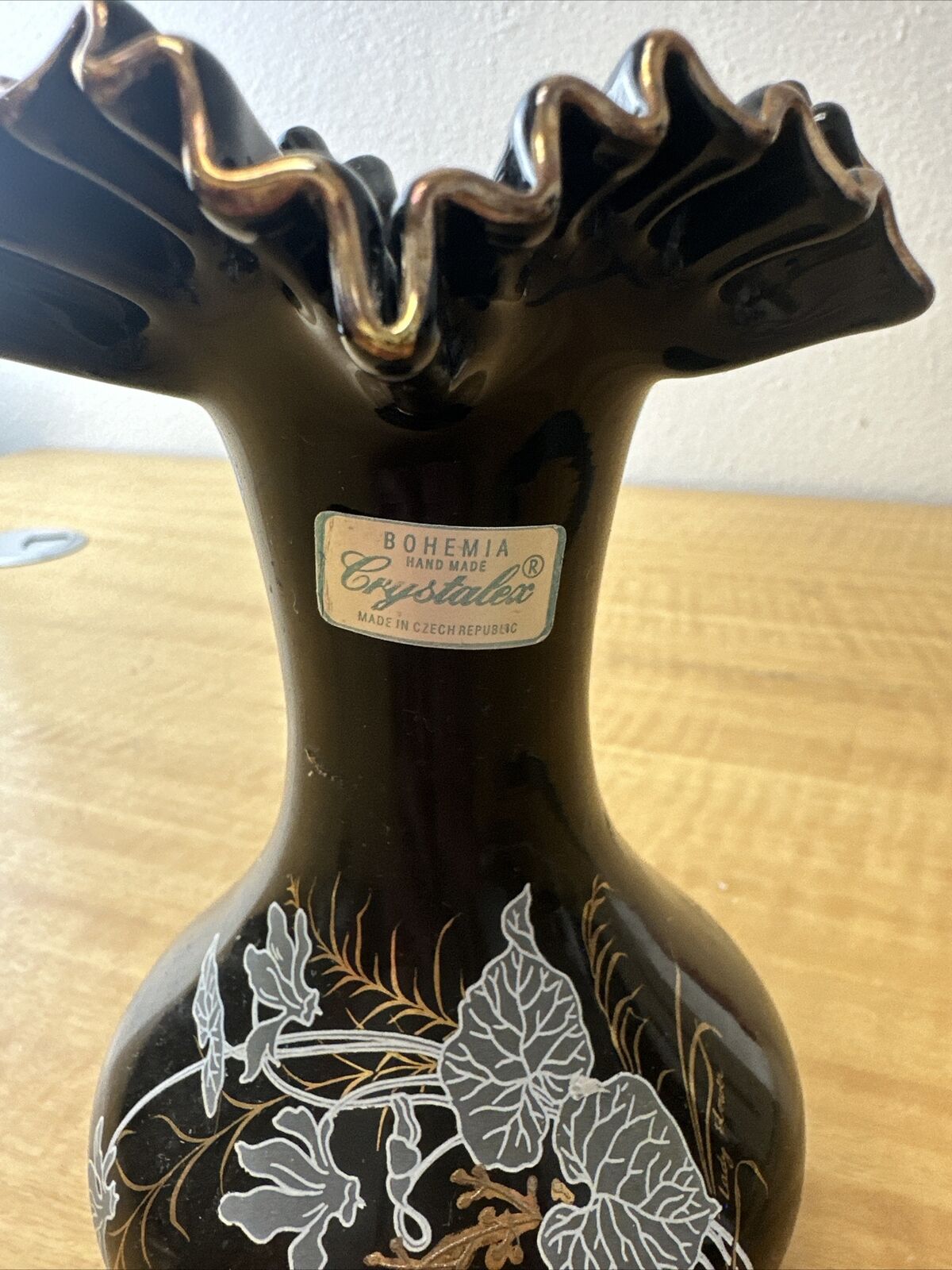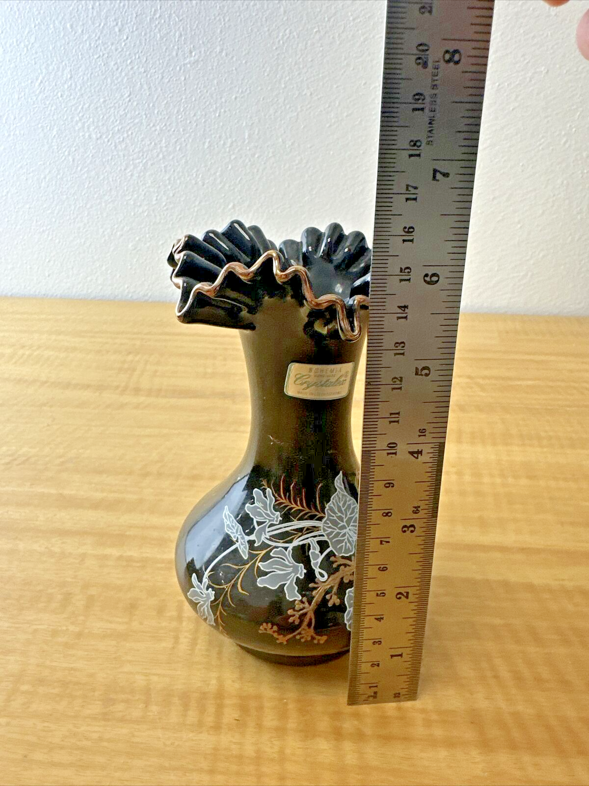 Bohemia Black Glass Hand Painted Vase - W/Label - Gorgeous!