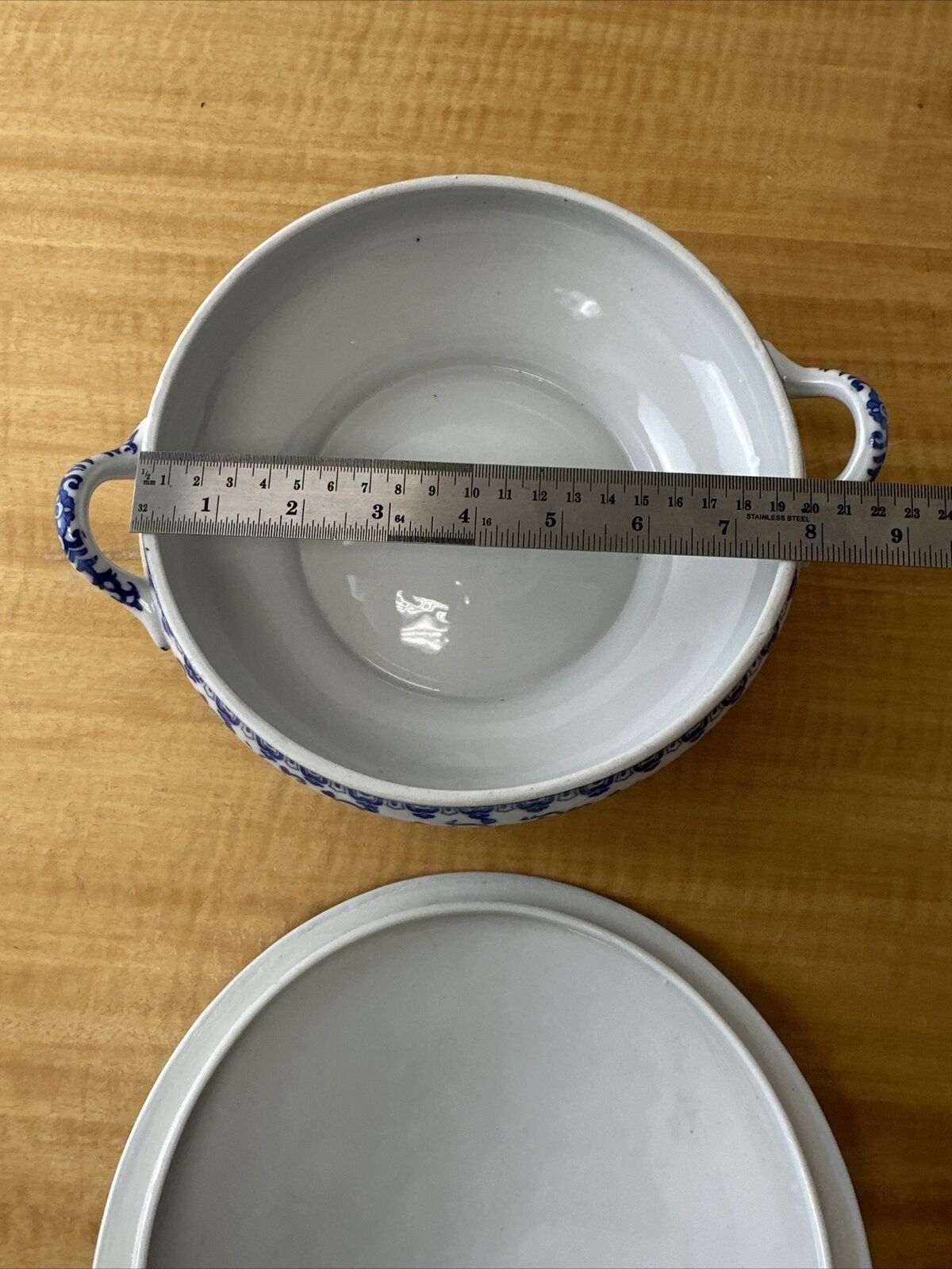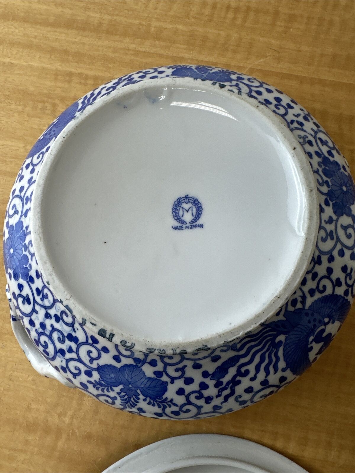 Vintage Blue Phoenix Bird Flying Turkey Circle Tureen Japan mark with flower