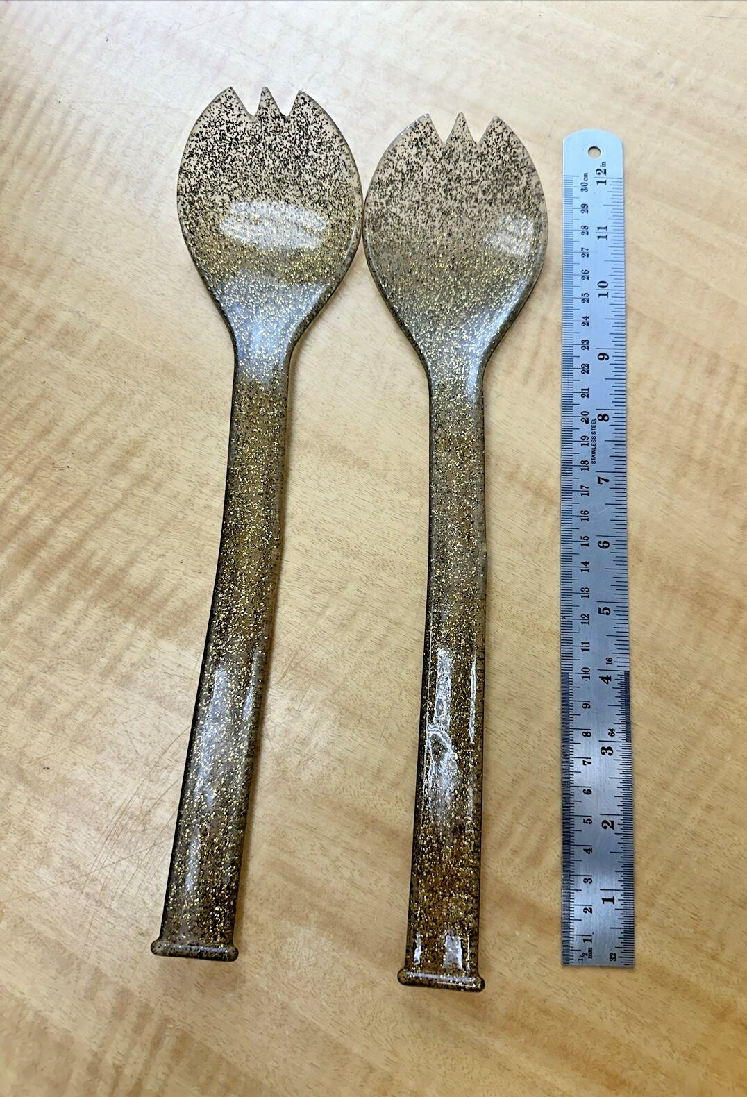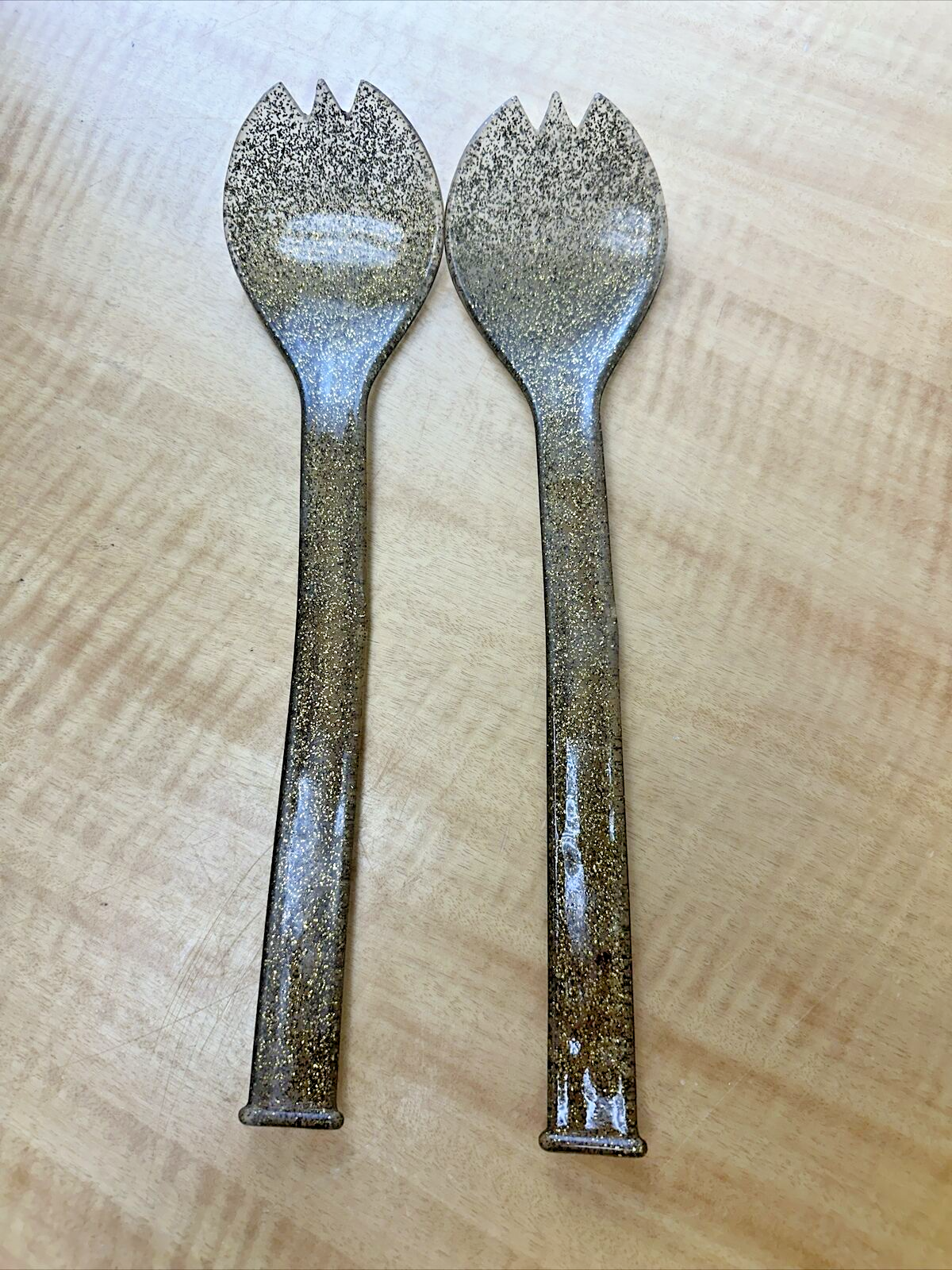 MCM Mod Gold Glitter Acrylic Lucite Salad Utensils Salad Server Set 1960s 1970s