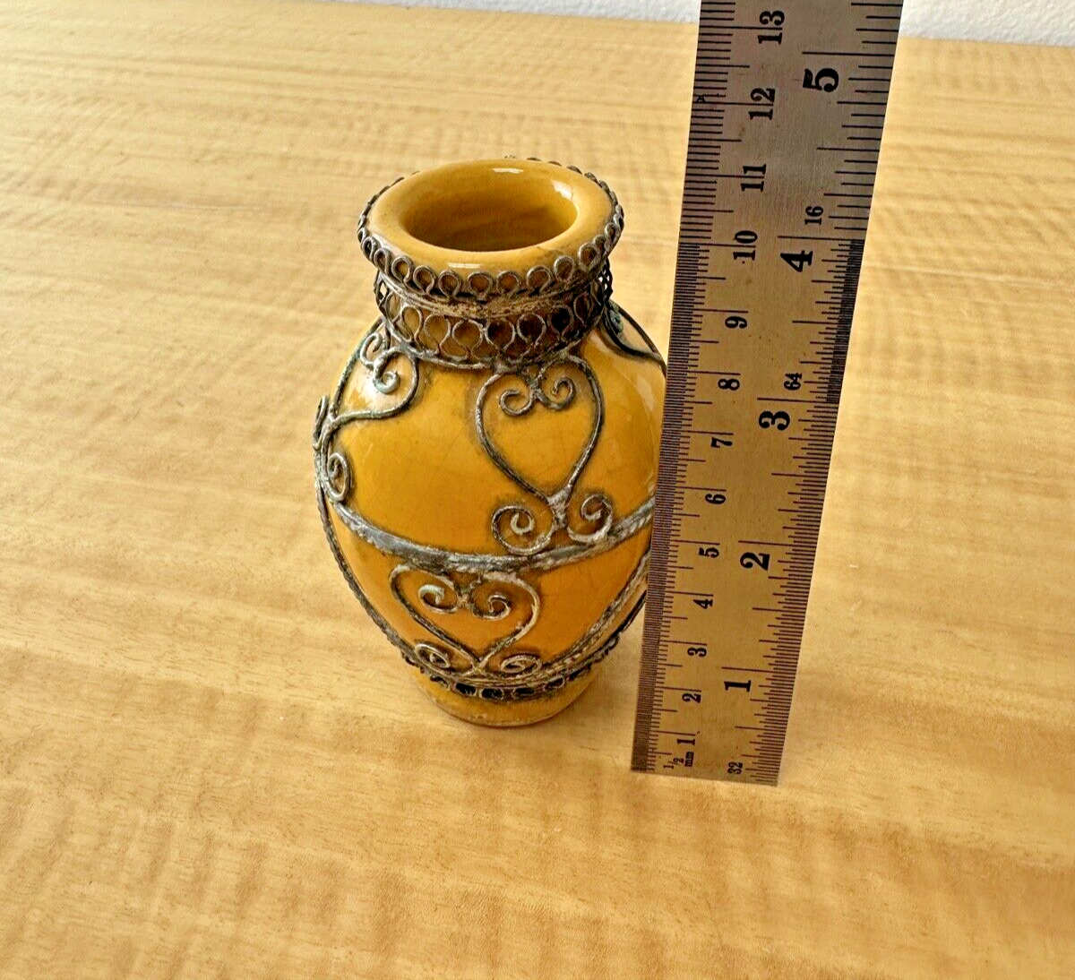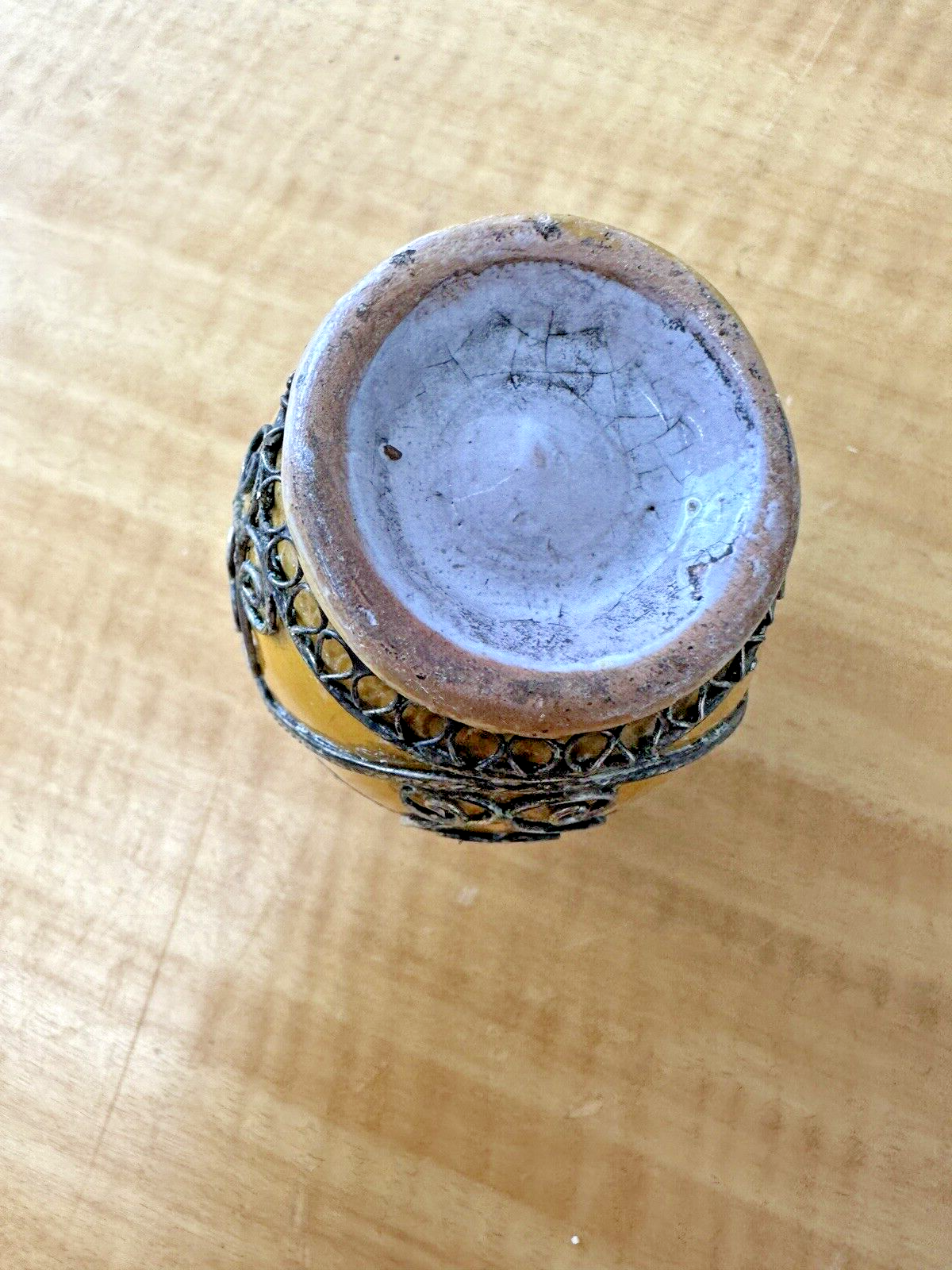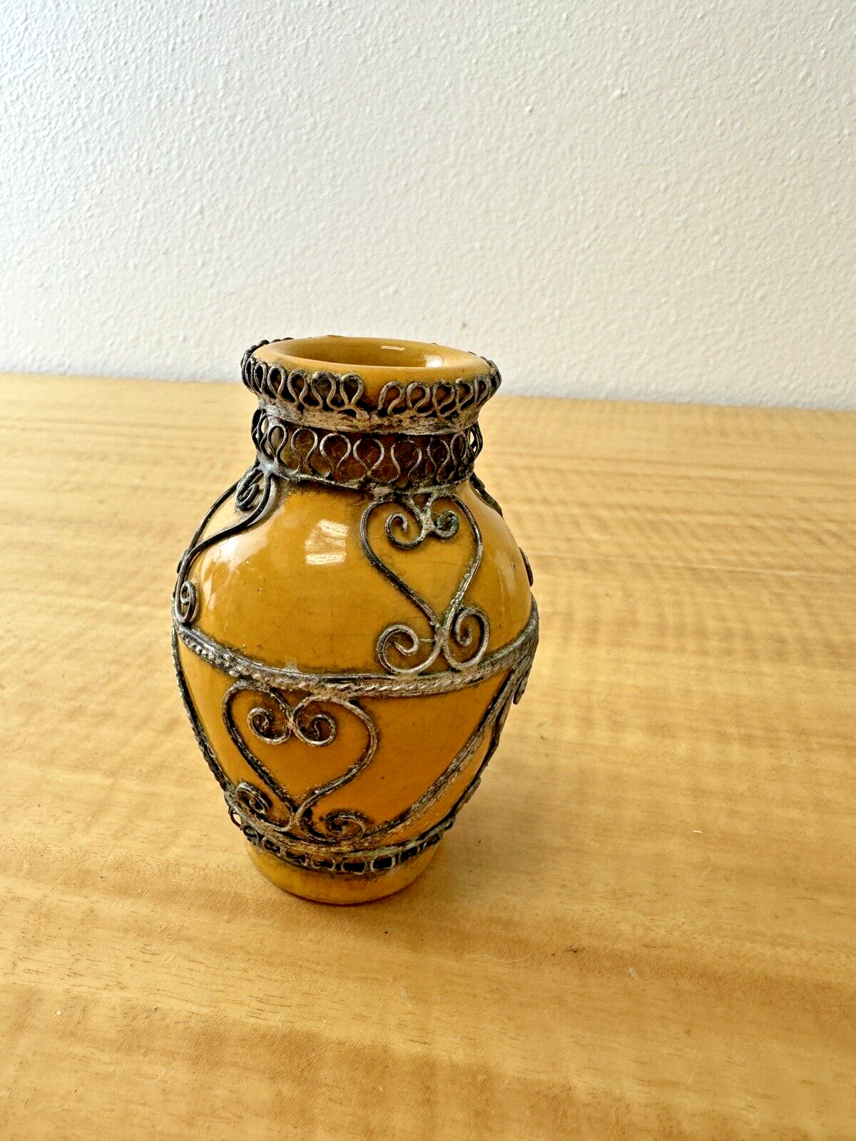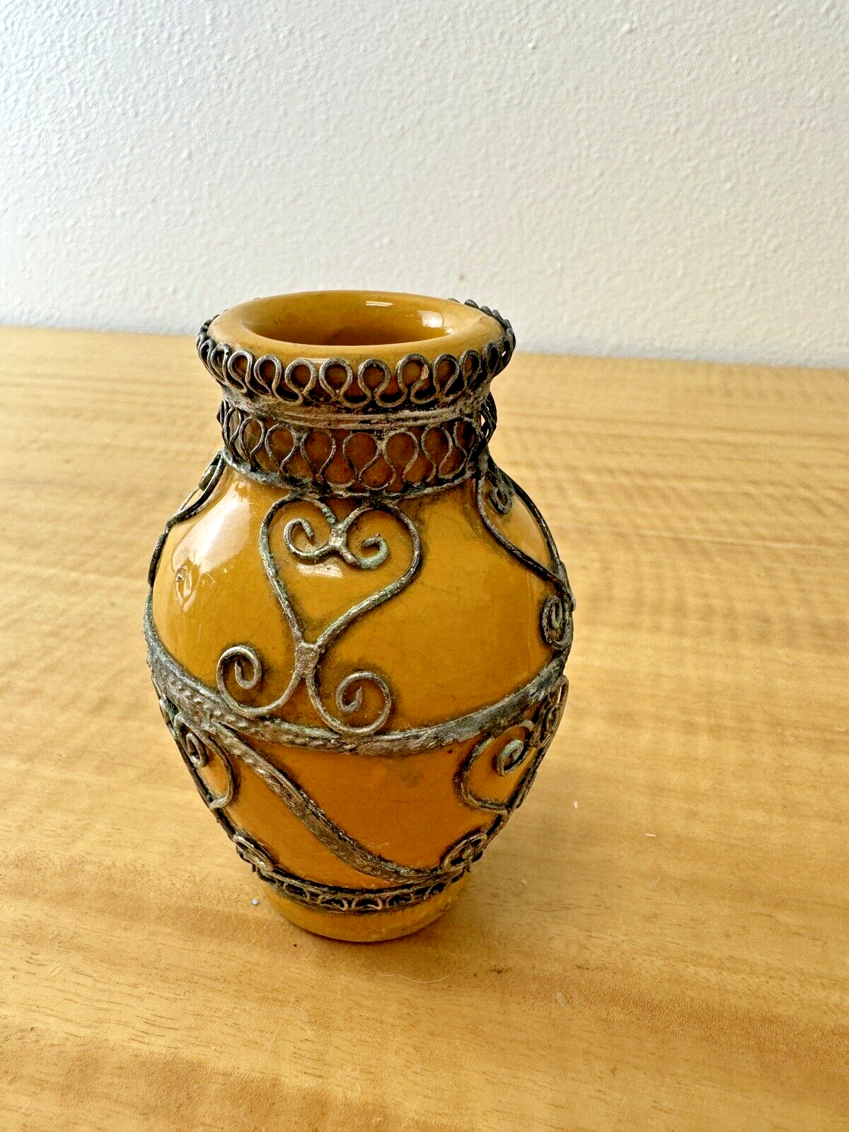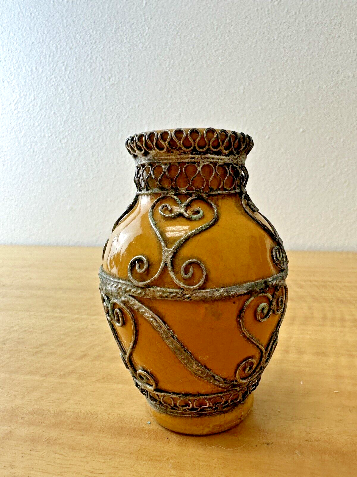 Gold Colored Pottery Vase Wrapped In Silver Tone Wire Metal VTG