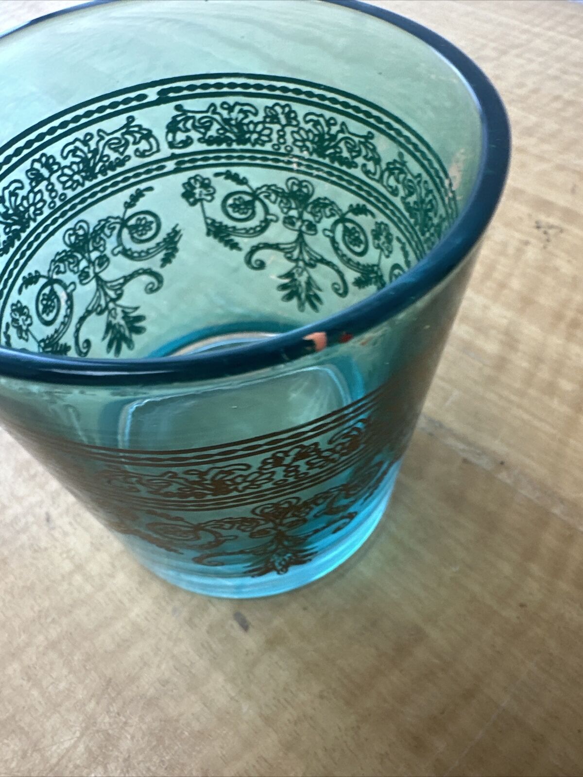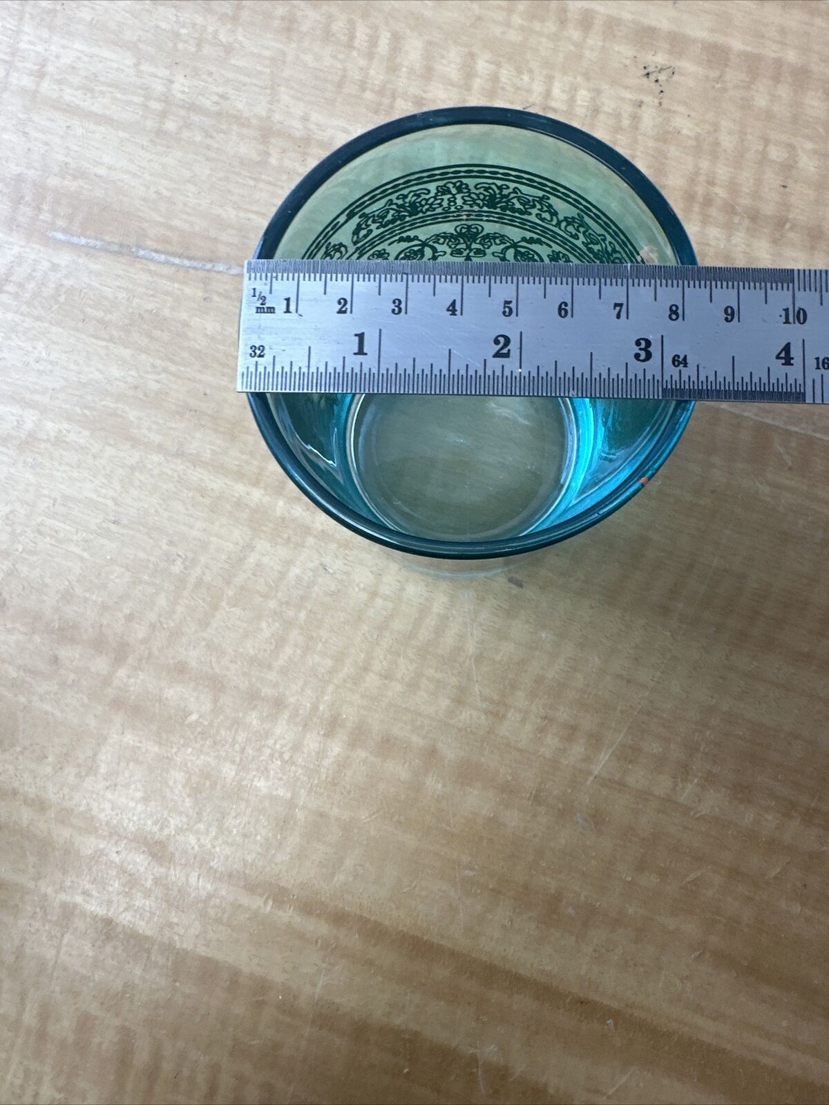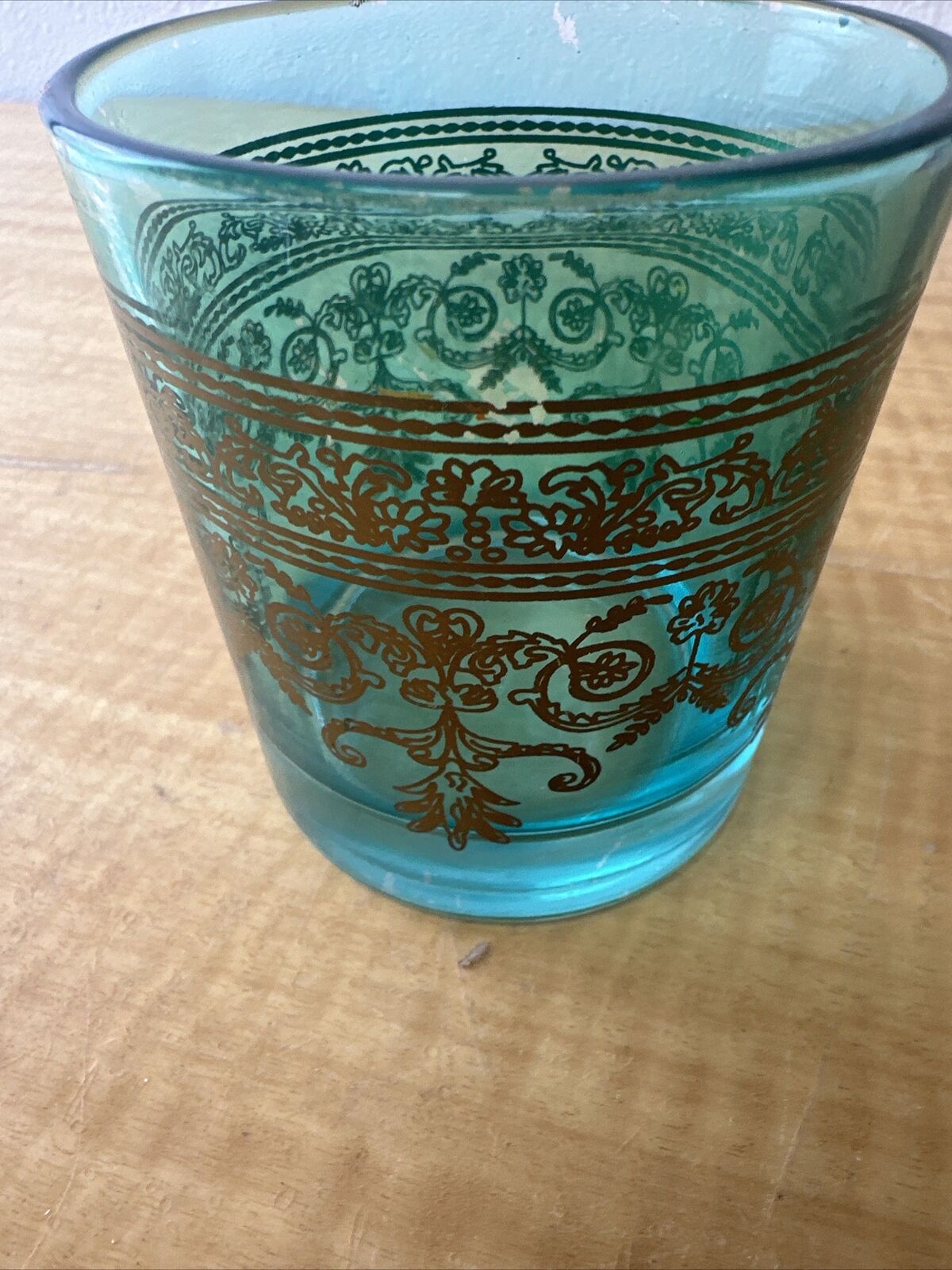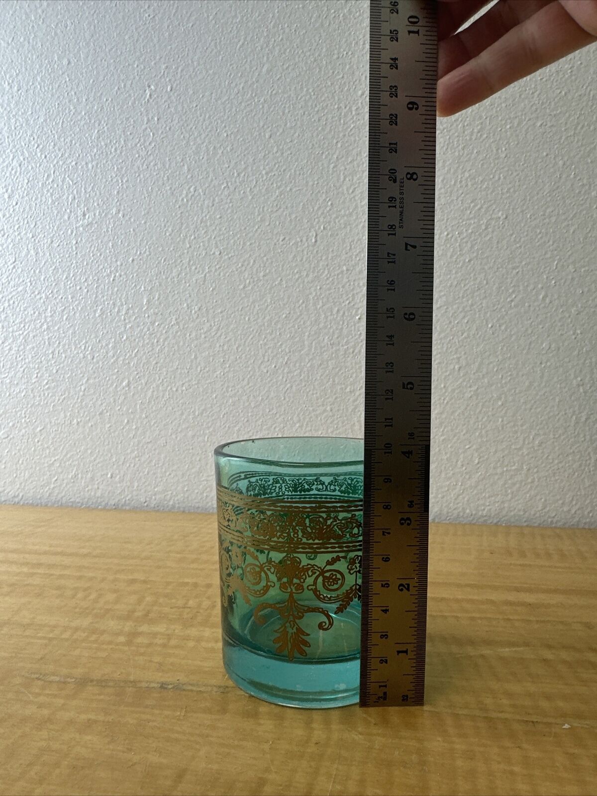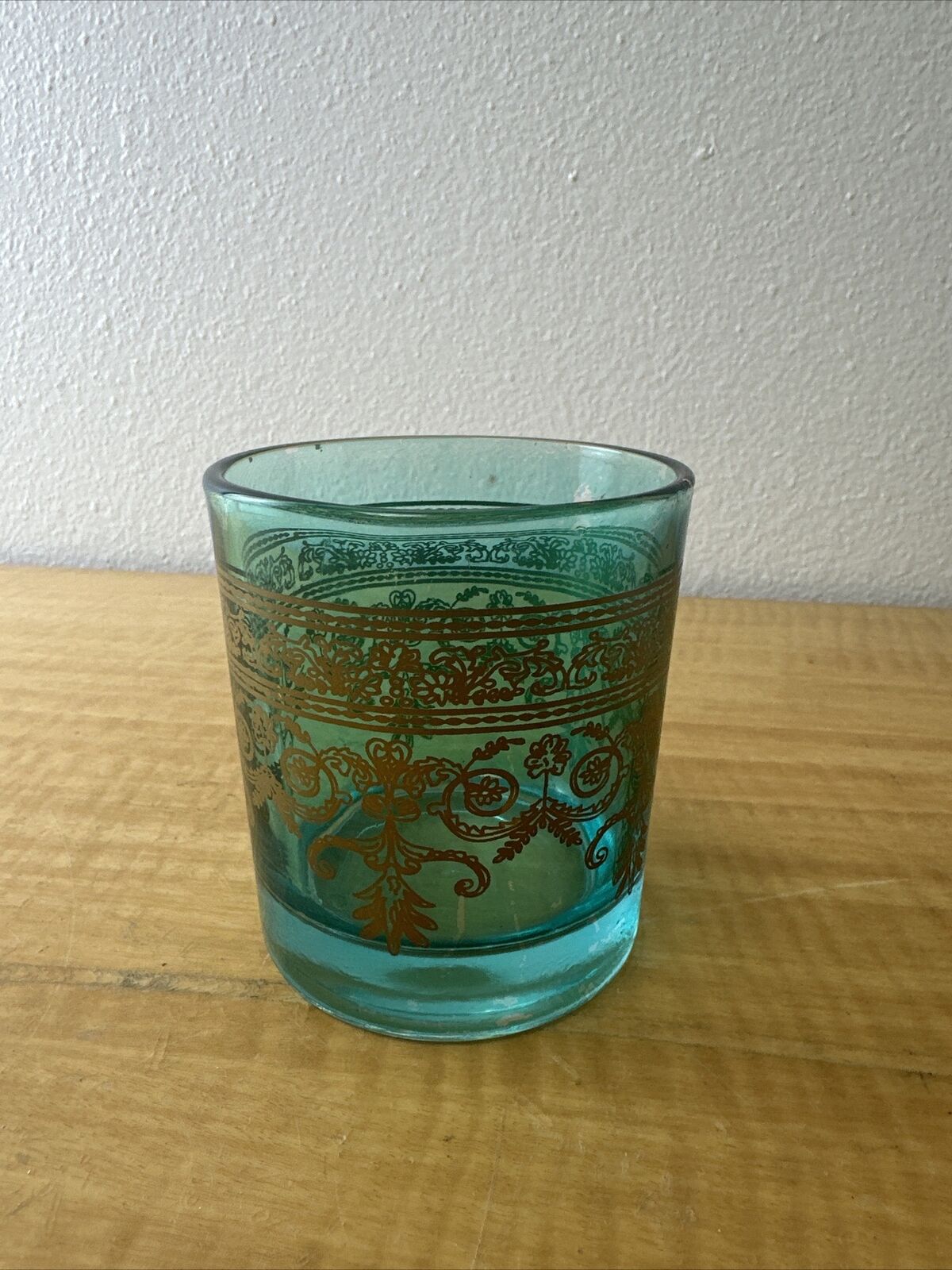 Vintage Teal Glass Rocks Glass with Gold Trim - Heavy