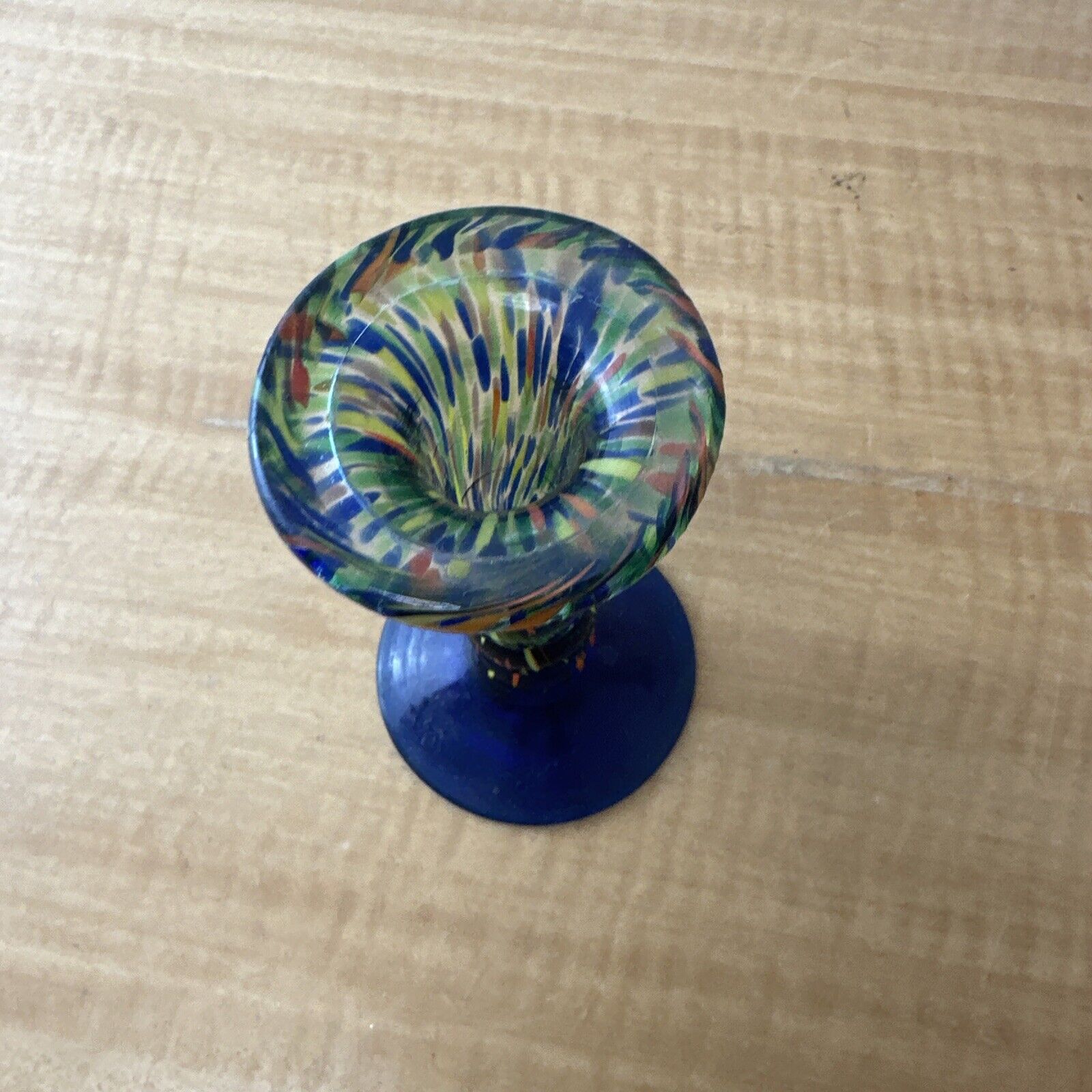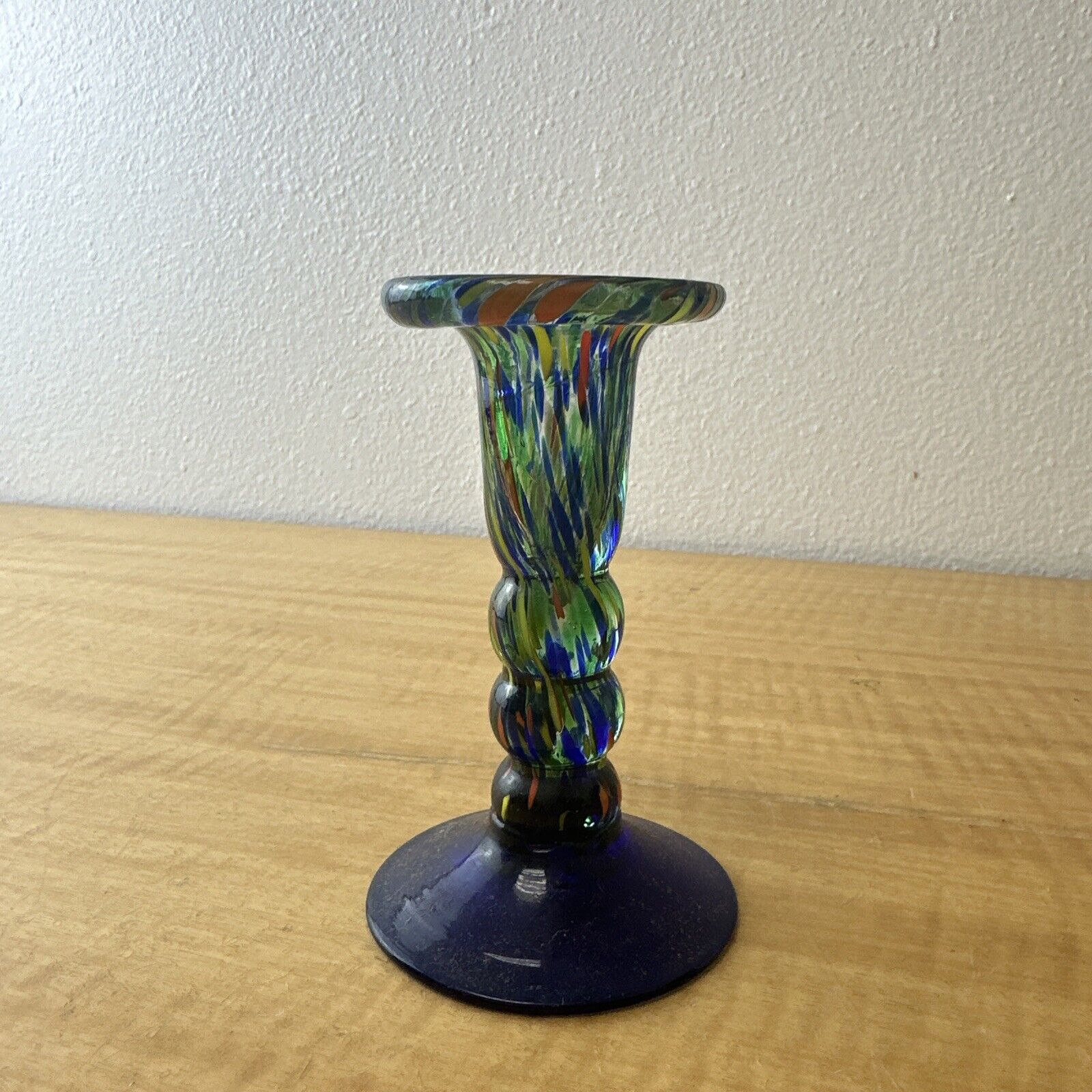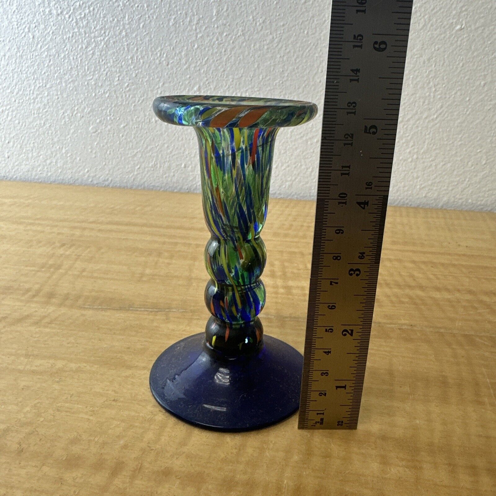 Hand Blown Glass Candlestick Candle Green Swirl Blue Murano Style Art Glass