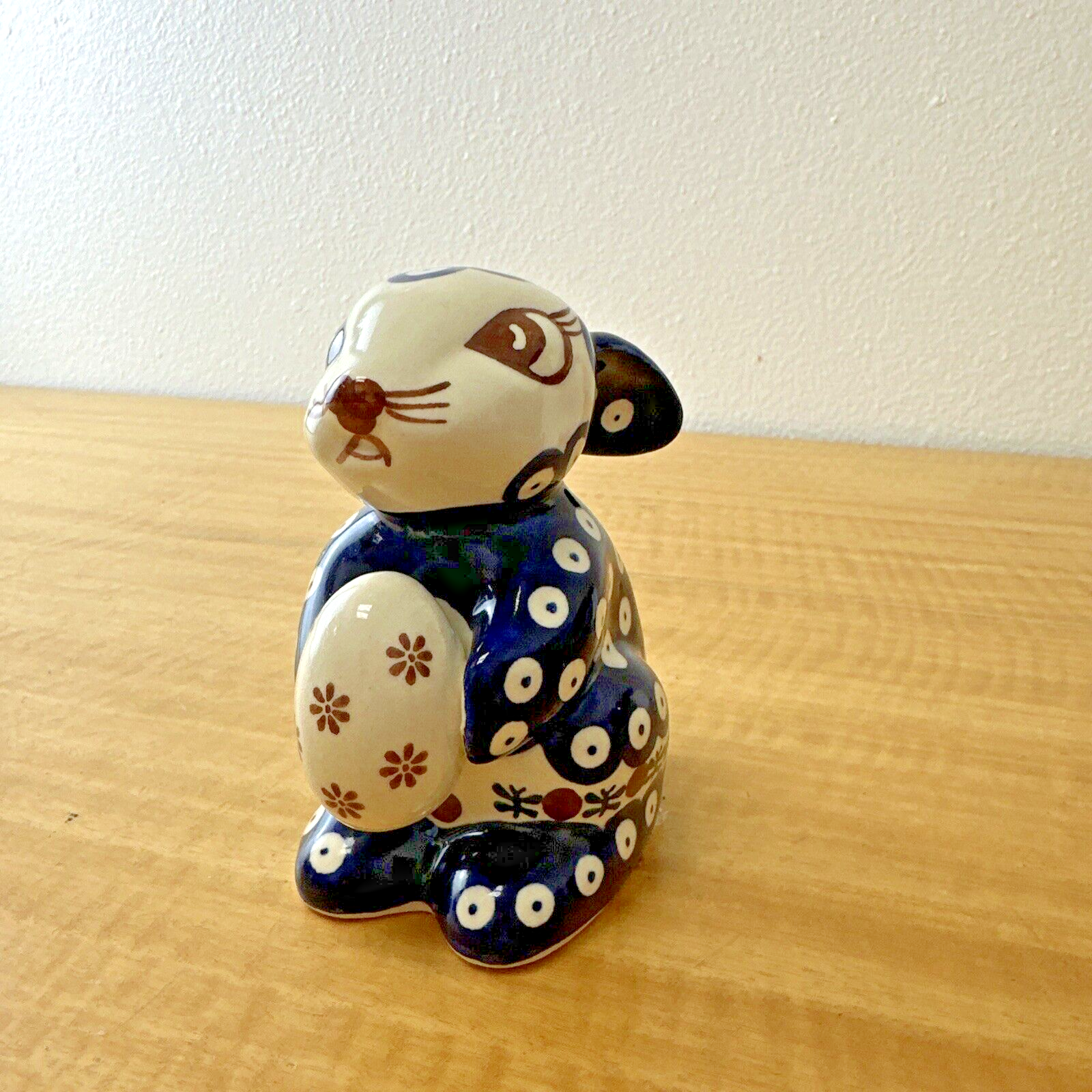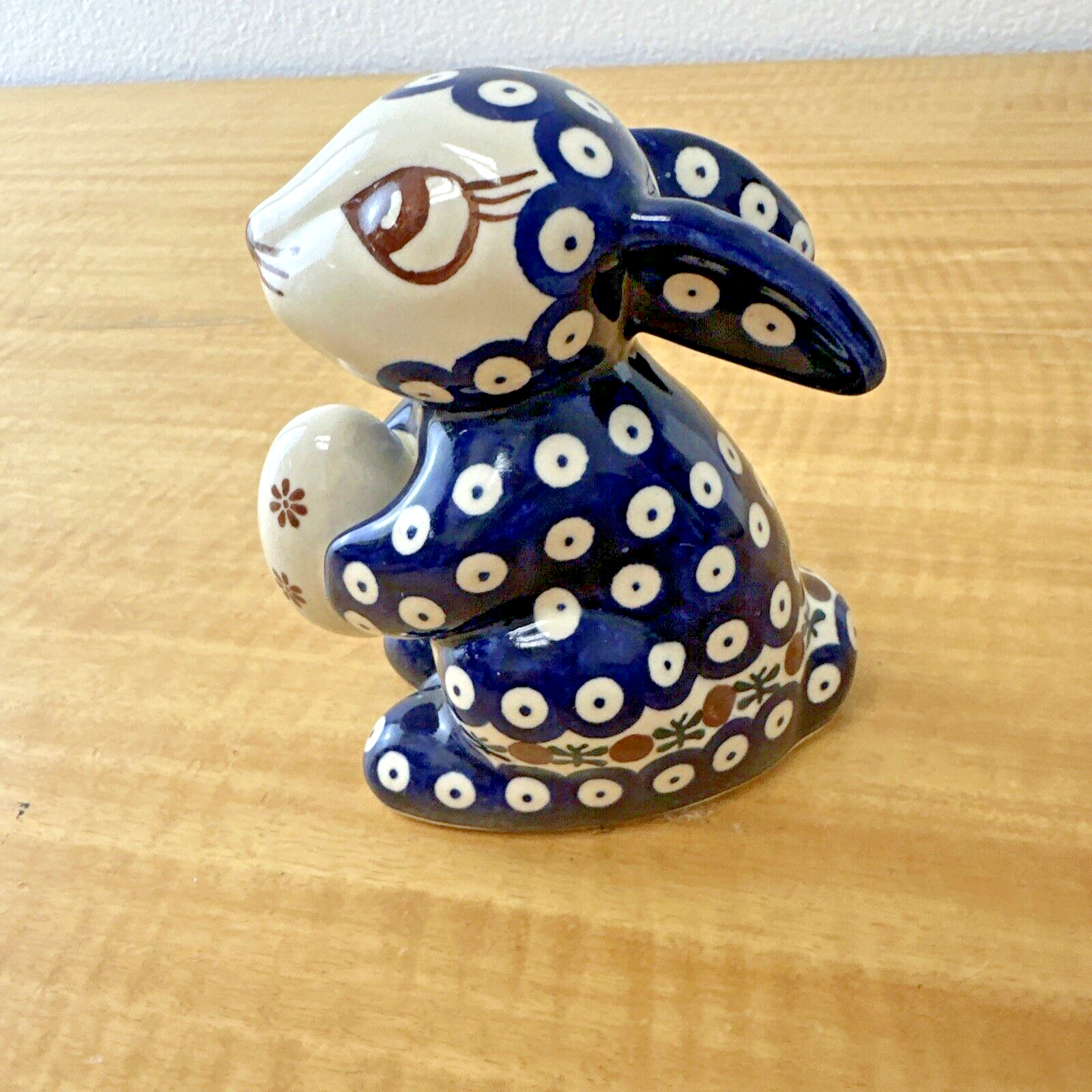 Boleslawiec Polish Pottery Blue Bunny Rabbit W/Easter Egg Peacock Pattern. WIZA
