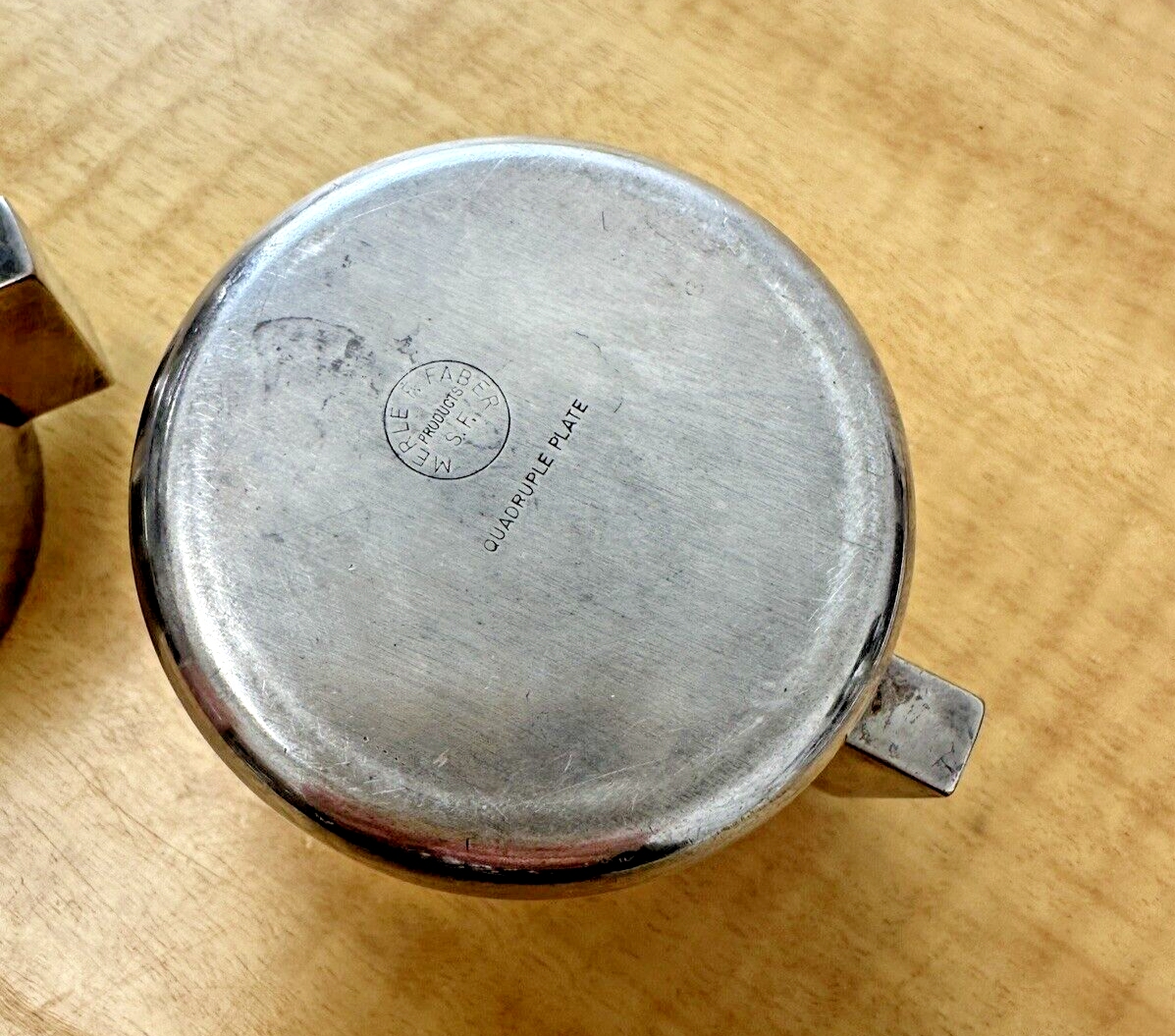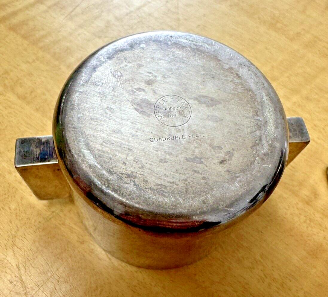 A beautiful art deco creamer and sugar set from Merle F. Faber of San Francisco. Made in the 1930s, this set features quadruple silverplate with very clean, modern lines. One of the few places we have seen this fantastic set is in the Brooklyn Museum - it is certainly not a common line of dinnerware, and in fact these items are very difficult to find. Note: the "Faber" name should not be confused with the popular "Farberware" cookware products.