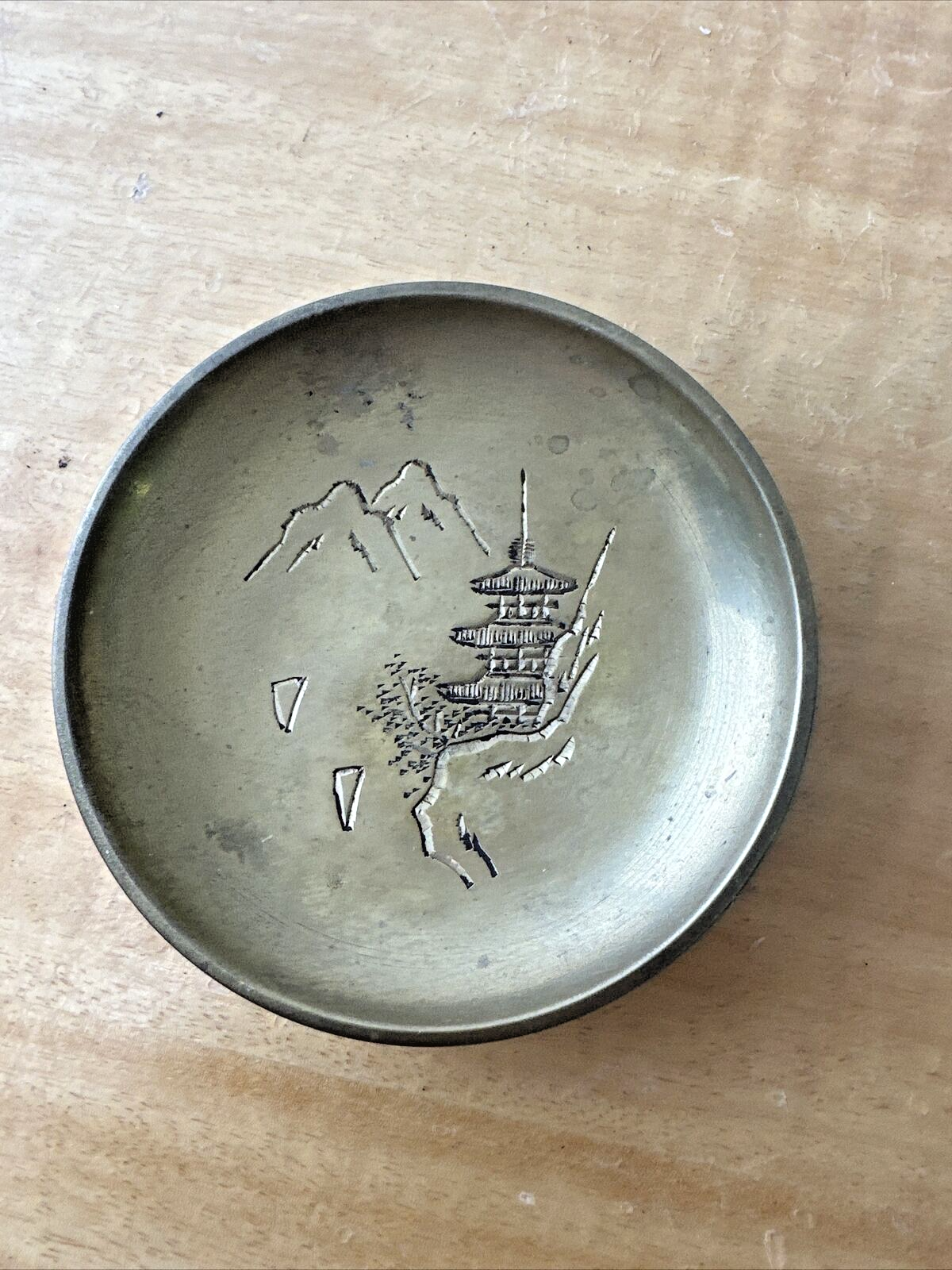 Brass Etched Asian Motif Japanese Countryside Plate Decor 2 3/4" Trinket Dish