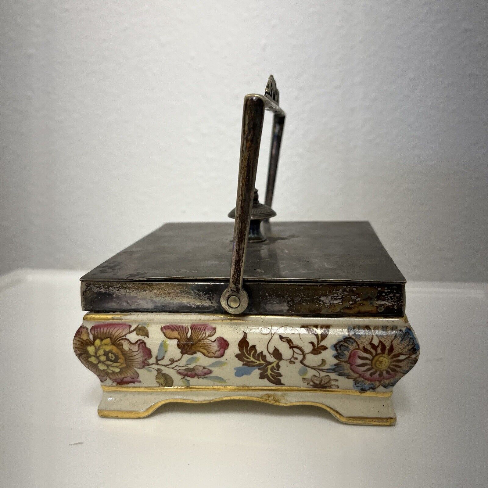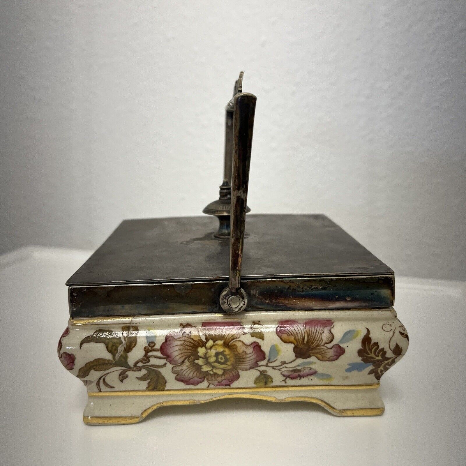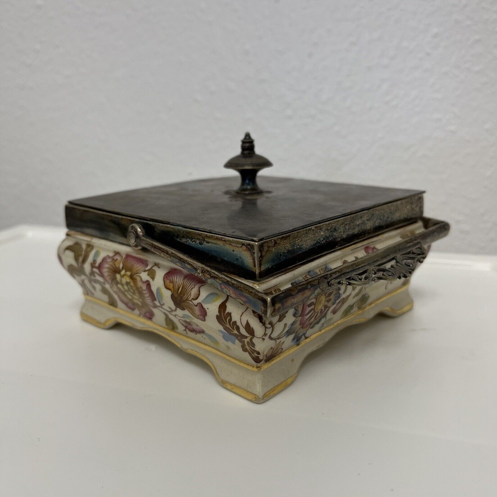 Antique JD & S Trinket Stash Box Floral Ceramic EPGS German Silver Lid w/ Handle